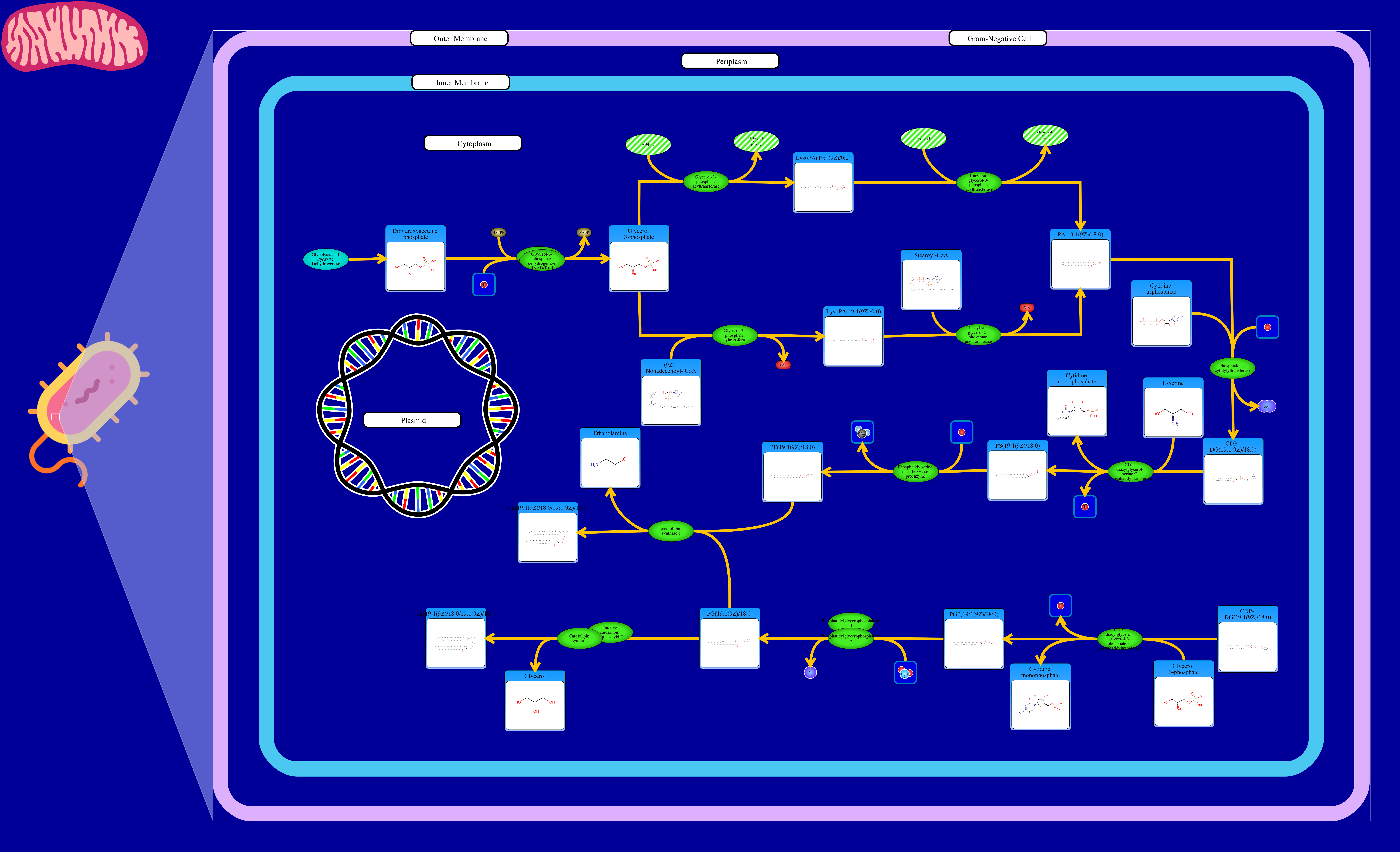 Phospholipids are membrane components in E. coli. The major phospholipids of E. coli are phosphatidylethanolamine, phosphatidylglycerol, and cardiolipin. All phospholipids contain sn-glycerol-3-phosphate esterified with fatty acids at the sn-1 and sn-2 positions. The reaction starts from a glycerone phosphate (dihydroxyacetone phosphate) produced in glycolysis. The glycerone phosphate is transformed into an sn-glycerol 3-phosphate (glycerol 3 phosphate) by NADPH-driven glycerol-3-phosphate dehydrogenase. sn-Glycerol 3-phosphate is transformed to a 1-acyl-sn-glycerol 3-phosphate (lysophosphatidic acid). This can be achieved by an sn-glycerol-3-phosphate acyltransferase that interacts either with a long-chain acyl-CoA or with an acyl-[acp]. The 1-acyl-sn-glycerol 3-phosphate is transformed into a 1,2-diacyl-sn-glycerol 3-phosphate (phosphatidic acid) through a 1-acylglycerol-3-phosphate O-acyltransferase. This compound is then converted into a CPD-diacylglycerol through a CTP phosphatidate cytididyltransferase. CPD-diacylglycerol can be transformed either into an L-1-phosphatidylserine or an L-1-phosphatidylglycerol-phosphate through a phosphatidylserine synthase or a phosphatidylglycerophosphate synthase, respectively. The L-1-phosphatidylserine transforms into L-1-phosphatidylethanolamine through a phosphatidylserine decarboxylase. On the other hand, L-1-phosphatidylglycerol-phosphate gets transformed into an L-1-phosphatidyl-glycerol through a phosphatidylglycerophosphatase. These 2 products combine to produce a cardiolipin and an ethanolamine. The L-1 phosphatidyl-glycerol can also interact with cardiolipin synthase resulting in a glycerol and a cardiolipin.
