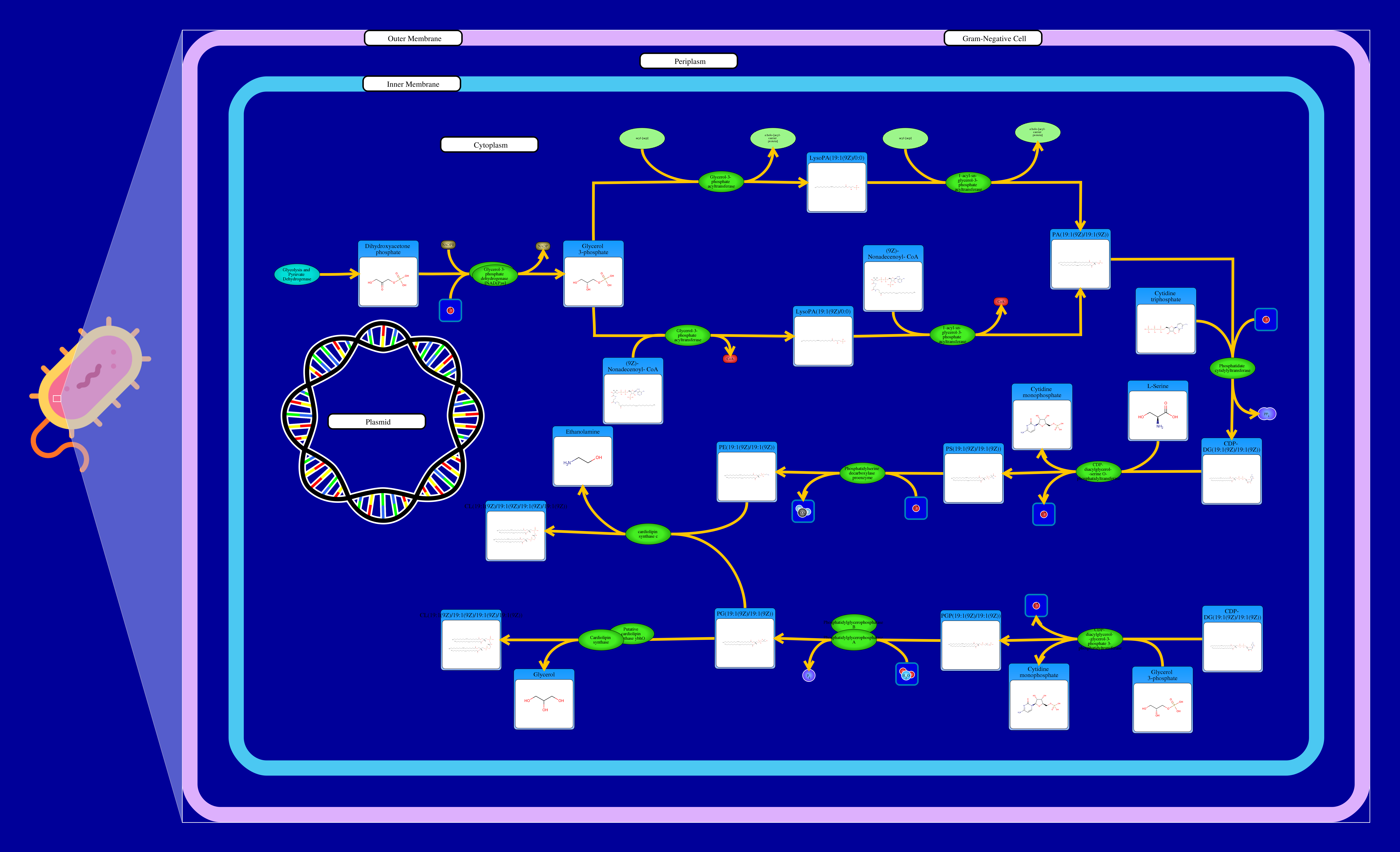 Phospholipids are membrane components in E. coli. The major phospholipids of E. coli are phosphatidylethanolamine, phosphatidylglycerol, and cardiolipin. All phospholipids contain sn-glycerol-3-phosphate esterified with fatty acids at the sn-1 and sn-2 positions. The reaction starts from a glycerone phosphate (dihydroxyacetone phosphate) produced in glycolysis. The glycerone phosphate is transformed into an sn-glycerol 3-phosphate (glycerol 3 phosphate) by NADPH-driven glycerol-3-phosphate dehydrogenase. sn-Glycerol 3-phosphate is transformed to a 1-acyl-sn-glycerol 3-phosphate (lysophosphatidic acid). This can be achieved by an sn-glycerol-3-phosphate acyltransferase that interacts either with a long-chain acyl-CoA or with an acyl-[acp]. The 1-acyl-sn-glycerol 3-phosphate is transformed into a 1,2-diacyl-sn-glycerol 3-phosphate (phosphatidic acid) through a 1-acylglycerol-3-phosphate O-acyltransferase. This compound is then converted into a CPD-diacylglycerol through a CTP phosphatidate cytididyltransferase. CPD-diacylglycerol can be transformed either into an L-1-phosphatidylserine or an L-1-phosphatidylglycerol-phosphate through a phosphatidylserine synthase or a phosphatidylglycerophosphate synthase, respectively. The L-1-phosphatidylserine transforms into L-1-phosphatidylethanolamine through a phosphatidylserine decarboxylase. On the other hand, L-1-phosphatidylglycerol-phosphate gets transformed into an L-1-phosphatidyl-glycerol through a phosphatidylglycerophosphatase. These 2 products combine to produce a cardiolipin and an ethanolamine. The L-1 phosphatidyl-glycerol can also interact with cardiolipin synthase resulting in a glycerol and a cardiolipin.
