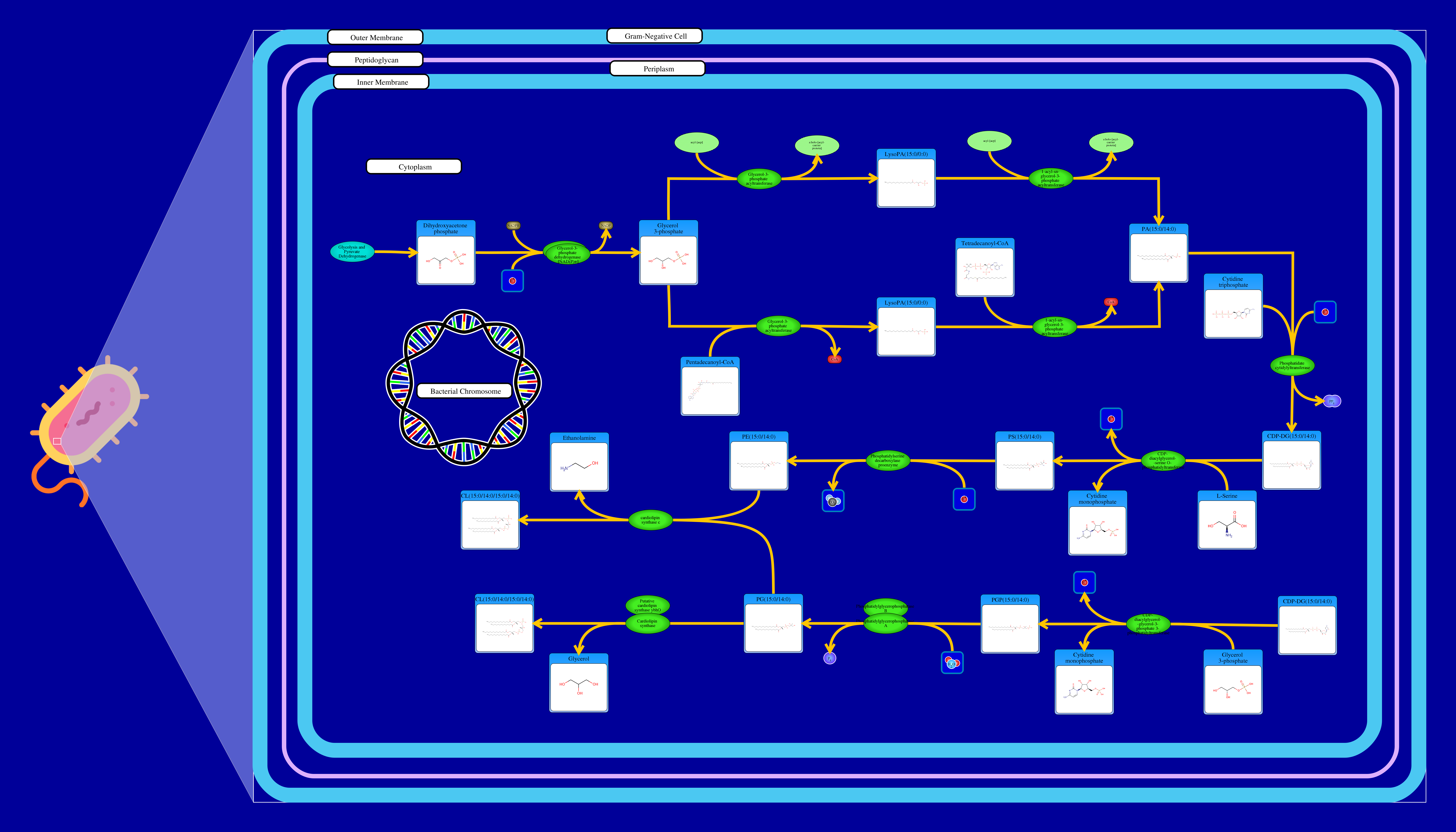 Phospholipids are membrane components in E. coli. The major phospholipids of E. coli are phosphatidylethanolamine, phosphatidylglycerol, and cardiolipin. All phospholipids contain sn-glycerol-3-phosphate esterified with fatty acids at the sn-1 and sn-2 positions. The reaction starts from a glycerone phosphate (dihydroxyacetone phosphate) produced in glycolysis. The glycerone phosphate is transformed into an sn-glycerol 3-phosphate (glycerol 3 phosphate) by NADPH-driven glycerol-3-phosphate dehydrogenase. sn-Glycerol 3-phosphate is transformed to a 1-acyl-sn-glycerol 3-phosphate (lysophosphatidic acid). This can be achieved by an sn-glycerol-3-phosphate acyltransferase that interacts either with a long-chain acyl-CoA or with an acyl-[acp]. The 1-acyl-sn-glycerol 3-phosphate is transformed into a 1,2-diacyl-sn-glycerol 3-phosphate (phosphatidic acid) through a 1-acylglycerol-3-phosphate O-acyltransferase. This compound is then converted into a CPD-diacylglycerol through a CTP phosphatidate cytididyltransferase. CPD-diacylglycerol can be transformed either into an L-1-phosphatidylserine or an L-1-phosphatidylglycerol-phosphate through a phosphatidylserine synthase or a phosphatidylglycerophosphate synthase, respectively. The L-1-phosphatidylserine transforms into L-1-phosphatidylethanolamine through a phosphatidylserine decarboxylase. On the other hand, L-1-phosphatidylglycerol-phosphate gets transformed into an L-1-phosphatidyl-glycerol through a phosphatidylglycerophosphatase. These 2 products combine to produce a cardiolipin and an ethanolamine. The L-1 phosphatidyl-glycerol can also interact with cardiolipin synthase resulting in a glycerol and a cardiolipin.