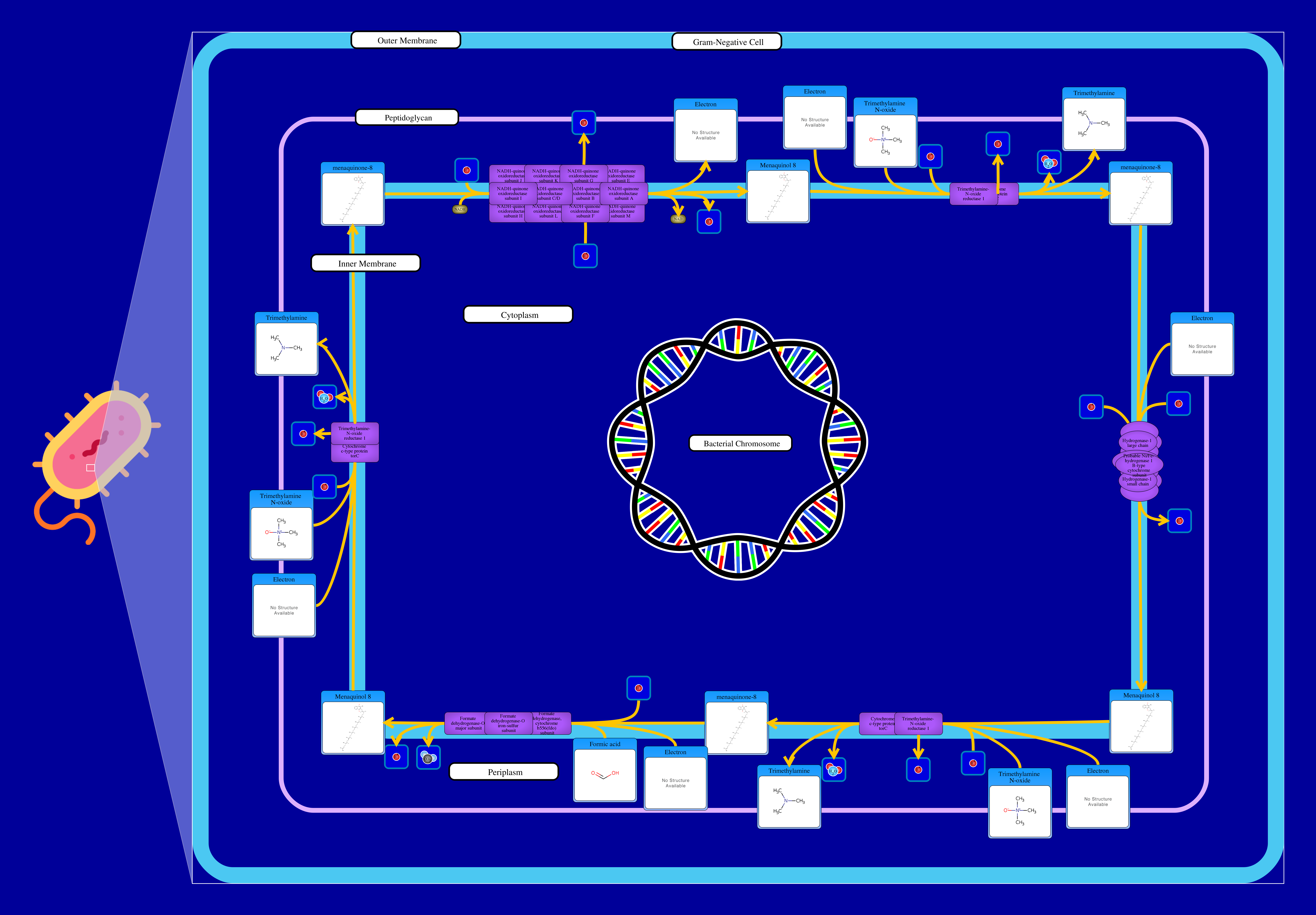 The pathway can start in various spots. First step in this case starts with NADH interacting with a menaquinone oxidoreductase resulting in the release of a NADH and a hydrogen Ion, at the same time in the inner membrane a menaquinone interacts with 2 electrons and 2 hydrogen ions thus releasing a menaquinol. This allows for 4 hydrogen ions to be transferred from the cytosol to the periplasmic space. The menaquinol then interacts with a trimethylamine N-oxide reductase resulting in the release of 2 hydrogen ion and 2 electrons. At the same time trimethylamine N-oxide and 3 hydrogen ions interact with the enzyme trimethylamine N-oxide reductase resulting in the release of a trimethylamine and a water molecule, this reaction happening in the periplasmic space.