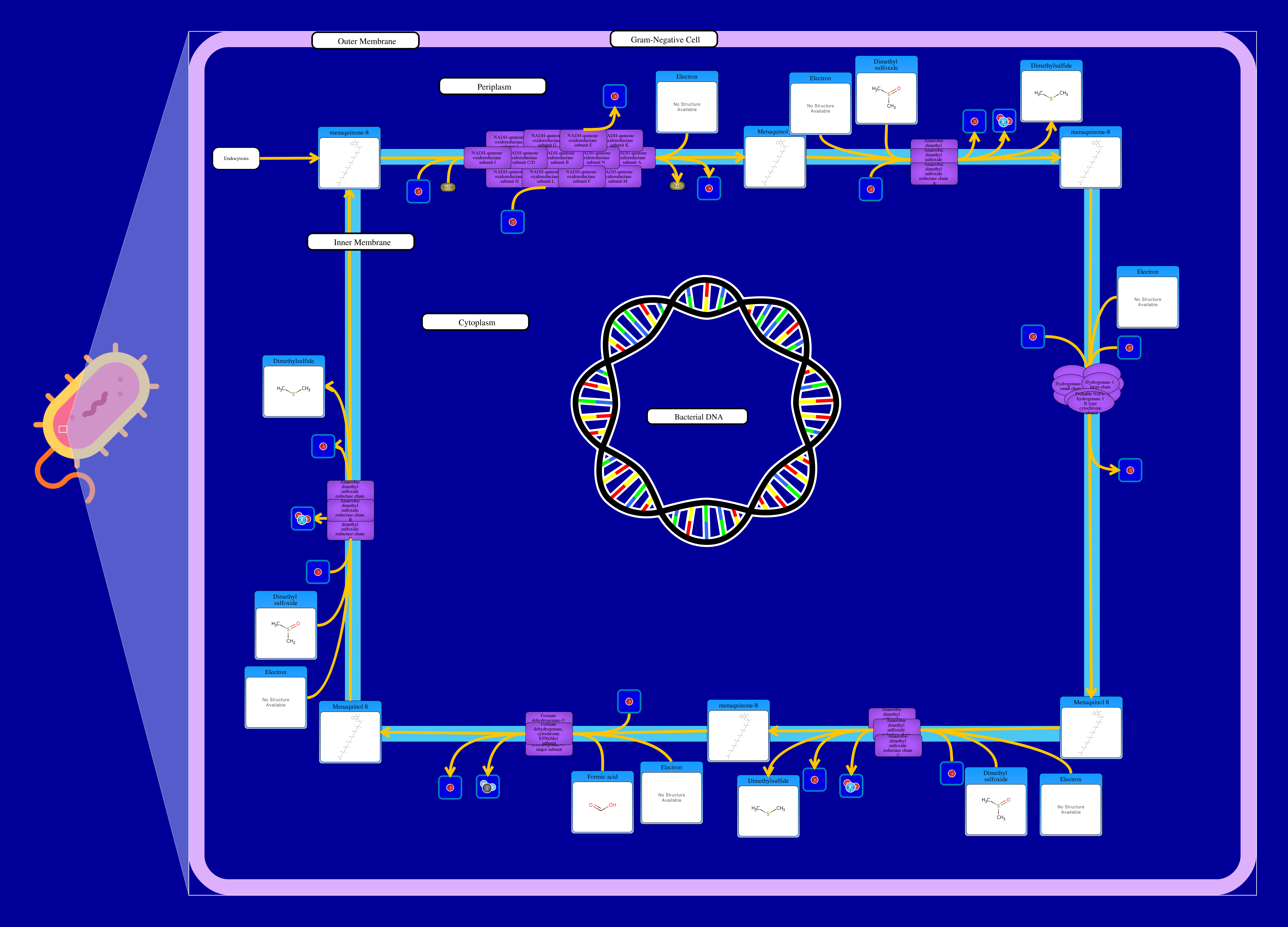The pathway can start in various spots. First step in this case starts with NADH interacting with a menaquinone oxidoreductase resulting in the release of a NADH and a hydrogen Ion, at the same time in the inner membrane a menaquinone interacts with 2 electrons and 2 hydrogen ions thus releasing a menaquinol. This allows for 4 hydrogen ions to be transferred from the cytosol to the periplasmic space. The menaquinol then interacts with a dimethyl sulfoxide reductase resulting in the release of 2 hydrogen ion and 2 electrons. At the same time dimethyl sulfoxide and 2 hydrogen ions interact with the enzyme resulting in the release of a dimethyl sulfide and a water molecule, this reaction happening in the periplasmic space.