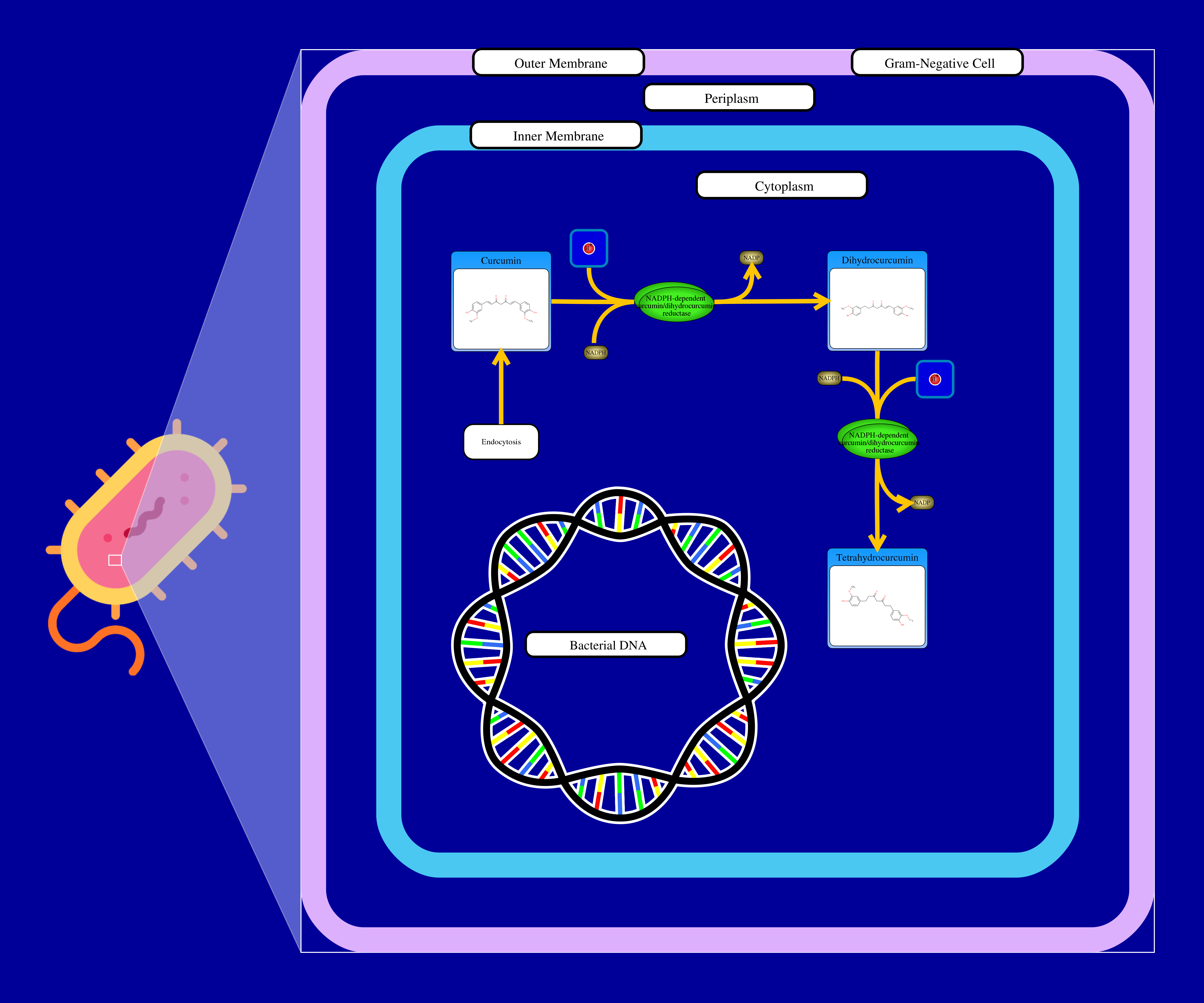 Curcumin is metabolized by being reduced through a NADPH dependent curcumin reductase resulting in a dihydrocurcumin. This compound is then reduced again through a NADPH-dependent dihydrocurcumin reductase resulting in a tetrahydrocurcumin. It is not know yet how this compound enters E.coli