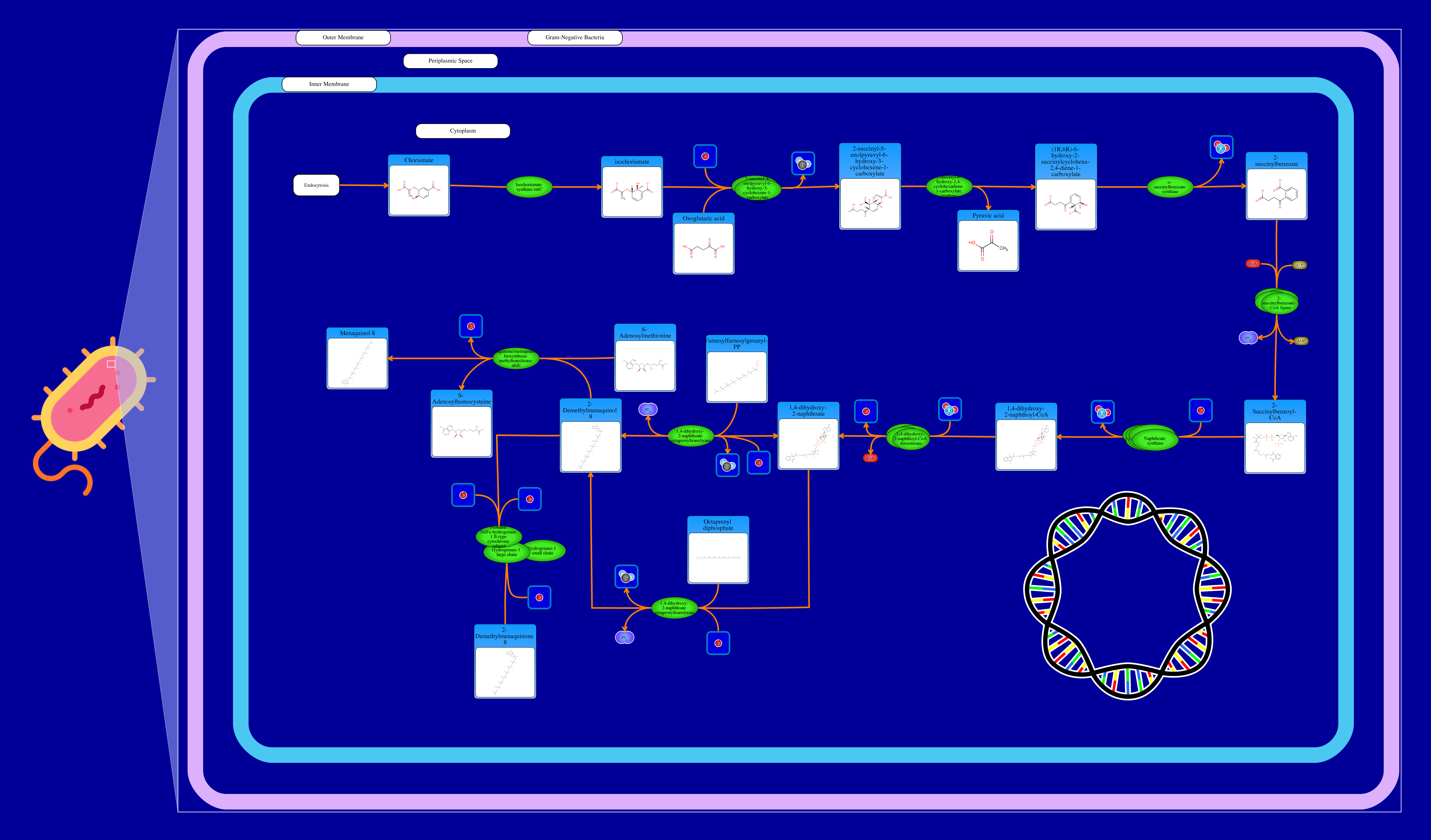 Menaquinol biosynthesis starts with chorismate being metabolized into isochorismate through a isochorismate synthase. Isochorismate then interacts with 2-oxoglutare and a hydrogen ion through a 2-succinyl-5-enolpyruvyl-6-hydroxy-3-cyclohexene-1-carboxylate synthase resulting in the release of a carbon dioxide and a 2-succinyl-5-enolpyruvyl-6-hydroxy-3-cyclohexene-1-carboxylate. The latter compound then interacts with (1R,6R)-2-succinyl-6-hydroxy-2,4-cyclohexadiene-1-carboxylate synthase resulting in the release of a pyruvate and a (1R,6R)-6-hydroxy-2-succinylcyclohexa-2,4-diene-1-carboxylate. This compound is the dehydrated through a o-succinylbenzoate synthase resulting in the release of a water molecule and a 2-succinylbenzoate. This compound then interacts with a coenzyme A and an ATP through a o-succinylbenzoate CoA ligase resulting in the release of a diphosphate, a AMP and a succinylbenzoyl-CoA. The latter compound interacts with a hydrogen ion through a 1,4-dihydroxy-2-naphthoyl-CoA synthase resulting in the release of a water molecule or a 1,4-dihydroxy-2-naphthoyl-CoA. This compound then interacts with water through a 1,4-dihydroxy-2-naphthoyl-CoA thioesterase resulting in the release of a coenzyme A, a hydrogen ion and a 1,4-dihydroxy-2-naphthoate.