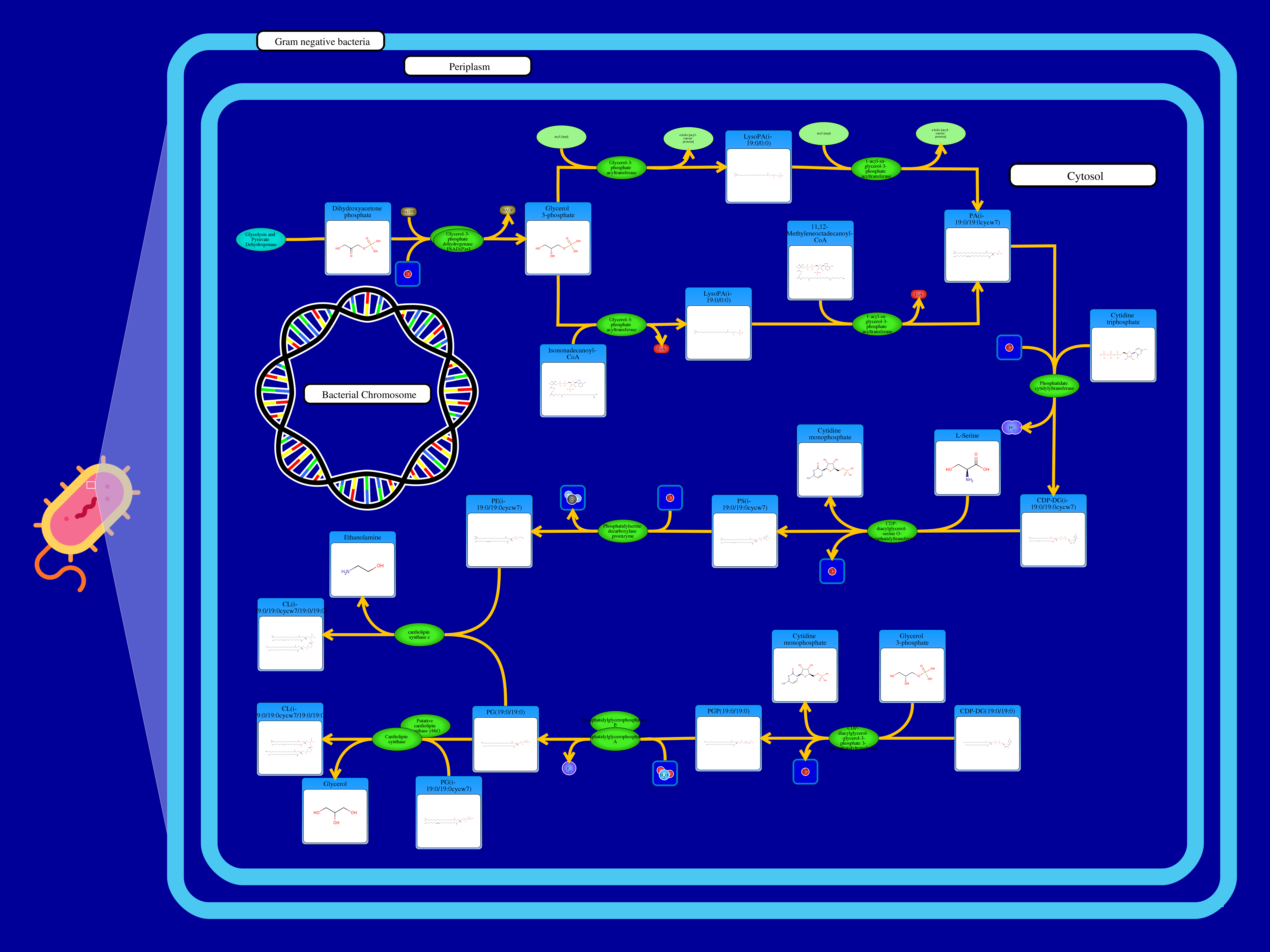 Phospholipids are membrane components in E. coli. The major phospholipids of E. coli are phosphatidylethanolamine, phosphatidylglycerol, and cardiolipin. All phospholipids contain sn-glycerol-3-phosphate esterified with fatty acids at the sn-1 and sn-2 positions. The reaction starts from a glycerone phosphate (dihydroxyacetone phosphate) produced in glycolysis. The glycerone phosphate is transformed into an sn-glycerol 3-phosphate (glycerol 3 phosphate) by NADPH-driven glycerol-3-phosphate dehydrogenase. sn-Glycerol 3-phosphate is transformed to a 1-acyl-sn-glycerol 3-phosphate (lysophosphatidic acid). This can be achieved by an sn-glycerol-3-phosphate acyltransferase that interacts either with a long-chain acyl-CoA or with an acyl-[acp]. The 1-acyl-sn-glycerol 3-phosphate is transformed into a 1,2-diacyl-sn-glycerol 3-phosphate (phosphatidic acid) through a 1-acylglycerol-3-phosphate O-acyltransferase. This compound is then converted into a CPD-diacylglycerol through a CTP phosphatidate cytididyltransferase. CPD-diacylglycerol can be transformed either into an L-1-phosphatidylserine or an L-1-phosphatidylglycerol-phosphate through a phosphatidylserine synthase or a phosphatidylglycerophosphate synthase, respectively. The L-1-phosphatidylserine transforms into L-1-phosphatidylethanolamine through a phosphatidylserine decarboxylase. On the other hand, L-1-phosphatidylglycerol-phosphate gets transformed into an L-1-phosphatidyl-glycerol through a phosphatidylglycerophosphatase. These 2 products combine to produce a cardiolipin and an ethanolamine. The L-1 phosphatidyl-glycerol can also interact with cardiolipin synthase resulting in a glycerol and a cardiolipin.