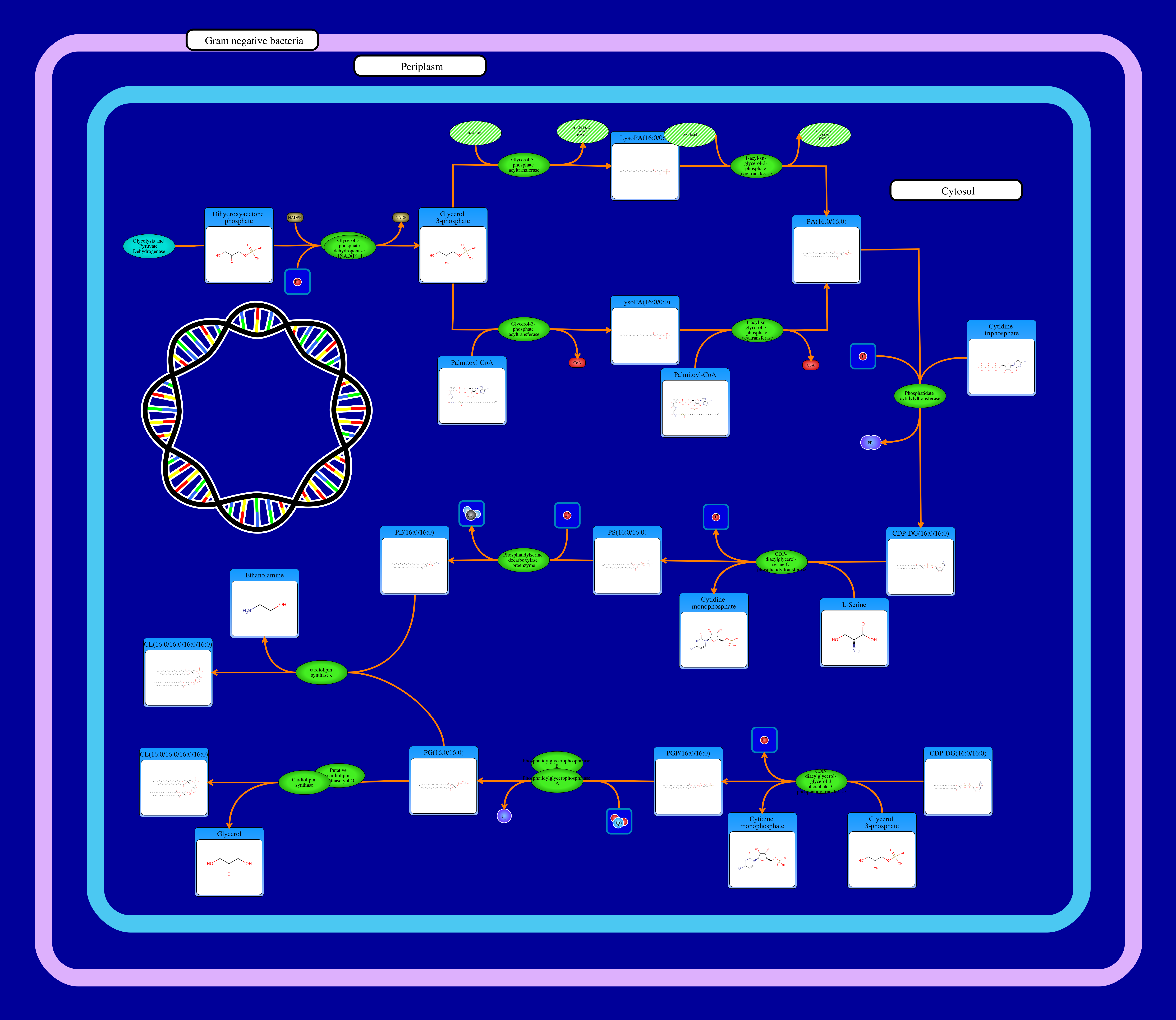 Phospholipids are membrane components in E. coli. The major phospholipids of E. coli are phosphatidylethanolamine, phosphatidylglycerol, and cardiolipin. All phospholipids contain sn-glycerol-3-phosphate esterified with fatty acids at the sn-1 and sn-2 positions. The reaction starts from a glycerone phosphate (dihydroxyacetone phosphate) produced in glycolysis. The glycerone phosphate is transformed into an sn-glycerol 3-phosphate (glycerol 3 phosphate) by NADPH-driven glycerol-3-phosphate dehydrogenase. sn-Glycerol 3-phosphate is transformed to a 1-acyl-sn-glycerol 3-phosphate (lysophosphatidic acid). This can be achieved by an sn-glycerol-3-phosphate acyltransferase that interacts either with a long-chain acyl-CoA or with an acyl-[acp]. The 1-acyl-sn-glycerol 3-phosphate is transformed into a 1,2-diacyl-sn-glycerol 3-phosphate (phosphatidic acid) through a 1-acylglycerol-3-phosphate O-acyltransferase. This compound is then converted into a CPD-diacylglycerol through a CTP phosphatidate cytididyltransferase. CPD-diacylglycerol can be transformed either into an L-1-phosphatidylserine or an L-1-phosphatidylglycerol-phosphate through a phosphatidylserine synthase or a phosphatidylglycerophosphate synthase, respectively. The L-1-phosphatidylserine transforms into L-1-phosphatidylethanolamine through a phosphatidylserine decarboxylase. On the other hand, L-1-phosphatidylglycerol-phosphate gets transformed into an L-1-phosphatidyl-glycerol through a phosphatidylglycerophosphatase. These 2 products combine to produce a cardiolipin and an ethanolamine. The L-1 phosphatidyl-glycerol can also interact with cardiolipin synthase resulting in a glycerol and a cardiolipin.