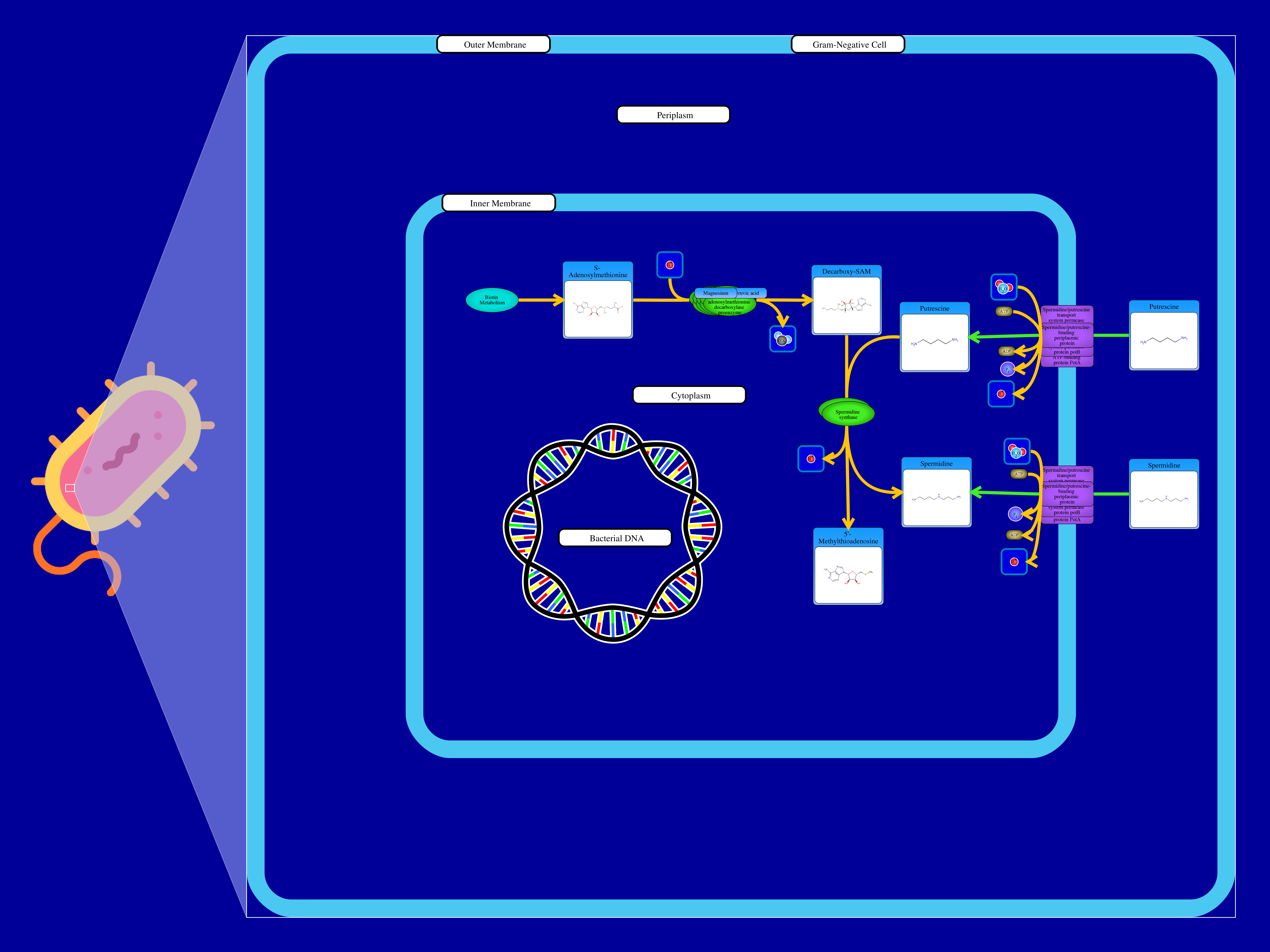Spermidine is formed from decarboxy-SAM and putrescine by catalyzing spermidine synthase (also knowns as polyamine aminopropyltransferase). The source of putrescine is transported from outside of cell by putrescine/spermidine ABC transporter. Decarboxy-SAM comes from S-Adenosylmethionine with catalyzation of adenosylmethionine decarboxylase and cofactors: pyruvic acid and magnesium. The other product of the aminopropyltransferase reaction is S-methyl-5'-thioadenosine (MTA), which can be recycled back to L-methionine in many organisms, but not in E. coli. Inhibition of E. coli adenosylmethionine decarboxylase by spermidine appears to be the most significant regulator of polyamine biosynthesis, probably limiting it when the intracellular spermidine concentration becomes excessive. In E. coli most intracellular spermidine is bound to nucleic acids and phospholipids. (EcoCyc)