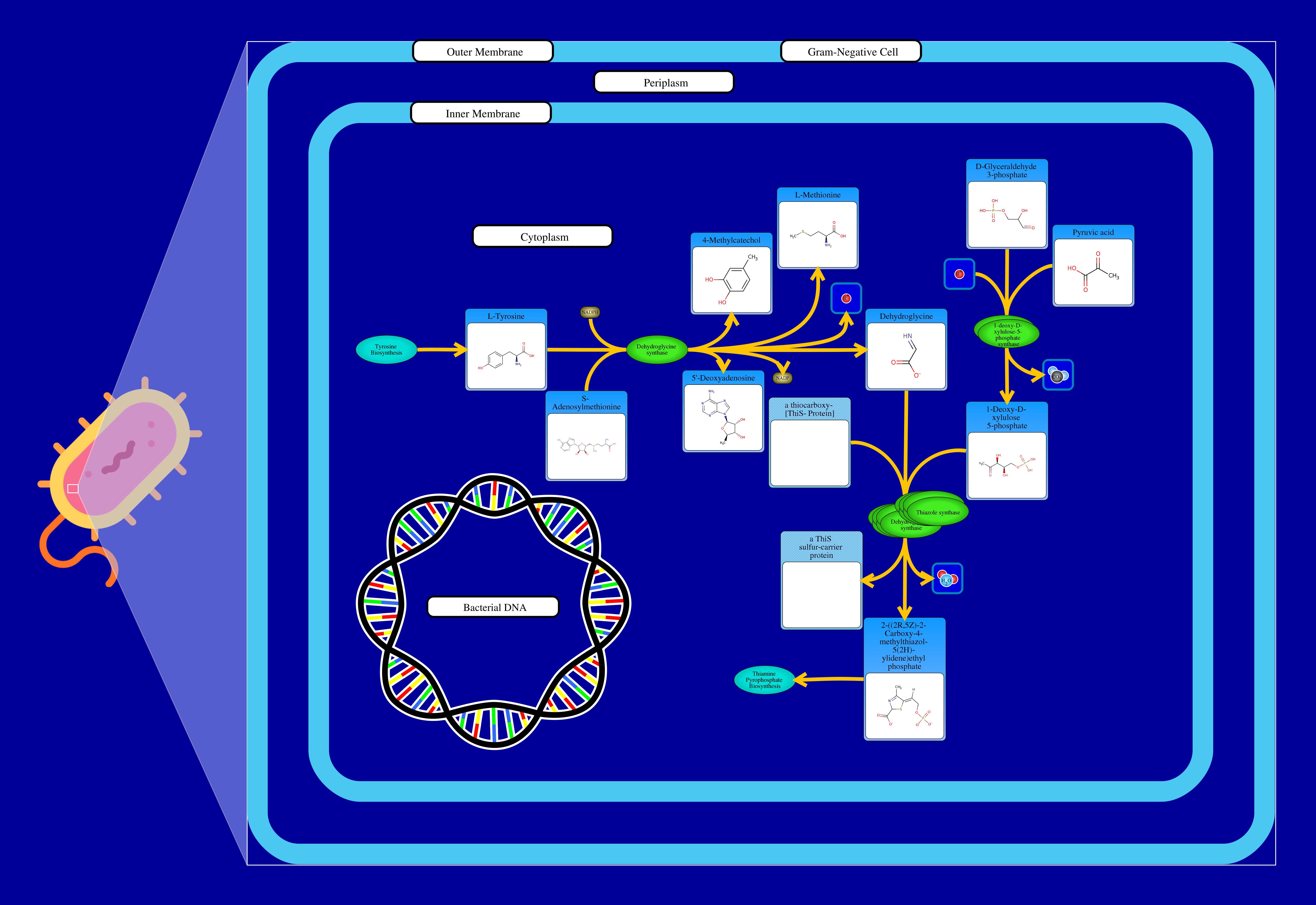 This pathway demonstrate the biosynthesis of thiazole moiety in E.coli K-12 strain and Salmonella enterica serovar Typhimurium. L-Tyrosine is generated from tyrosine biosynthesis. With S-Adenosylmethionine and NADPH, L-Tyrosine can be catalyzed into four different small molecules: 4-methylcatechol, dehydroglycine, 5'-deoxyadenosine and L-methionine as well as NADP by dehydroglycine synthase (encoded by thiH gene). Meanwhile, 1-deoxyxylulose-5-phosphate synthase (encoded by dxs gene) catalyzes pyruvic acid and D-Glyceraldehyde 3-phosphate into 1-Deoxy-D-xylulose 5-phosphate. The final reaction of the pathway is facilitated by thiazole synthase (encoded by thiG and thiH), which require a thiocarboxy-[ThiS-Protein], 1-deoxy-D-xylulose 5-phosphate and 2-iminoacetate to form 2-((2R,5Z)-2-Carboxy-4-methylthiazol-5(2H)-ylidene)ethyl phosphate for Thiamin Diphosphate Biosynthesis, as well as a ThiS sulfur-carrier protein and water.