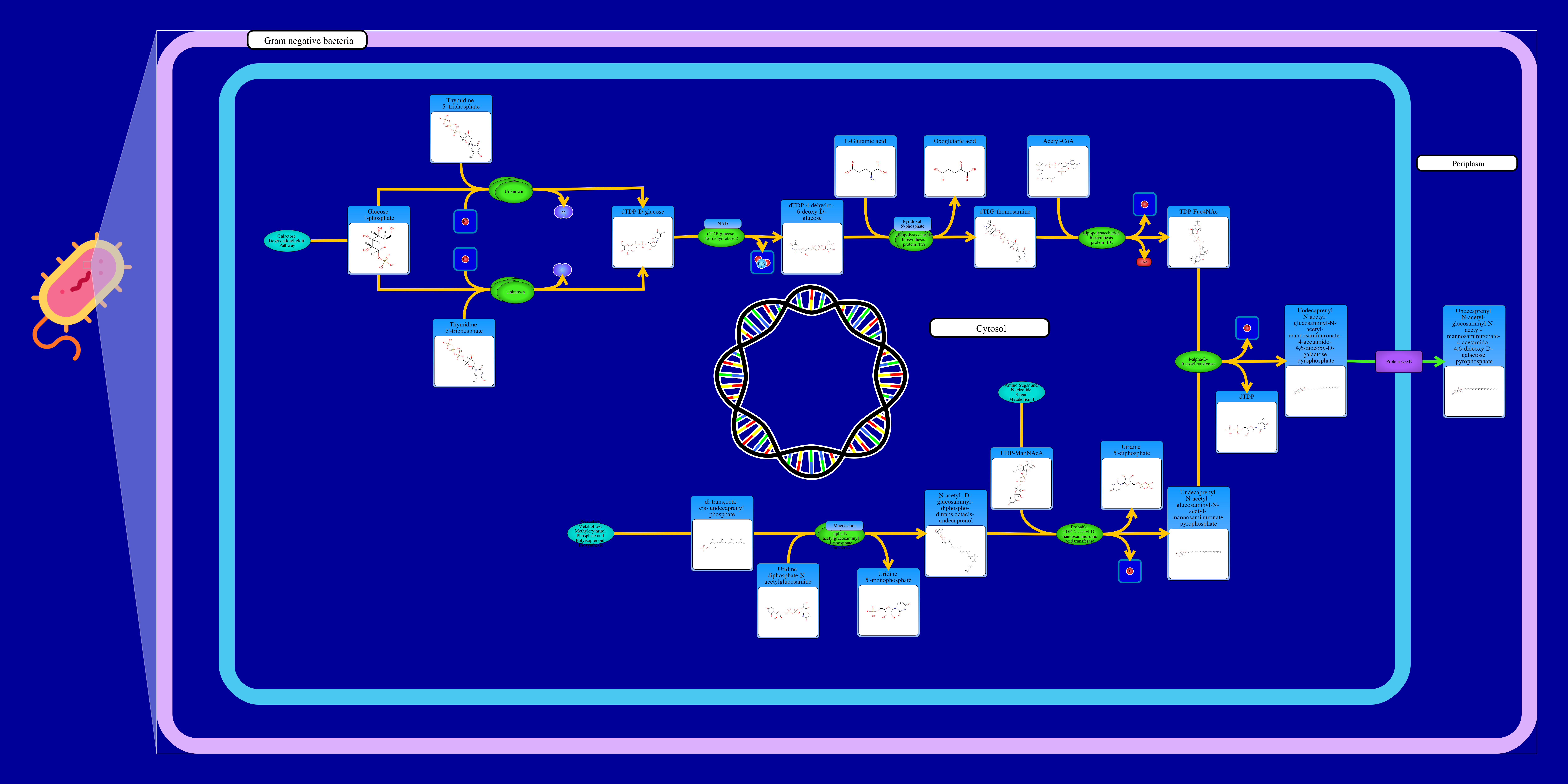 The biosynthesis of a enterobacterial common antigen can begin with a di-trans,octa-cis-undecaprenyl phosphate interacts with a Uridine diphosphate-N-acetylglucosamine through undecaprenyl-phosphate α-N-acetylglucosaminyl transferase resulting in a N-acetyl-α-D-glucosaminyl-diphospho-ditrans,octacis-undecaprenol and a Uridine 5'-monophosphate. The N-acetyl-α-D-glucosaminyl-diphospho-ditrans,octacis-undecaprenol then reacts with an UDP-ManNAcA from the Amino sugar and nucleotide sugar metabolism pathway. This reaction is metabolized by a UDP-N-acetyl-D-mannosaminuronic acid transferase resulting in a uridine 5' diphosphate, a hydrogen ion and a Undecaprenyl N-acetyl-glucosaminyl-N-acetyl-mannosaminuronate-4-acetamido-4,6-dideoxy-D-galactose pyrophosphate. Glucose 1 phosphate can be metabolize by interacting with a hydrogen ion and a thymidine 5-triphosphate by either reacting with a dTDP-glucose pyrophosphorylase or a dTDP-glucose pyrophosphorylase 2 resulting in the release of a pyrophosphate and a dTDP-D-glucose. The latter compound is then dehydrated through an dTDP-glucose 4,6-dehydratase 2 resulting in water and dTDP-4-dehydro-6-deoxy-D-glucose. The latter compound interacts with L-glutamic acid through a dTDP-4-dehydro-6-deoxy-D-glucose transaminase resulting in the release of oxoglutaric acid and dTDP-thomosamine. The latter compound interacts with acetyl-coa through a dTDP-fucosamine acetyltransferase resulting in a Coenzyme A, a hydrogen Ion and a TDP-Fuc4NAc. Undecaprenyl N-acetyl-glucosaminyl-N-acetyl-mannosaminuronate-4-acetamido-4,6-dideoxy-D-galactose pyrophosphate then interacts with a TDP--Fuc4NAc through a 4-acetamido-4,6-dideoxy-D-galactose transferase resulting in a hydrogen ion, a dTDP and a Undecaprenyl N-acetyl-glucosaminyl-N-acetyl-mannosaminuronate-4-acetamido-4,6-dideoxy-D-galactose pyrophosphate. This compound is then transported through a protein wzxE into the periplasmic space so that it can be incorporated into the outer membrane.