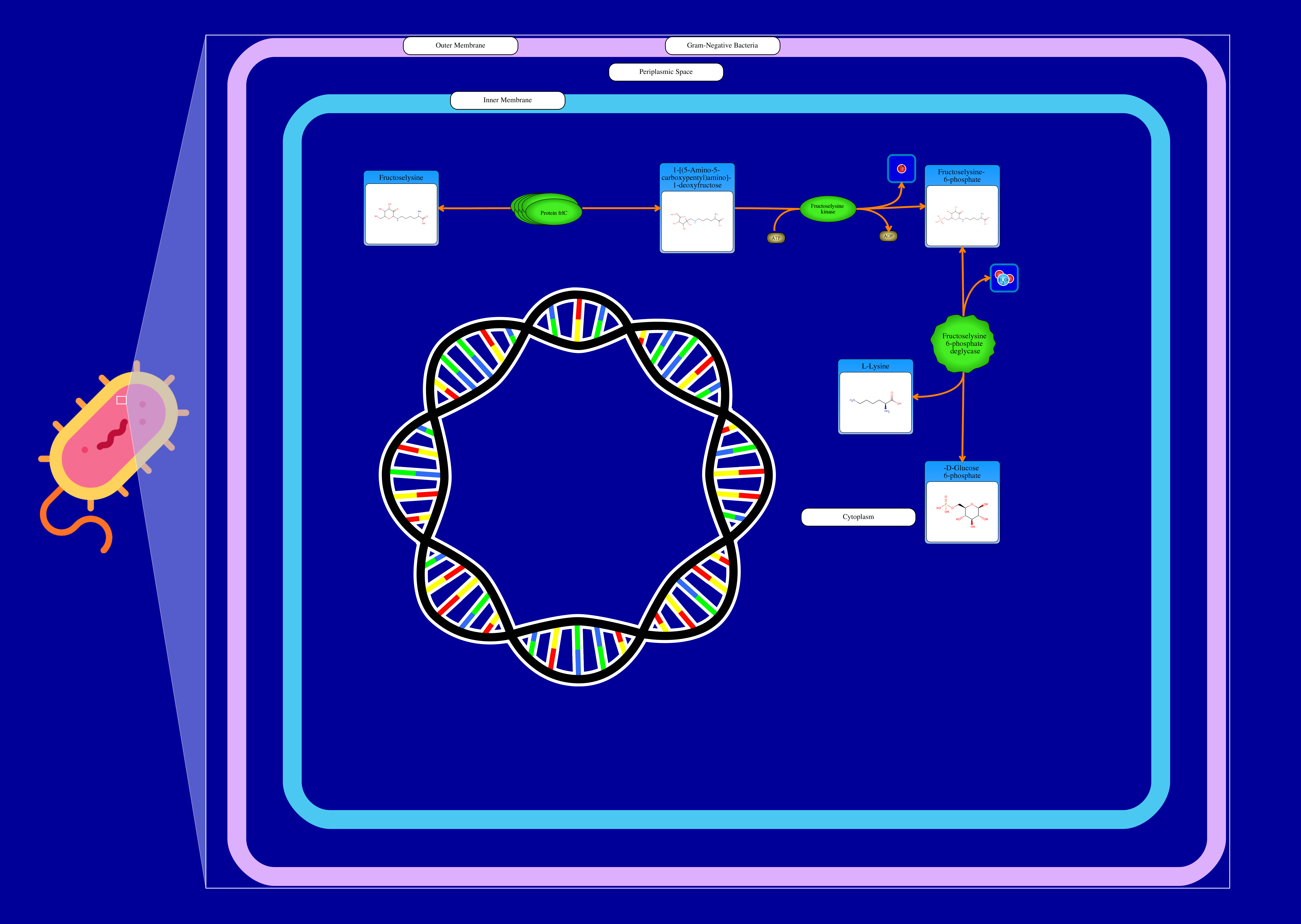 Fructosamines are compounds that result from glycation reactions between a sugar and a primary amine, followed by isomerization via the Amadori rearrangement. In fructoselysine degradation, fructoselysine firstly converts to 1-[(5-Amino-5-carboxypentyl)amino]-1-deoxyfructose by protein frlC, and then 1-[(5-Amino-5-carboxypentyl)amino]-1-deoxyfructose is transformed to fructoselysine-6-phosphate by fructoselysine kinase which is powered by ATP. Fructoselysine-6-phosphate finally degrades to β-D-Glucose 6-phosphate and L-lysine by fructoselysine 6-phosphate deglycase.