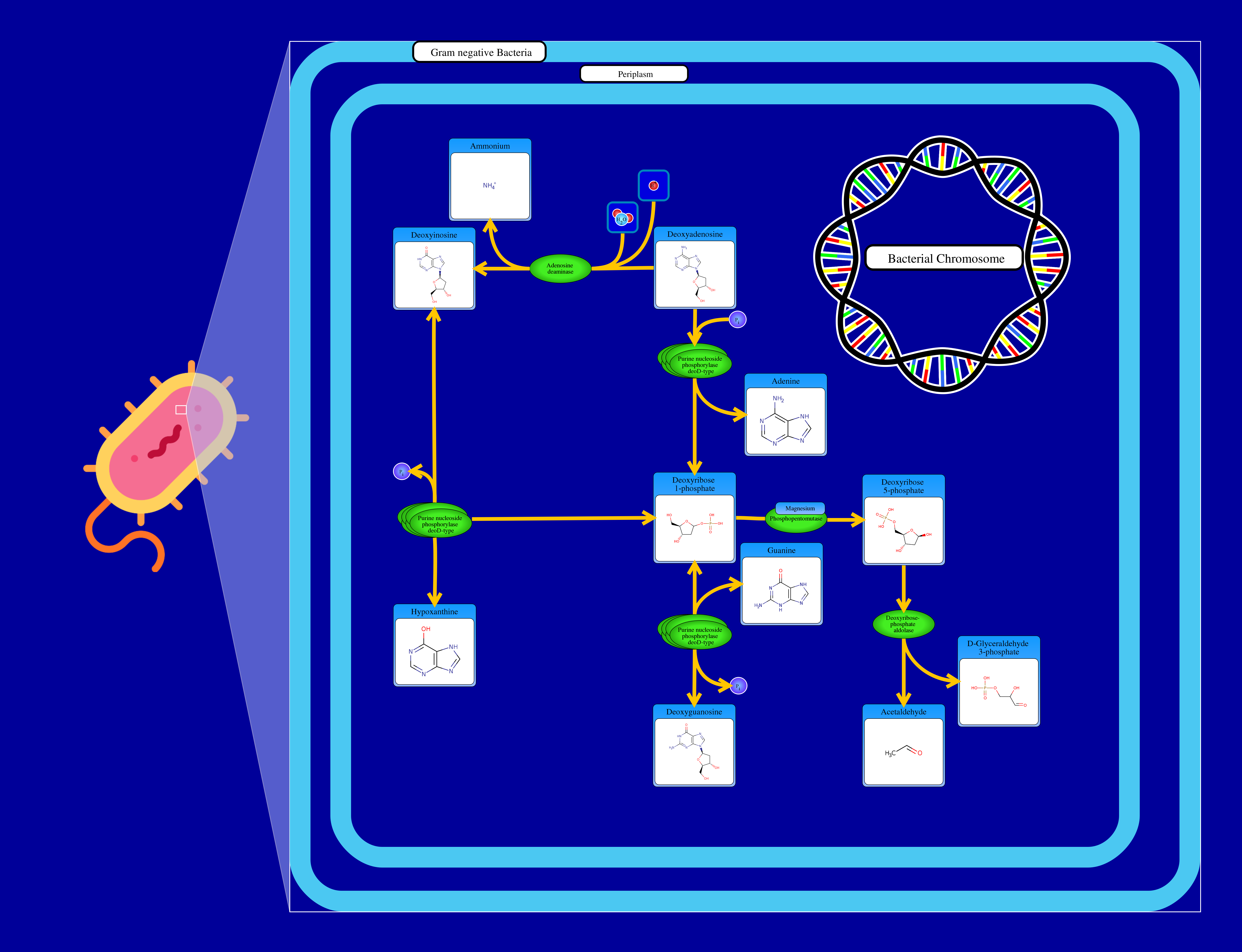 The purine deoxyribonucleosides degradation starts with deoxyadenosine reacting with a water molecule and a hydrogen in through a deoxyadenosune deaminase resulting in the release of ammonium and a deoxyinosine. Deoxyinosine reacts in a reversible manner with phosphate through a deoxyinosine phosphorylase resulting in the release of a hypoxanthine and a 2-deoxy-alpha-D-ribose-1-phosphate.