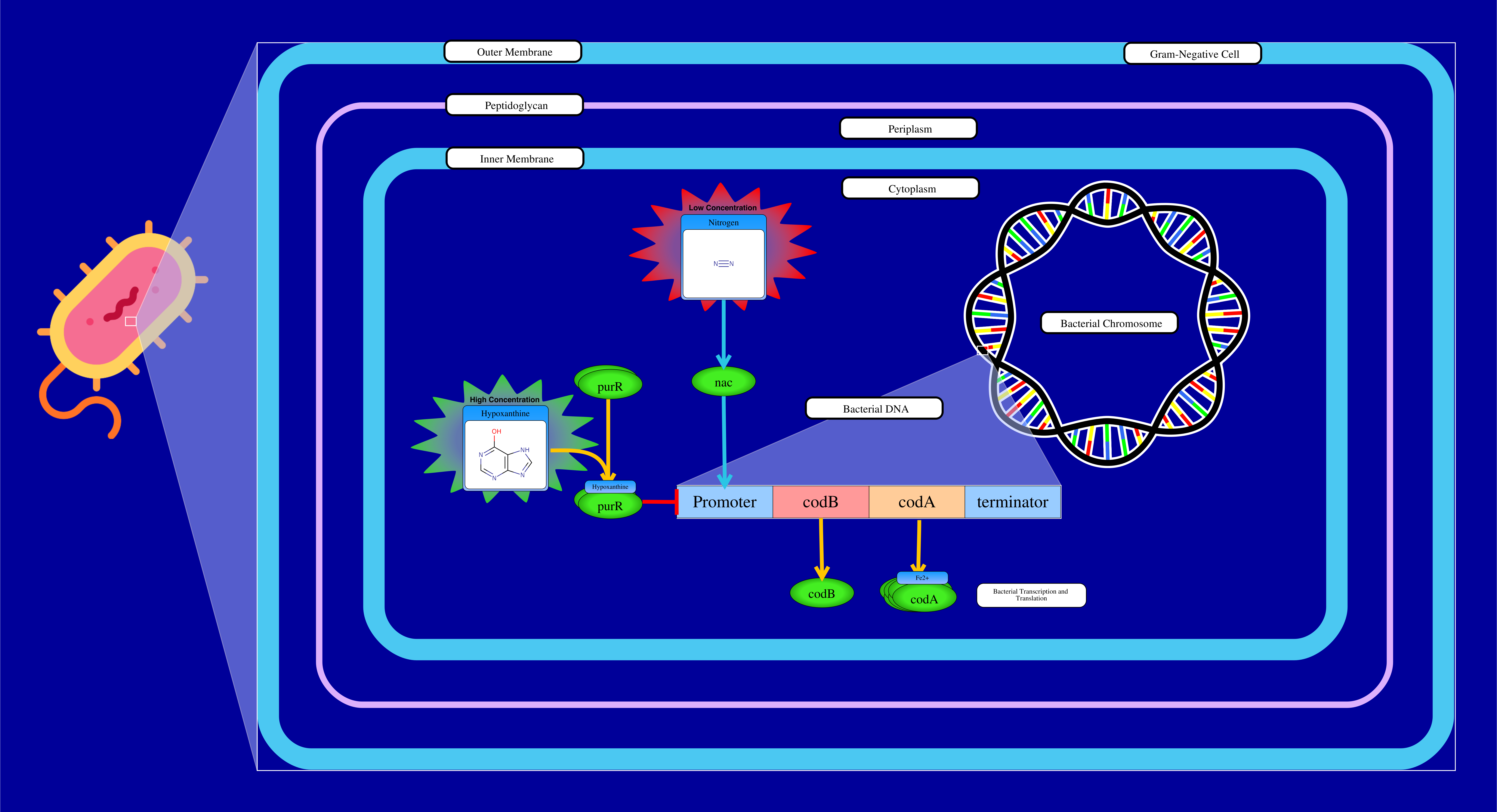 The codBA operon in E. coli contains two genes which encode proteins involved in cytosine entry into the cell, as well as its deamination. The operon can be activated by the bining of nitrogen assimilation regulatory protein Nac, which activates transcription at the promoter in the case of low nitrogen levels in the cell. With this operon activated, cytosine can be broken down into the nitrogen source, and can even be the sole nitrogen source if necessary. The operon can also be deactivated by the binding of the PurR transcriptional repressor to the promoter. This repressor is activated by a purine such as guanine, or its derivatives such as hypoxanthine.