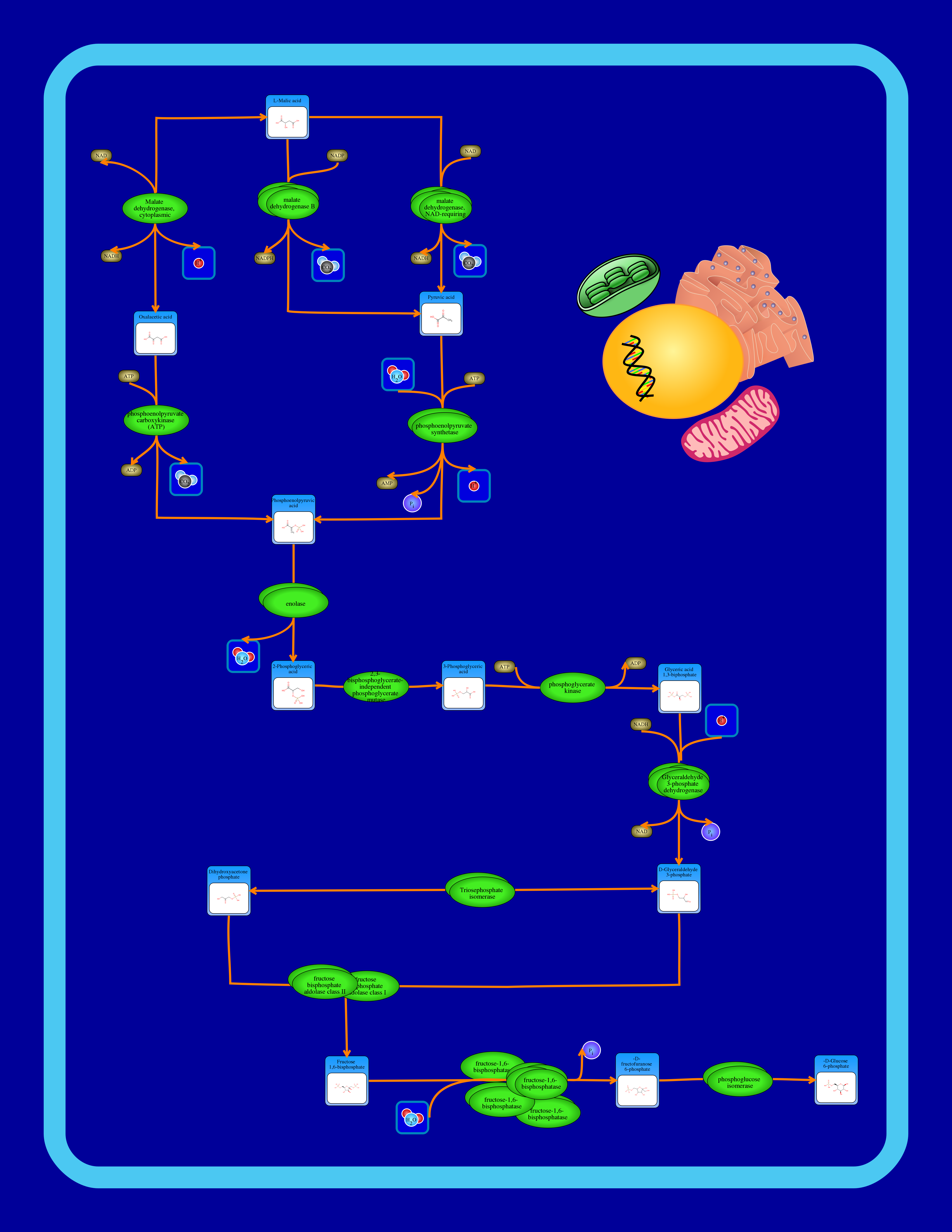 L-malic acid is metabolized through 3 possible ways: NAD driven malate dehydrogenase resulting in oxalacetic acid, NADP driven malate dehydrogenase B resulting pyruvic acid or malate dehydrogenase, NAD-requiring resulting in pyruvic acid. Oxalacetic acid is processed by phosphoenolpyruvate carboxykinase (ATP driven) while pyruvic acid is processed by phosphoenolpyruvate synthetase resulting in phosphoenolpyruvic acid. This compound is dehydrated by enolase resulting in an 2-phosphoglyceric acid. This compound is then isomerized by 2,3-bisphosphoglycerate-independent phosphoglycerate mutase resulting in a 3-phosphoglyceric acid which is phosphorylated by an ATP driven phosphoglycerate kinase resulting in an glyceric acid 1,3-biphosphate. This compound undergoes an NADH driven glyceraldehyde 3-phosphate dehydrogenase reaction resulting in a D-Glyceraldehyde 3-phosphate which is first isomerized into dihydroxyacetone phosphate through an triosephosphate isomerase. D-glyceraldehyde 3-phosphate and Dihydroxyacetone phosphate react through a fructose biphosphate aldolase protein complex resulting in a fructose 1,6-biphosphate. This compound is metabolized by a fructose-1,6-bisphosphatase resulting in a Beta-D-fructofuranose 6-phosphate which is then isomerized into a Beta-D-glucose 6-phosphate through a glucose-6-phosphate isomerase.