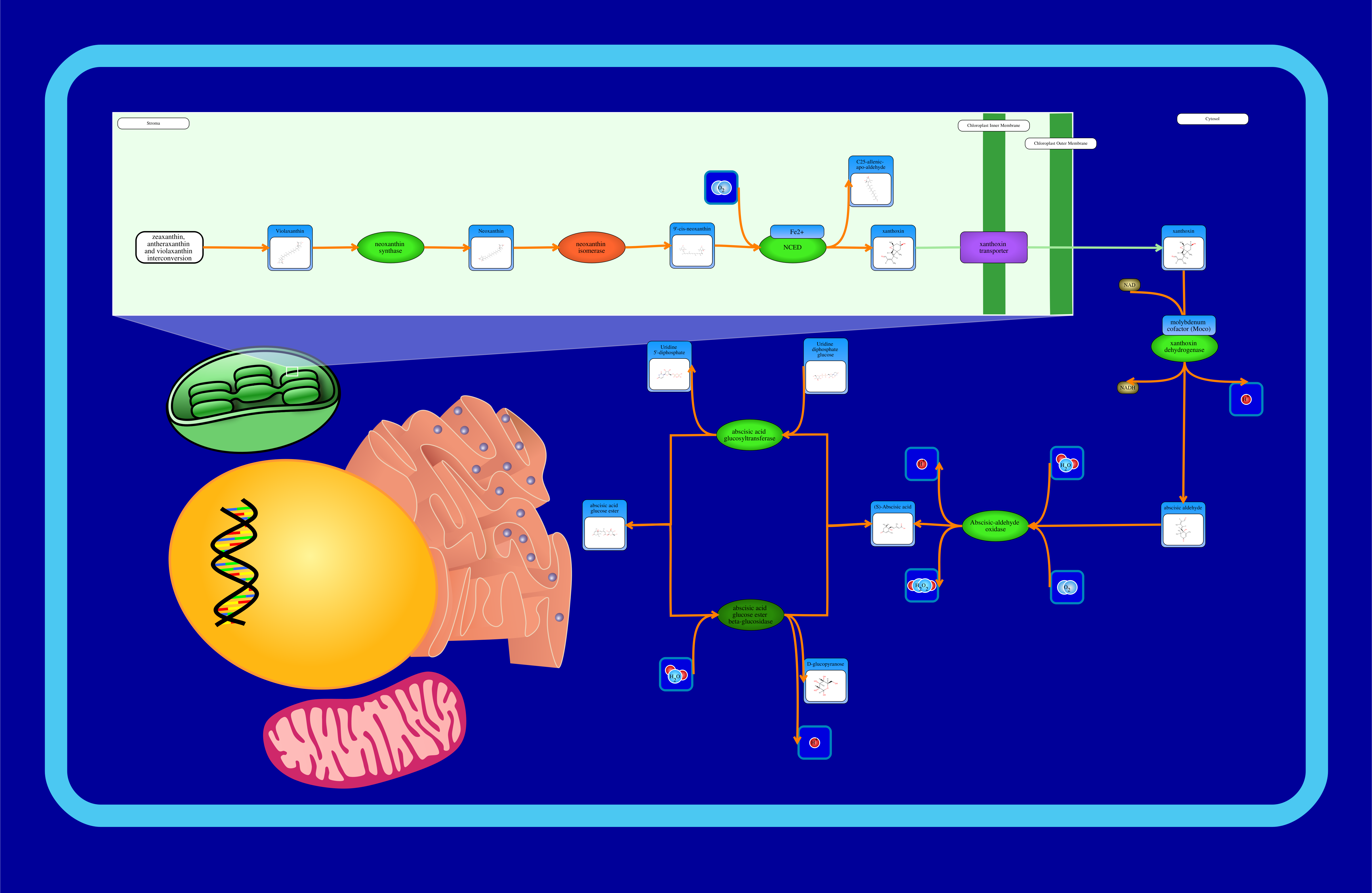 Abscisic acid glucose ester metabolism is a pathway that begins in the chloroplast and enters the cytosol and endoplasmic reticulum body by which violaxanthin becomes abscisic acid glucose ester, synthesizing abscisic acid in the process. Abscisic acid glucose ester synthesis and reformation back to abscisic acid provides a mechanism for precisely controlling abscisic acid concentration (quickly removing and adding abscisic acid when required). First, neoxanthin synthase catalyzes the opening of the violaxanthin epoxide ring to form neoxanthin. Second, a yet unidentified neoxanthin isomerase is theorized to isomerize neoxanthin to 9'-cis-neoxanthin. Third, 9-cis-epoxycarotenoid dioxygenase (NCED) uses oxygen to cleave 9'-cis-neoxanthin to form xanthoxin and C25-allenic-apo-aldehyde. This enzyme requires Fe2+ as a cofactor. Next, a xanthoxin transporter is theorized to export xanthoxin from the chloroplast into the cytosol to continue abscisic acid biosynthesis, but it has yet to be discovered. Fourth, xanthoxin dehydrogenase, located in the cytosol, catalyzes the conversion of xanthoxin and NAD to abscisic aldehyde, NADH, and a proton with the help of a molybdenum cofactor (MoCo). Fifth, abscisic-aldehyde oxidase converts abscisic aldehyde, water, and oxygen into hydrogen peroxide, hydrogen ion, and abscisic acid. Sixth, abscisic acid glucosyltransferase uses UDP to convert abscisic acid into abscisic acid glucose ester. Abscisic acid glucose ester can then be converted back to abscisic acid via abscisic acid glucose ester beta-glucosidase located in the endoplasmic reticulum body (coloured dark green in the image). Consequently, it is theorized that ABA-GE transporters are required for this enzyme to access its substrates from the cytosol.