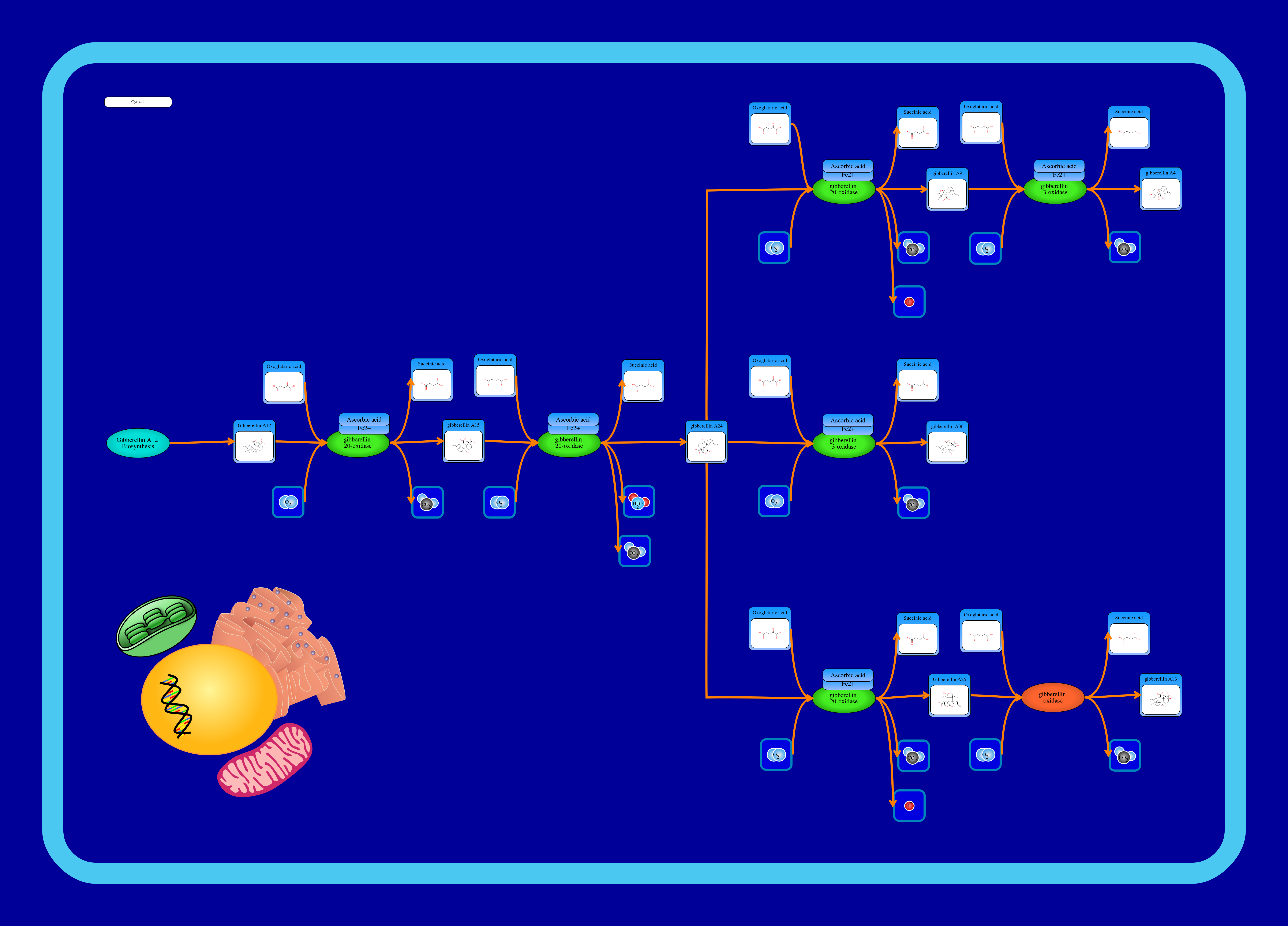 Gibberellins (GAs) are a large class of tetracyclic diterpenoid plant hormones that regulate numerous growth and developmental processes, such as seed germination, organ elongation, and flowering induction. All known gibberellins share an ent-gibberellane skeleton and follow the same synthesis pathway. Biosynthesis begins in the plasmids via the terpenoid pathway and finishes in the endoplasmic reticulum and cytosol where they undergo modification until a biologically-active form is reached (GA1, GA3, GA4, or GA7). Gibberellins are named in the order that they are discovered (GA1 through GAn). Gibberellin biosynthesis via non C-3, non C-13 hydroxylation occurs in the cytosol and converts the inactive GA12 to the active GA4, and inactive GA36 and GA13. The first two reactions are catalyzed by gibberellin 20-oxidase, requiring Fe2+ and L-ascorbate as cofactors. It first converts gibberellin A12 into gibberellin A15 and then into gibberellin A24. Gibberellin A24 has three different fates. The first route involves the conversion of gibberellin A24 into gibberellin A9 by gibberellin 20-oxidase and then the subsequent conversion of gibberellin A9 into the active gibberellin A4 by gibberellin 3-oxidase. It requires Fe2+ and L-ascorbate as cofactors. The second route involves the conversion of gibberellin A24 into gibberellin A36 by gibberellin 3-oxidase. The third route involves the conversion of gibberellin A24 into gibberellin A25 by gibberellin 20-oxidase and then the subsequent conversion of gibberellin A25 into gibberellin A13 by a not yet elucidated gibberellin oxidase (coloured orange in the image).