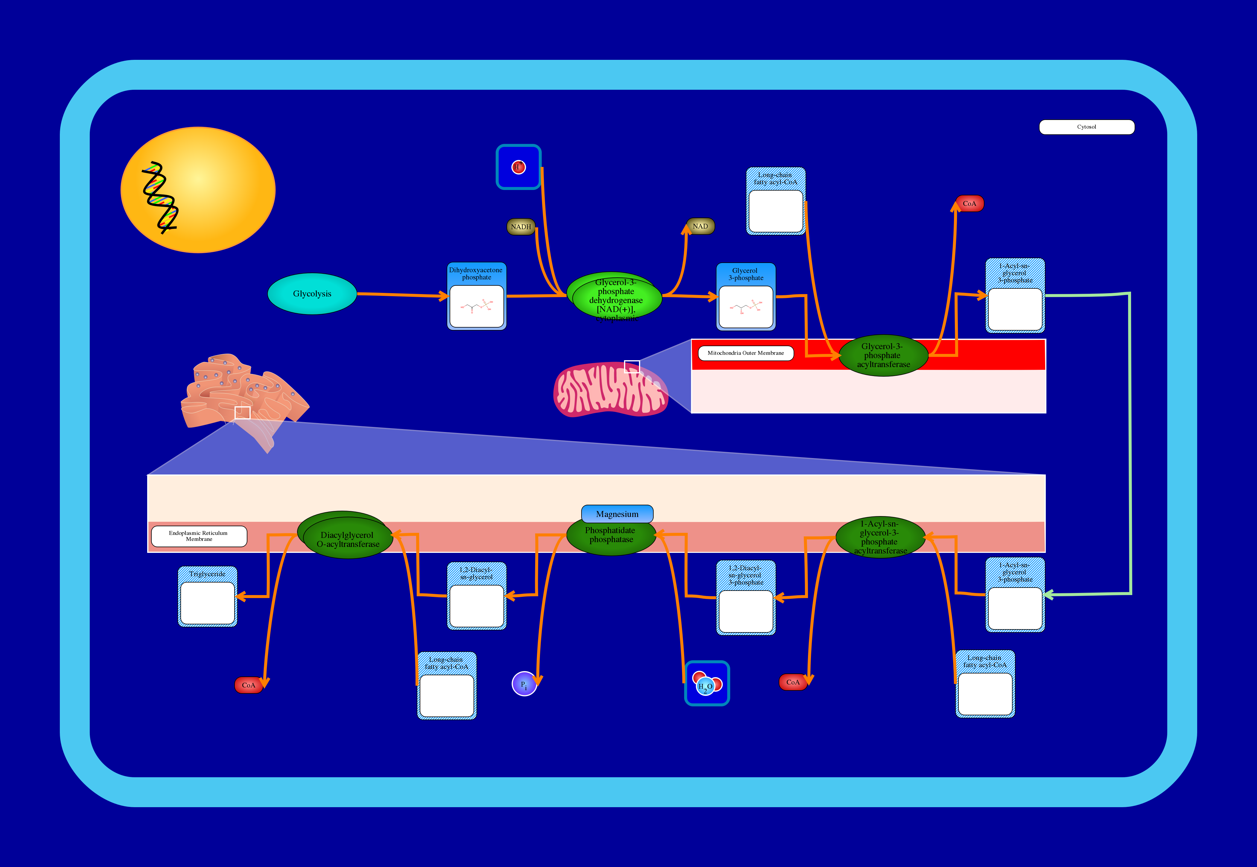 A triglyceride (TG, triacylglycerol, TAG, or triacylglyceride) is an ester derived from glycerol and three fatty acids. De novo biosynthesis of triglycerides is also known as the phosphatidic acid pathway, and it is mainly associated with the liver and adipose tissue. All membrane-localized enzymes are coloured dark green in the image. First, dihydroxyacetone phosphate (or glycerone phosphate) from glycolysis is used by the cytosolic enzyme glycerol-3-phosphate dehydrogenase [NAD(+)] to synthesize sn-glycerol 3-phosphate. Second, the mitochondrial outer membrane enzyme glycerol-3-phosphate acyltransferase esterifies an acyl-group to the sn-1 position of sn-glycerol 3-phosphate to form 1-acyl-sn-glycerol 3-phosphate (lysophosphatidic acid or LPA). The next three steps are localized to the endoplasmic reticulum membrane. The enzyme 1-acyl-sn-glycerol-3-phosphate acyltransferase converts LPA into phosphatidic acid (1,2-diacyl-sn-glycerol 3-phosphate) by esterifying an acyl-group to the sn-2 position of the glycerol backbone. Next, magnesium-dependent phosphatidate phosphatase catalyzes the conversion of phosphatidic acid into diacylglycerol. Last, the enzyme diacylglycerol O-acyltransferase synthesizes triacylglycerol from diacylglycerol and a fatty acyl-CoA.