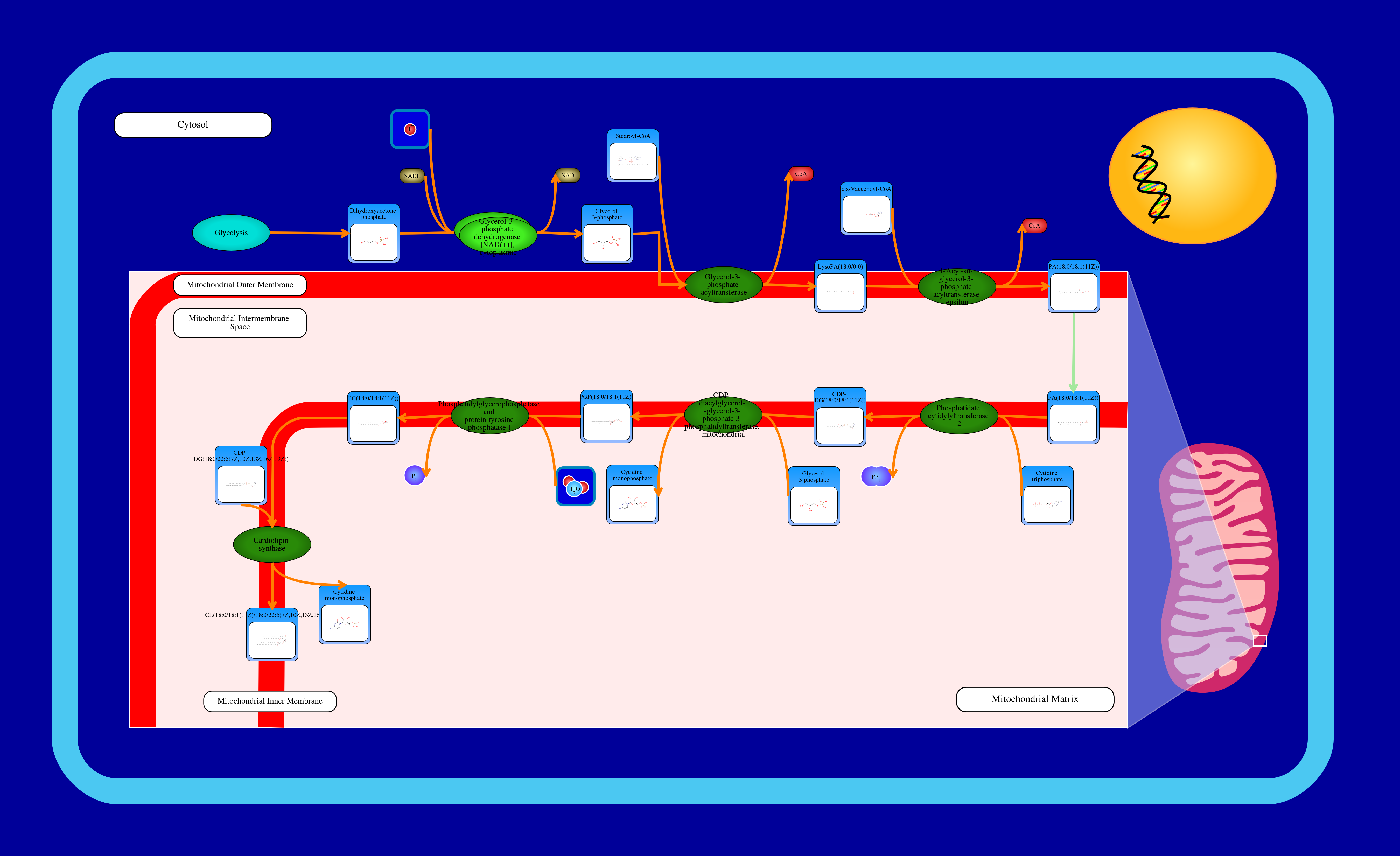Cardiolipin (CL) is an important component of the inner mitochondrial membrane where it constitutes about 20% of the total lipid composition. It is essential for the optimal function of numerous enzymes that are involved in mitochondrial energy metabolism. (Wikipedia) Cardiolipin biosynthesis occurs mainly in the mitochondria, but there also exists an alternative synthesis route for CDP-diacylglycerol that takes place in the endoplasmic reticulum. This second route may supplement this pathway. All membrane-localized enzymes are coloured dark green in the image. First, dihydroxyacetone phosphate (or glycerone phosphate) from glycolysis is used by the cytosolic enzyme glycerol-3-phosphate dehydrogenase [NAD(+)] to synthesize sn-glycerol 3-phosphate. Second, the mitochondrial outer membrane enzyme glycerol-3-phosphate acyltransferase esterifies an acyl-group to the sn-1 position of sn-glycerol 3-phosphate to form 1-acyl-sn-glycerol 3-phosphate (lysophosphatidic acid or LPA). Third, the enzyme 1-acyl-sn-glycerol-3-phosphate acyltransferase converts LPA into phosphatidic acid (PA or 1,2-diacyl-sn-glycerol 3-phosphate) by esterifying an acyl-group to the sn-2 position of the glycerol backbone. PA is then transferred to the inner mitochondrial membrane to continue cardiolipin synthesis. Fourth, magnesium-dependent phosphatidate cytidylyltransferase catalyzes the conversion of PA into CDP-diacylglycerol. Fifth, CDP-diacylglycerol--glycerol-3-phosphate 3-phosphatidyltransferase synthesizes phosphatidylglycerophosphate (PGP). Sixth, phosphatidylglycerophosphatase and protein-tyrosine phosphatase dephosphorylates PGP to form phosphatidylglycerol (PG). Last, cardiolipin synthase catalyzes the synthesis of cardiolipin by transferring a phosphatidyl group from a second CDP-diacylglycerol to PG. It requires a divalent metal cation cofactor.