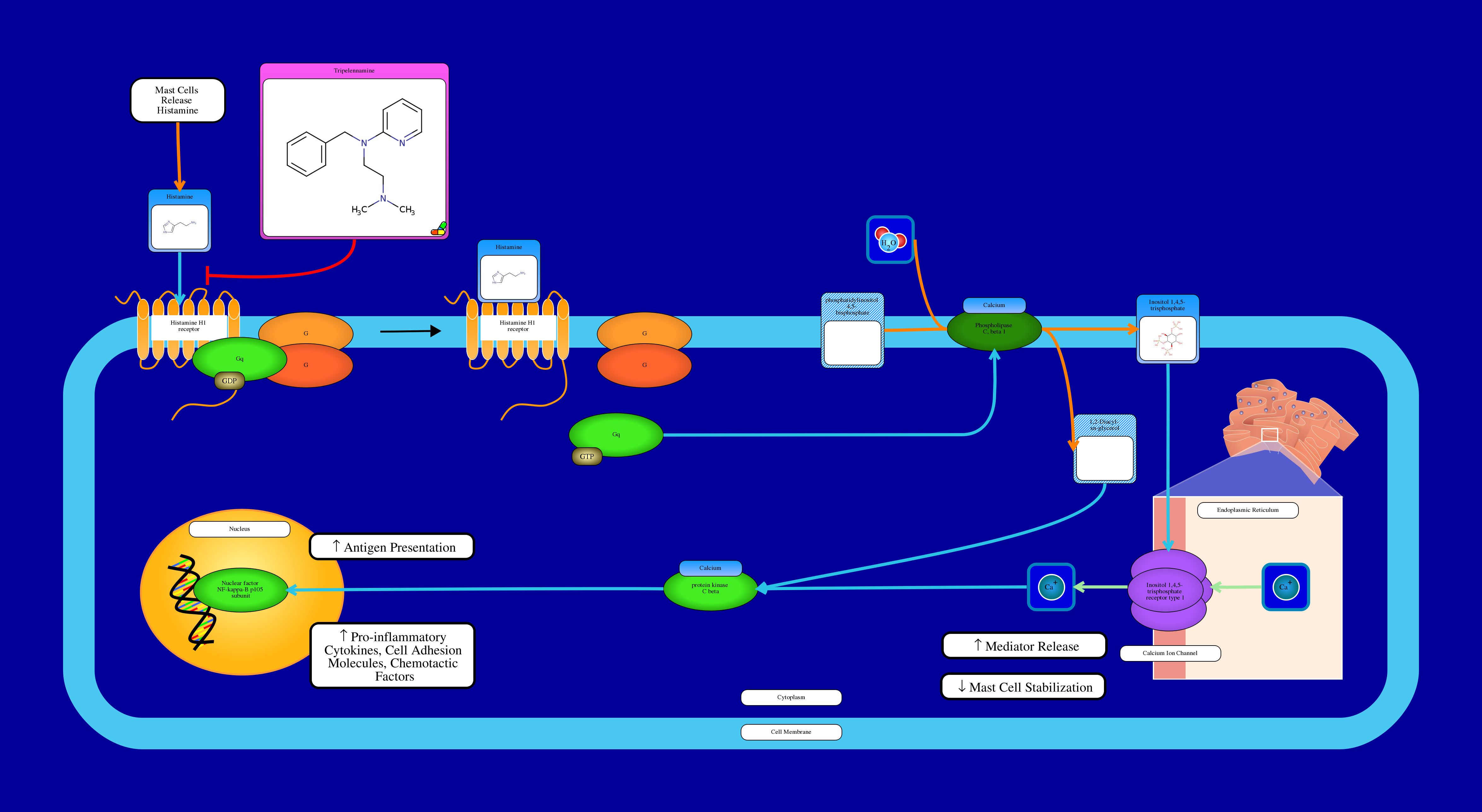 Tripelennamine is a first-generation ethylenediamine H1-antihistamine. H1-antihistamines interfere with the agonist action of histamine at the H1 receptor and are administered to attenuate inflammatory process in order to treat conditions such as allergic rhinitis, allergic conjunctivitis, and urticaria. Reducing the activity of the NF-κB immune response transcription factor through the phospholipase C and the phosphatidylinositol (PIP2) signalling pathways also decreases antigen presentation and the expression of pro-inflammatory cytokines, cell adhesion molecules, and chemotactic factors. Furthermore, lowering calcium ion concentration leads to increased mast cell stability which reduces further histamine release. First-generation antihistamines readily cross the blood-brain barrier and cause sedation and other adverse central nervous system (CNS) effects (e.g. nervousness and insomnia). Second-generation antihistamines are more selective for H1-receptors of the peripheral nervous system (PNS) and do not cross the blood-brain barrier. Consequently, these newer drugs elicit fewer adverse drug reactions.