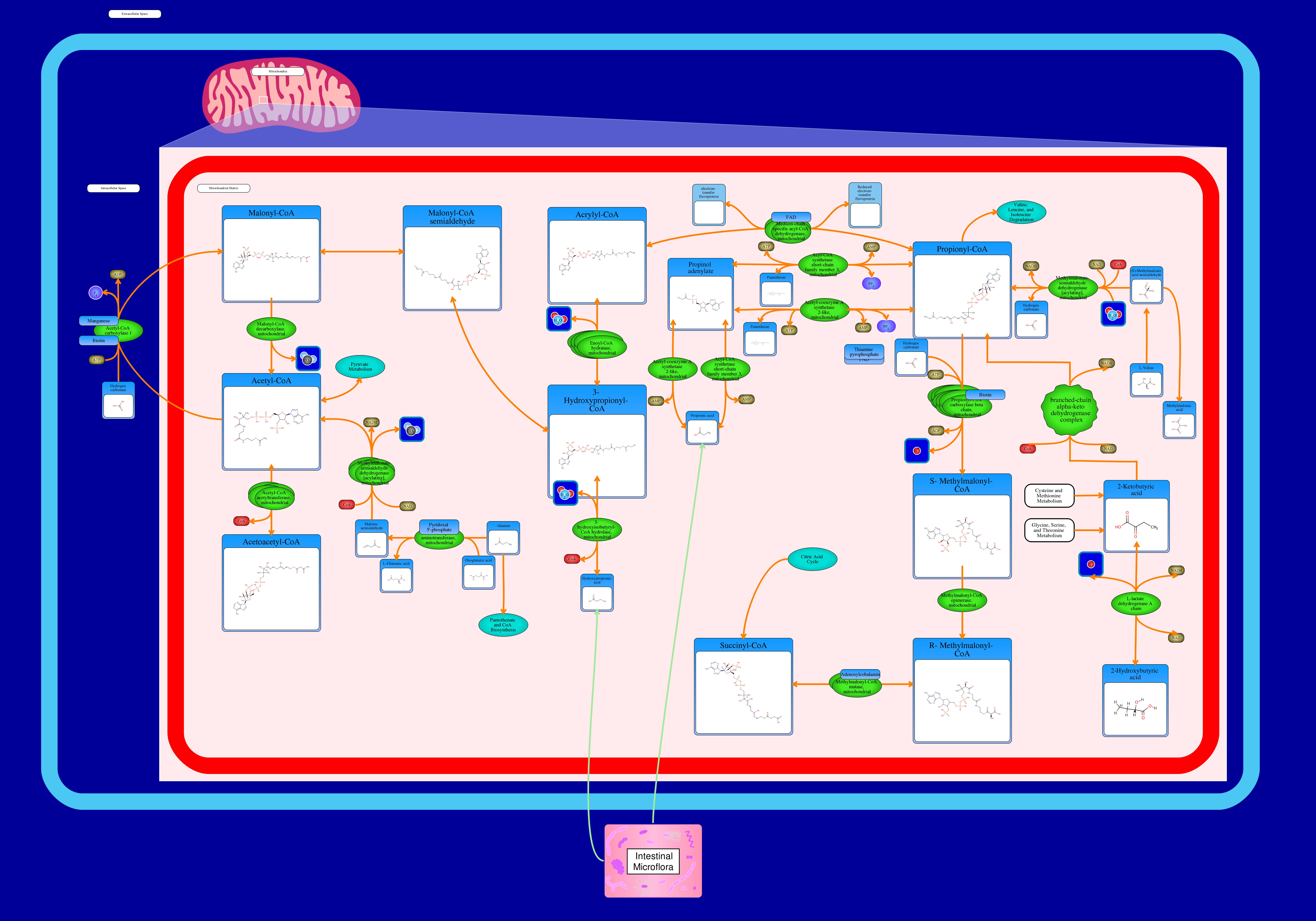 This pathway depicts the metabolism of propionic acid. Propionic acid in mammals typically arises from the production of the acid by gut or skin microflora. Propionic acid producing bacteria (Propionibacterium sp.) are particularly common in sweat glands of mammals. After entering a cell, the propionic acid (propanoate) then enters the mitochondria where it is converted into propanol adenylate (or propionyl adenylate or propionyl-AMP) via propionyl-CoA synthetase and acetyl-CoA synthetase. The propionyl adenylate then is converted into propionyl coenzyme A (propionyl-CoA) via the same pair of enzymes. Propionyl-CoA is a relatively common compound that can also arise from the metabolic breakdown of fatty acids containing odd numbers of carbon atoms. Propionyl-CoA is also known to arise from the breakdown of some amino acids. Since propanoate has three carbons, propionyl-CoA cannot directly enter the beta-oxidation cycle (which requires two carbons from acetyl-CoA). Therefore, in most vertebrates, propionyl-CoA is carboxylated into D-methylmalonyl-CoA via propionyl-CoA carboxylase. The resulting compound is isomerized into L-methylmalonyl-CoA via methylmalonyl-CoA epimerase. A vitamin B12-dependent enzyme, called methylmalonyl CoA mutase catalyzes the rearrangement of L-methylmalonyl-CoA to succinyl-CoA, which is an intermediate of the citric acid cycle. Also depicted in this pathway is another propionic acid homolog called hydroxypropanoic acid (hydroxypropionate). This compound is also produced by bacteria and imported into cells. Hydroxypropionate can be converted into 3-hydroxypropionyl-CoA. This compound can be either enzymatically converted to acryloyl-CoA and then to propionyl-CoA or it can spontaneously convert to malonyl-CoA. Malonyl-CoA can convert into acetyl-CoA (via acetyl-CoA carboxylase in the cytoplasm or malonyl carboxylase in the mitochondria) whereupon it may enter a variety of pathways. In a rare genetic metabolic disorder called propionic acidemia, propionate acts as a metabolic toxin in liver cells by accumulating in the liver mitochondria as propionyl-CoA and its derivative methylcitrate. Both propionyl-CoA and methylcitrate are known TCA inhibitors. Glial cells are particularly susceptible to propionyl-CoA accumulation. In fact, when propionate is infused into rat brains and take up by the glial cells, it leads to behavioural changes that resemble autism (PMID: 16950524).