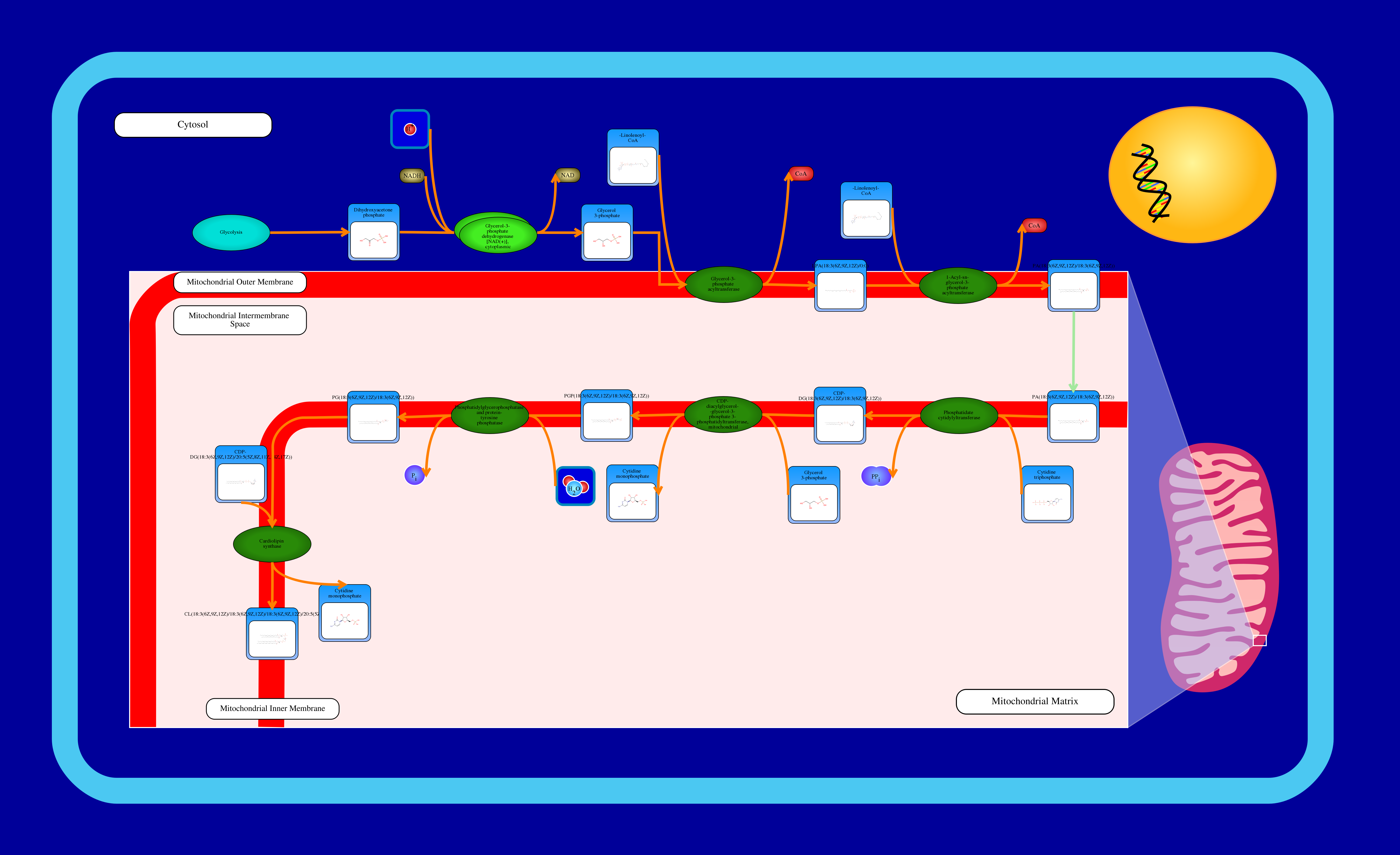 Cardiolipin (CL) is an important component of the inner mitochondrial membrane where it constitutes about 20% of the total lipid composition. It is essential for the optimal function of numerous enzymes that are involved in mitochondrial energy metabolism (Wikipedia). Cardiolipin biosynthesis occurs mainly in the mitochondria, but there also exists an alternative synthesis route for CDP-diacylglycerol that takes place in the endoplasmic reticulum. This second route may supplement this pathway. All membrane-localized enzymes are coloured dark green in the image. First, dihydroxyacetone phosphate (or glycerone phosphate) from glycolysis is used by the cytosolic enzyme glycerol-3-phosphate dehydrogenase [NAD(+)] to synthesize sn-glycerol 3-phosphate. Second, the mitochondrial outer membrane enzyme glycerol-3-phosphate acyltransferase esterifies an acyl-group to the sn-1 position of sn-glycerol 3-phosphate to form 1-acyl-sn-glycerol 3-phosphate (lysophosphatidic acid or LPA). Third, the enzyme 1-acyl-sn-glycerol-3-phosphate acyltransferase converts LPA into phosphatidic acid (PA or 1,2-diacyl-sn-glycerol 3-phosphate) by esterifying an acyl-group to the sn-2 position of the glycerol backbone. PA is then transferred to the inner mitochondrial membrane to continue cardiolipin synthesis. Fourth, magnesium-dependent phosphatidate cytidylyltransferase catalyzes the conversion of PA into CDP-diacylglycerol. Fifth, CDP-diacylglycerol--glycerol-3-phosphate 3-phosphatidyltransferase synthesizes phosphatidylglycerophosphate (PGP). Sixth, phosphatidylglycerophosphatase and protein-tyrosine phosphatase dephosphorylates PGP to form phosphatidylglycerol (PG). Last, cardiolipin synthase catalyzes the synthesis of cardiolipin by transferring a phosphatidyl group from a second CDP-diacylglycerol to PG.