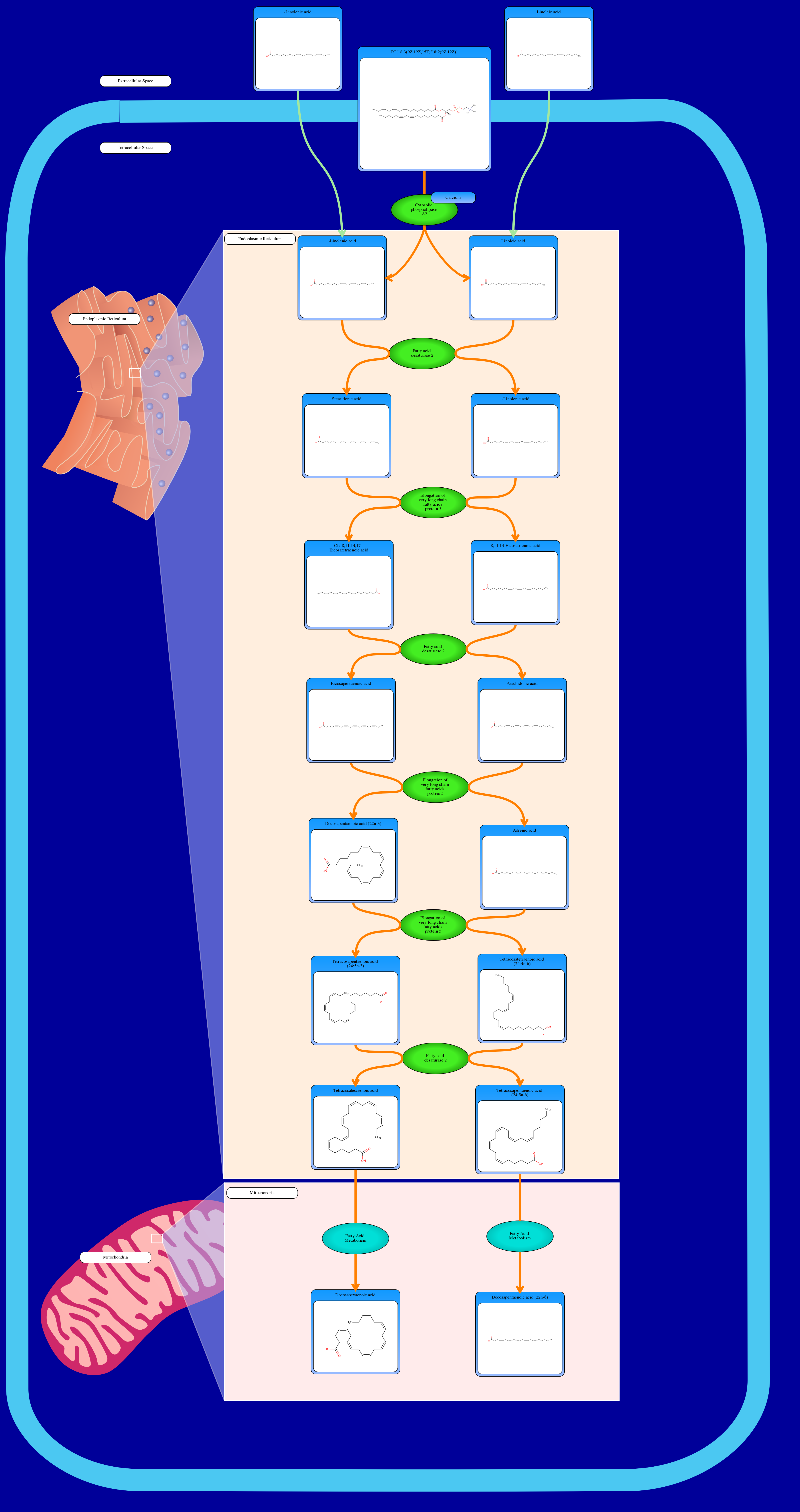 Both LNA and ALA are essential dietary requirements for all mammals since they cannot be synthesized natively in the body. Both undergo a series of similar conversions to reach their final fatty acid form. LNA enters the cell and is catalyzed to gamma-linolenic acid (GLA) by acyl-CoA 6-desaturase (delta-6-desaturase/fatty acid desaturase 2). GLA is then converted to dihomo-gammalinolenic acid (DGLA) by elongation of very long chain fatty acids protein 5 (ELOVL5). DGLA is then converted to arachidonic acid (AA) by acyl-CoA (8-3)-desaturase (delta-5-desaturase/fatty acid desaturase 1). Arachidonic acid is then converted to a series of short lived metabolites called eicosanoids before finally reaching it's final fatty acid form.