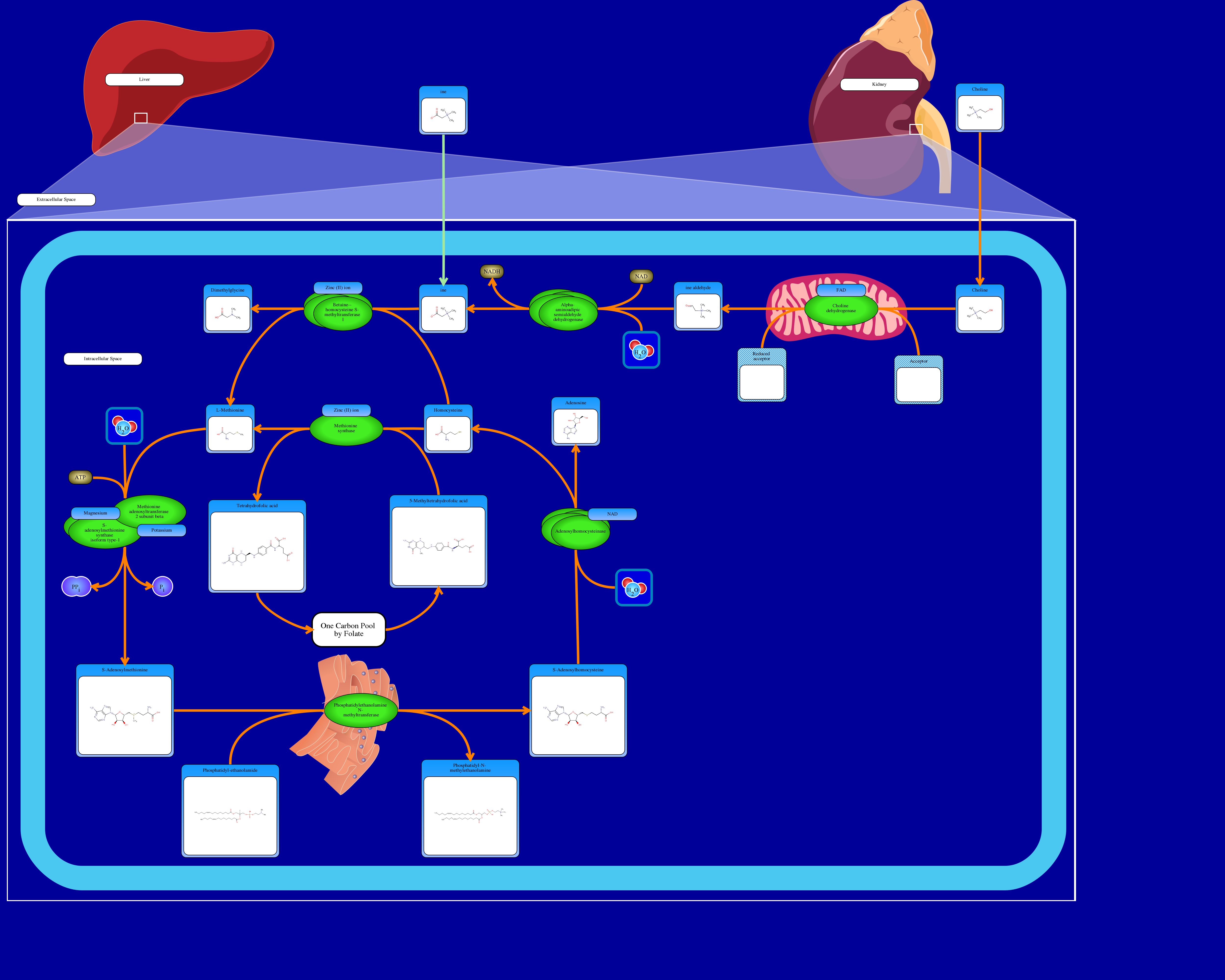 ALDH7A1 BHMT MTR MAT1A MAT2B AHCY CHDH PEMT THFA 5-MTHFa βine βine Choline Choline BinAld NAD H2O NADH Hcys DMglyc Met ATP H2O SAMe Pi PPi SAH H2O Adenosi Phet PhNmeth Zinc Zinc Mg2+ K+ NAD FAD Accepto RA O C P b Extracellular Space Intracellular Space Liver Kidney