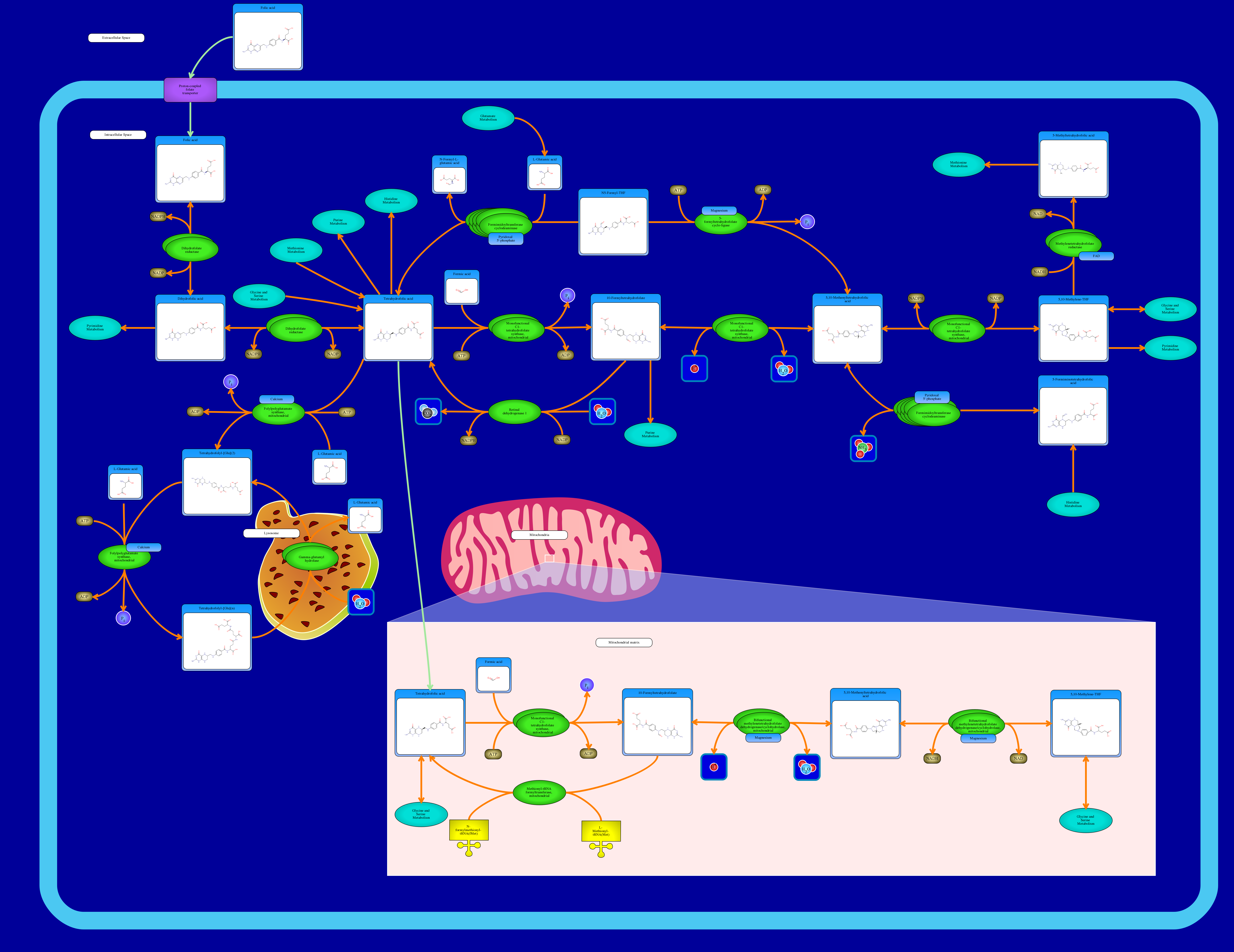 Folate, or folic acid, is a very important B-vitamin involved in cell creation and preservation, as well as the protection of DNA from mutations that can cause cancer. It is commonly found in leafy green vegetables, but is also present in many other foods such as fruit, dairy products, eggs and meat. Folate is imperative during pregnancy as a deficiency will cause neural tube defects in the offspring. Many countries around the world now fortify foods with folic acid to prevent such defects. This pathway begins in the extracellular space, where folic acid is transported into the cell through a proton-coupled folate transporter. From there, dihydrofolate reductase converts folic acid into dihydrofolic acid. Dihydrofolic acid is then created into tetrahydrofolic acid through dihydrofolate reductase. Tetrahydrofolic acid then sparks the beginning of many reactions and subpathways including purine metabolism and histidine metabolism. There are two reactions that tetrahydrofolic acid undergoes, the first being the catalyzation into tetrahydrofolyl-[glu](2) through the enzyme folylpolyglutamate synthase in the mitochondria. Then, tetrahydrofolyl-[glu](2) becomes tetrahydrofolyl-[glu](n) through folylpolyglutamate synthase. The cycle ends with tetrahydrofolyl-[glu](n) reverting to tetrahydrofolyl-[glu](2) in the lysosome through the enzyme gamma-glutamyl hydrolase. The second reaction that begins with tetrahydrofolic acid sees tetrahydrofolic acid turned into 10-formyltetrahydrofolate through c-1-tetrahydrofolate synthase. This loop is completed by cytosolic 10-formyltetrahydrofolate dehydrogenase reverting 10-formyltetrahydrofolate back to tetrahydrofolic acid. Folate is not stored in the body for very long, as it is a water soluble vitamin and is excreted through urine, so it is important to ingest it continually, as your body’s level of folate will decline after a few weeks if the vitamin is avoided.
