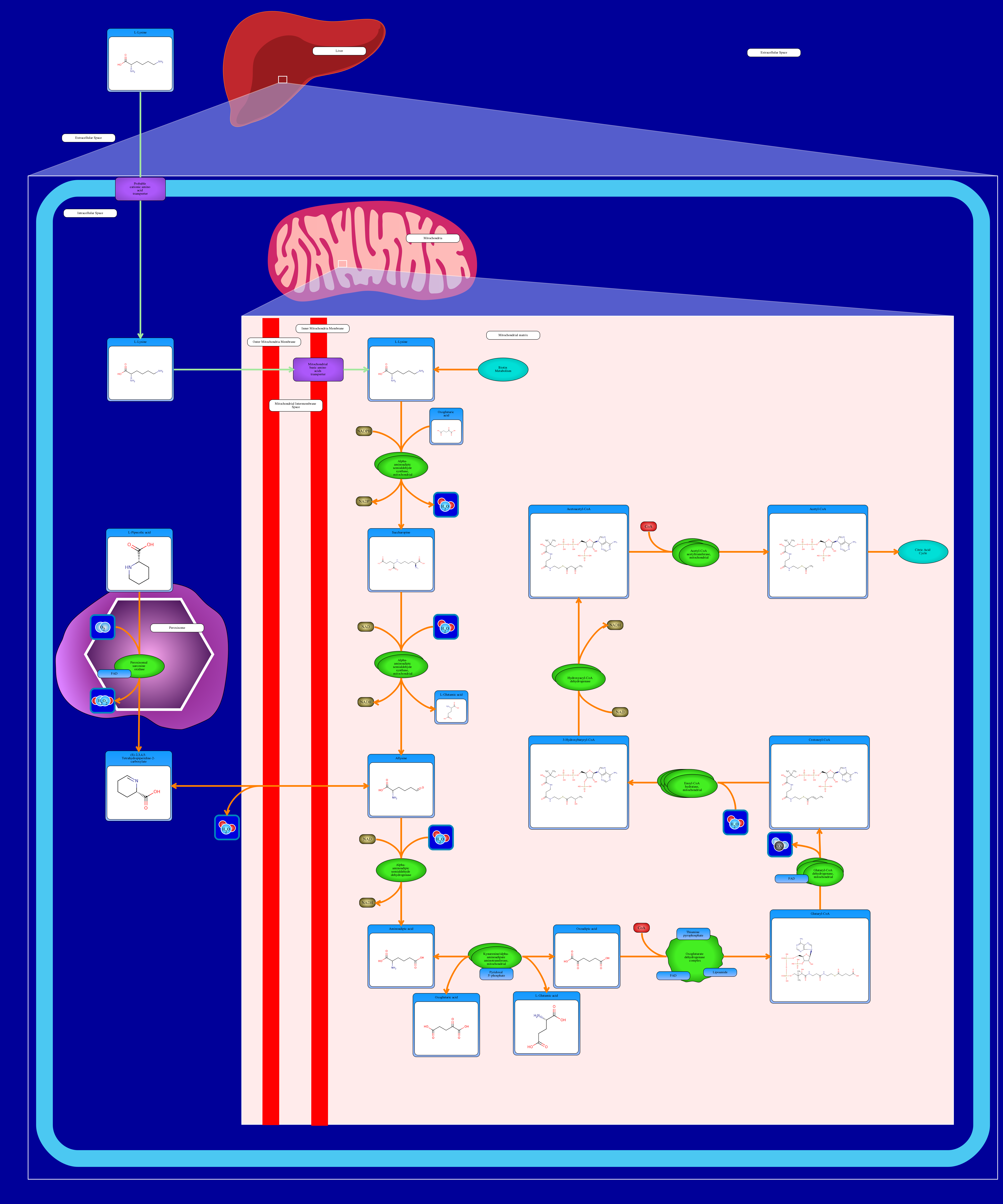 The degradation of L-lysine happens in liver and it is consisted of seven reactions. L-Lysine is imported into liver through low affinity cationic amino acid transporter 2 (cationic amino acid transporter 2/SLC7A2). Afterwards, L-lysine is imported into mitochondria via mitochondrial ornithine transporter 2. L-Lysine can also be obtained from biotin metabolism. L-Lysine and oxoglutaric acid will be combined to form saccharopine by facilitation of mitochondrial alpha-aminoadipic semialdehyde synthase, and then, mitochondrial alpha-aminoadipic semialdehyde synthase will further breaks saccharopine down to allysine and glutamic acid. Allysine will be degraded to form aminoadipic acid through alpha-aminoadipic semialdehyde dehydrogenase. Oxoadipic acid is formed from catalyzation of mitochondrial kynurenine/alpha-aminoadipate aminotransferase on aminoadipic acid. Oxoadipic acid will be further catalyzed to form glutaryl-CoA, and glutaryl-CoA converts to crotonoyl-CoA, and crotonoyl-CoA transformed to 3-hydroxybutyryl-CoA. 3-Hydroxybutyryl-CoA will form Acetyl-CoA as the final product through the intermediate compound: acetoacetyl-CoA. Acetyl-CoA will undergo citric acid cycle metabolism. Carnitine is another key byproduct of lysine metabolism (not shown in this pathway).