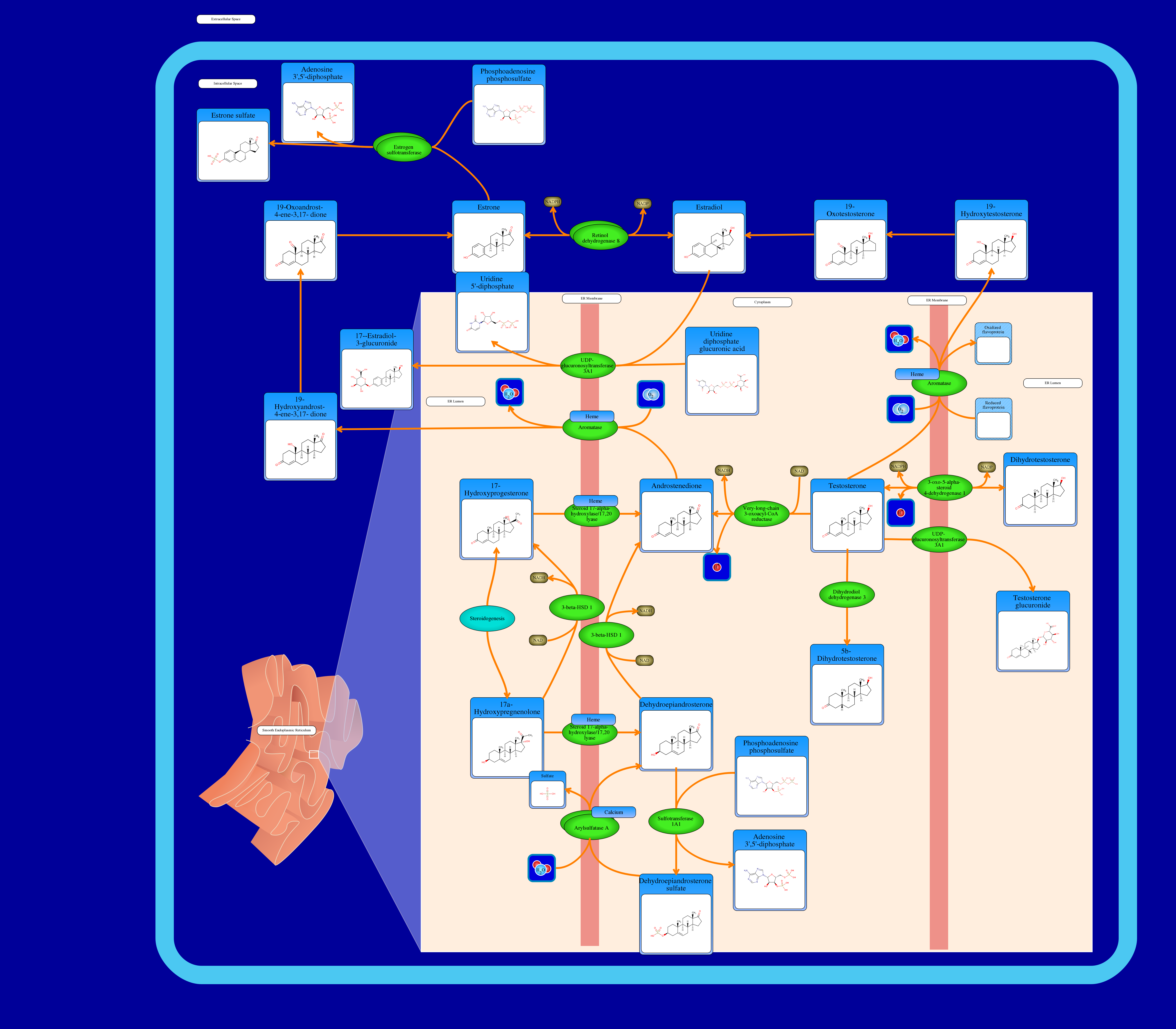 This pathway describes the inactivation and catabolism of male (androgen) and female (estrogen) hormones. Many steroid hormones are transformed by sulfatases, dehydrogenases and glucuronide transferases to enhance their solubility and to facilitate their elimination. Inactivation means to convert an active compound into an inactive compound. Peripheral inactivation, which is inactivation caused by outside enzymes such as liver enzymes for example, is needed to maintain a steady-state level of plasma. This means that if either of these hormones are to be “chemical signals”, their half-life in the bloodstream has to be limited so that a variation in secretion rate can be emulated in the plasma. A large part of inactivation/catabolism occurs in the liver, although a little bit of catabolic activity does happen in the kidneys. Inactive androgens and estrogens are mostly eliminated in the urine. For this to happen, androgen and estrogen need to be converted to compounds that are less hydrophobic so that they are more soluble at higher concentrations. In this pathway, the conversion to a hydrophilic compound is an oxidation of a 17b-hydroxyl group. These hormones are needed for sexual development in both males and females.