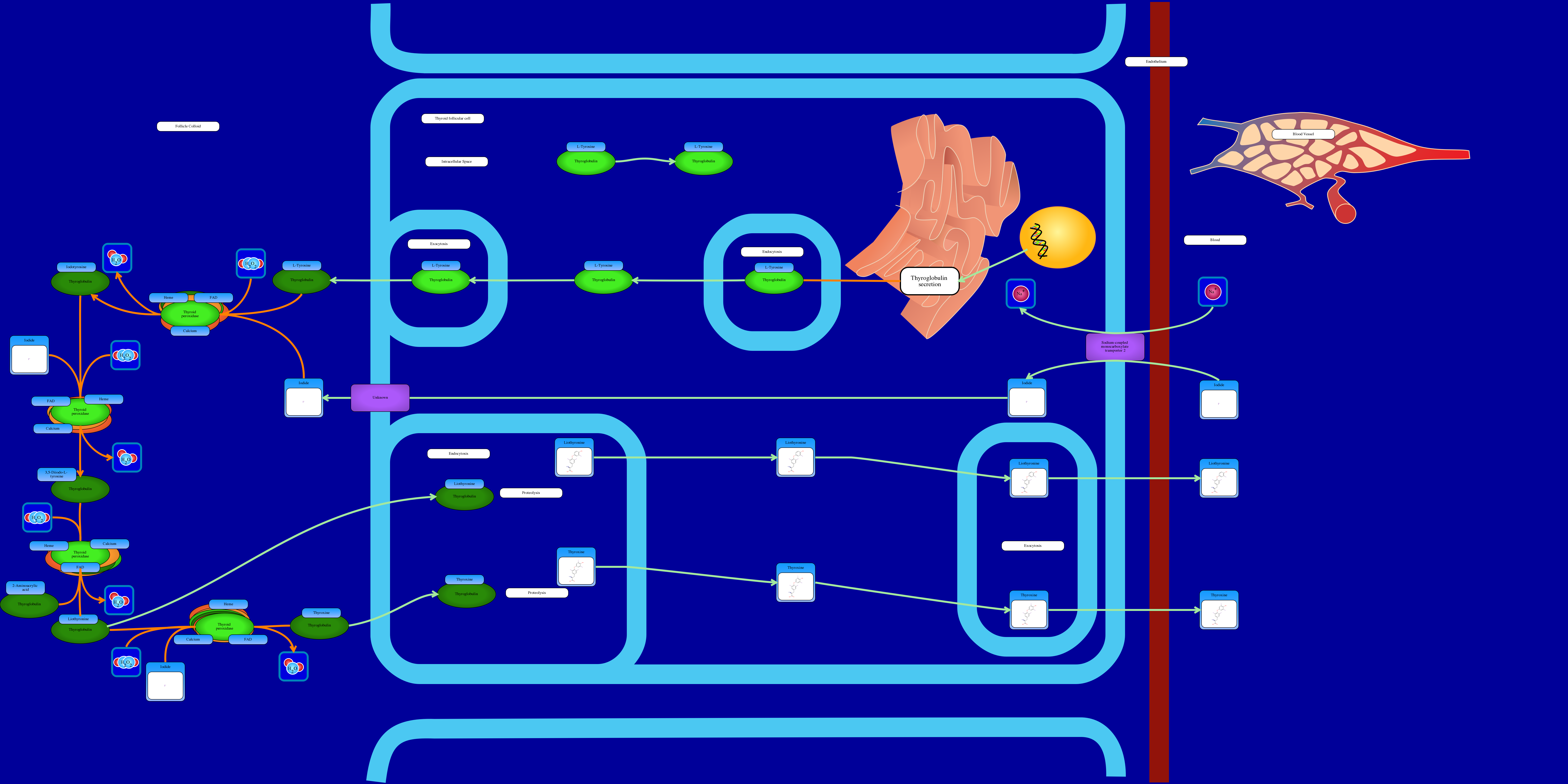 Thyroid hormone synthesis is a process that occurs in the thyroid gland in humans that results in the production of thyroid hormones which regulate many different processes in the body, such as metabolism, temperature regulation and growth/development. Thyroid hormone synthesis begins in the nucleus of a thyroid follicular cell, as thyroglobulin synthesis occurs here and is transported to the endoplasmic reticulum. From there, thyroglobulin transported through endocytosis into the intracellular space, and then transported through exocytosis to the follicle colloid. There, thyroglobulin is joined by iodide that has been transported from the blood, through the thyroid follicular cell and arrived in the the follicle colloid using pendrin, and hydrogen peroxide to be catalyzed by thyroid peroxidase, creating thyroglobulin + iodotyrosine. Then, iodide, hydrogen peroxide and thyroidperoxidase create thyroglobulin + 3,5-diiodo-L-tyrosine. Thyroglobulin+3,5-diiodo-L-tyrosine then joins with hydrogen peroxide and thyroid peroxidase to create thyroglobulin + 2-aminoacrylic acid and thyroglobulin+liothyronine. Thyroglobulin + liothyronine then goes through two processes, the first being its transportation into the cell and undergoing of proteolysis, which is followed by liothyronine being transported into the bloodstream. The second process is thyroglobulin + liothyronine being catalyzed by thyroid peroxidase and resulting in the production of thyroglobulin + thyroxine. Thyroglobulin + thyroxine is then transported back into the cell, undergoes proteolysis, and thyroxine alone is transported back out of the cell and into the bloodstream.