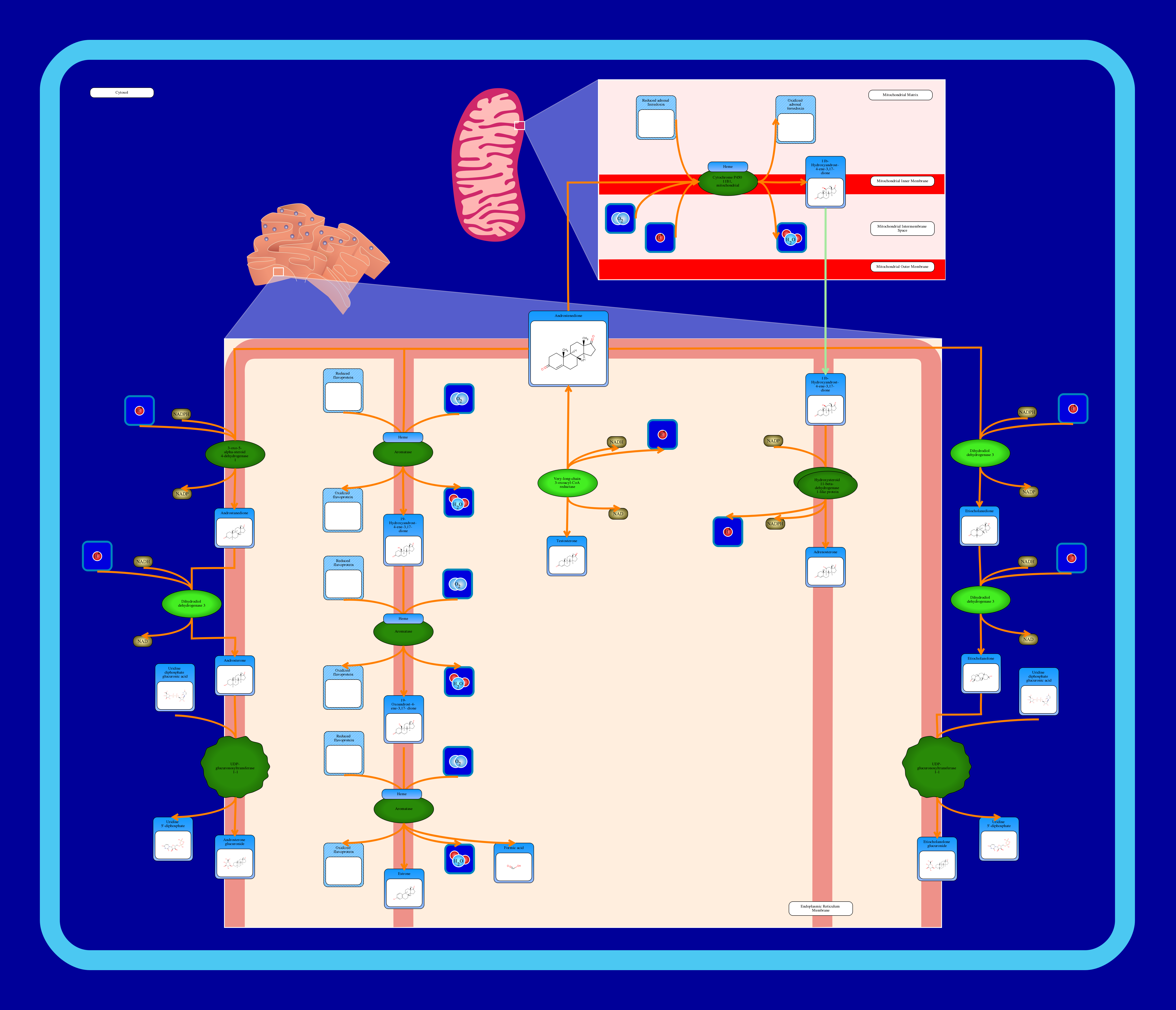 Androstenedione is an endogenous weak androgen steroid hormone that is a precursor of testosterone and other androgens, as well as of estrogens like estrone . Its metabolism occurs primarily in the endoplasmic reticulum (membrane-associated enzymes are coloured dark green in the image). Conversion of androstenedione to testosterone requires the enzyme testosterone 17-beta-dehydrogenase 3. Conversion of androstenedione to estrone involves three successive reactions catalyzed by the enzyme aromatase (cytochrome P450 19A1). Androstenedione can also be converted into etiocholanolone glucuronide, androsterone glucuronide, and adrenosterone. The three-reaction subpathway to synthesize etiocholanolone glucuronide begins with the enzyme 3-oxo-5-beta-steroid 4-dehydrogenase catalyzing the conversion of androstenedione to etiocholanedione. This is followed by the conversion of etiocholanedione to etiocholanolone which is catalyzed by aldo-keto reductase family 1 member C4. Lastly, the large membrane-associated multimer UDP-glucuronosyltransferase 1-1 catalyzes the conversion of etiocholanolone to etiocholanolone glucuronide. The three-reaction subpathway to synthesize androsterone glucuronide begins with the conversion of androstenedione to androstanedione via 3-oxo-5-alpha-steroid 4-dehydrogenase 1. Anstrostanedione is then converted into androsterone via aldo-keto reductase family 1 member C4. The last reaction to form androsterone glucuronide is catalyzed by the large multimer UDP-glucuronosyltransferase 1-1. The two-reaction subpathway to synthesize adrenosterone begins in the mitochondrial inner membrane where androstenedione is first converted into 11beta-hydroxyandrost-4-ene-3,17-dione by the enzyme cytochrome P450 11B1. Following transport to the endoplasmic reticulum, 11beta-hydroxyandrost-4-ene-3,17-dione is converted into adrenosterone via corticosteroid 11-beta-dehydrogenase isozyme 1.