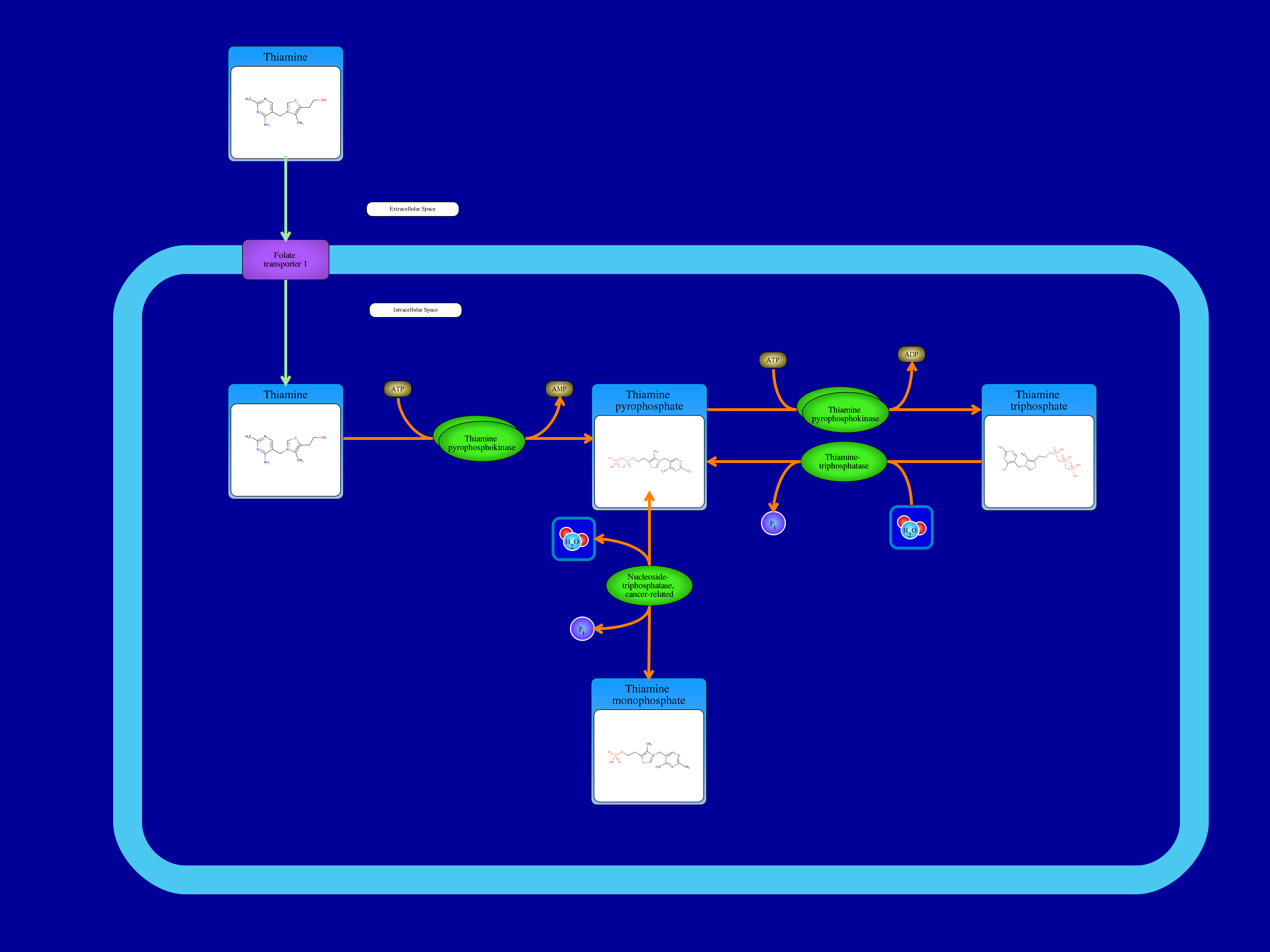 Thiamine, (Vitamin B1), is a compound found in many different foods such as beans, seafood, meats and yogurt. It is usually maintained by the consumption of whole grains. It is an essential part of energy metabolism. This means that thiamine helps convert carbohydrates into energy. Eating carbohydrates increases the need for this vitamin, as your body can only store about 30mg at a time due to the vitamins short half-life. Thiamine was first synthesized in 1936, which was very helpful in researching its properties in relation to beriberi, a vitamin b1 deficiency. This deficiency has been observed mainly in countries where rice is the staple food. Thiamine metabolism begins in the extracellular space, being transported by a thiamine transporter into the cell. Once in the intracellular space, thiamine is converted into thiamine pyrophosphate through the enzyme thiamin pyrophosphate kinase 1. Thiamine pyrophosphate is then converted into thiamine triphosphate, again using the enzyme thiamin pyrophosphatekinase 1. After this, thiamine triphosphate uses thiamine-triphosphatase to revert to thiamine pyrophosphate, which undergoes a reaction using cancer-related nuceloside-triphosphatase to become thiamine monophosphate. This phosphorylated form is a metabolically active form of thiamine, as are the two other compounds, derivatives of thiamine, mentioned previously. The enzymes used in this pathway both stem from the upper small intestine. Thiamine is passed mainly through urine. It is a water-soluble vitamin, which means it dissolves in water and is carried to different parts of the body but is not stored in the body.