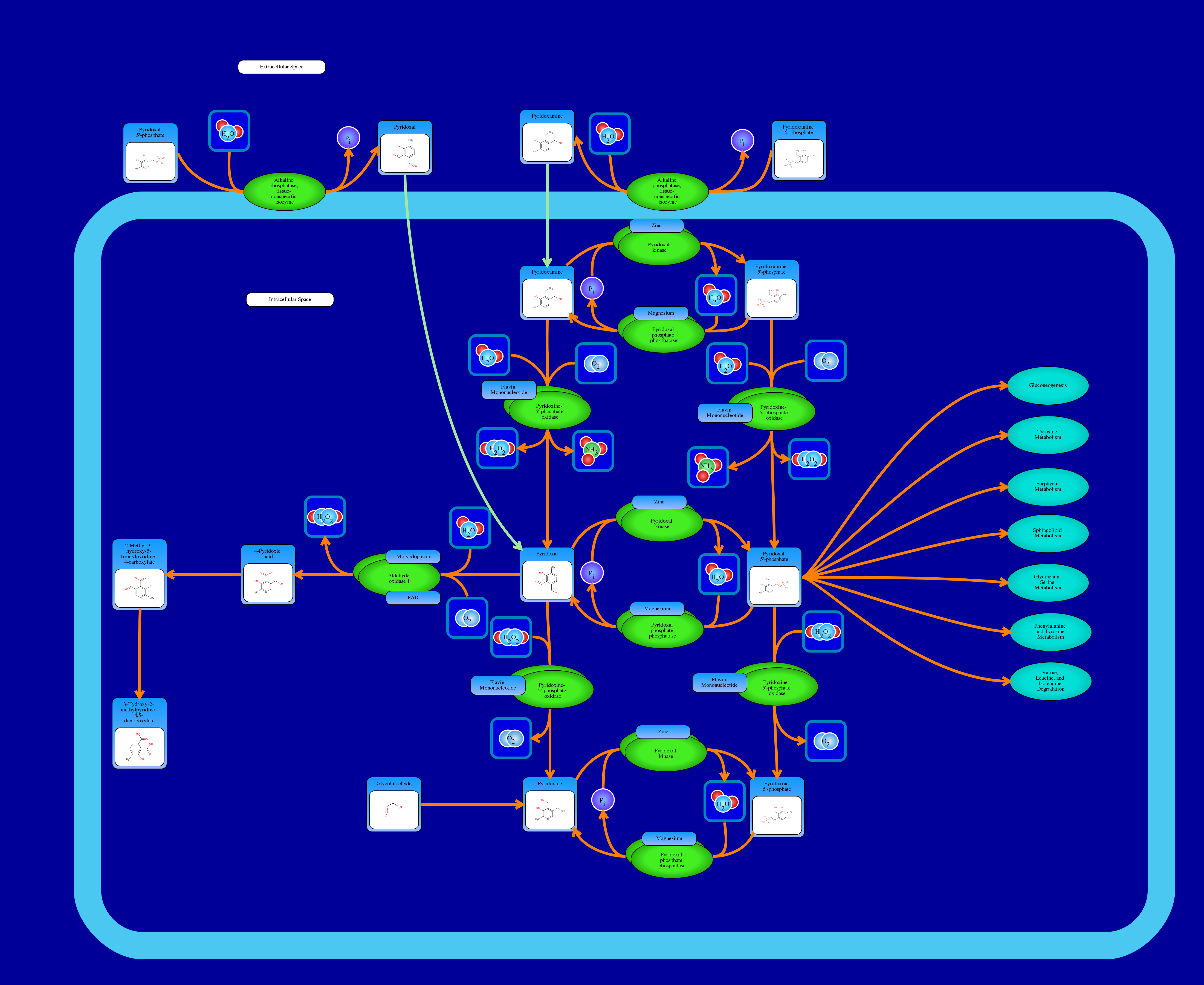 As is commonly known there are many vitamins, the vitamin B complex group being one of the most well known. An important vitamin B complex group vitamin is vitamin B6, which is water-soluble. Moreover, this vitamin comes in various forms, one of which is an active form, known by the name pyridoxal phosphate or PLP. PLP serves as cofactor in a variety of reactions including from amino acid metabolism, (in particular in reactions such as transamination, deamination, and decarboxylation). To complicate matters however, there are in fact seven alternate forms of this same vitamin. These include pyridoxine (PN), pyridoxine 5’-phosphate (PNP), pyridoxal (PL), pyridoxamine (PM), pyridoxamine 5’-phosphate (PMP), 4-pyridoxic acid (PA), and the aforementioned pyridoxal 5’-phosphate (PLP). One of these forms, PA, is in fact a catabolite whose presence is found in excreted urine. For a person to absorb some of these active forms of vitamin B6 such as PLP or PMP they must first be dephosphorylized. This done via an alkaline enzyme phosphatase.