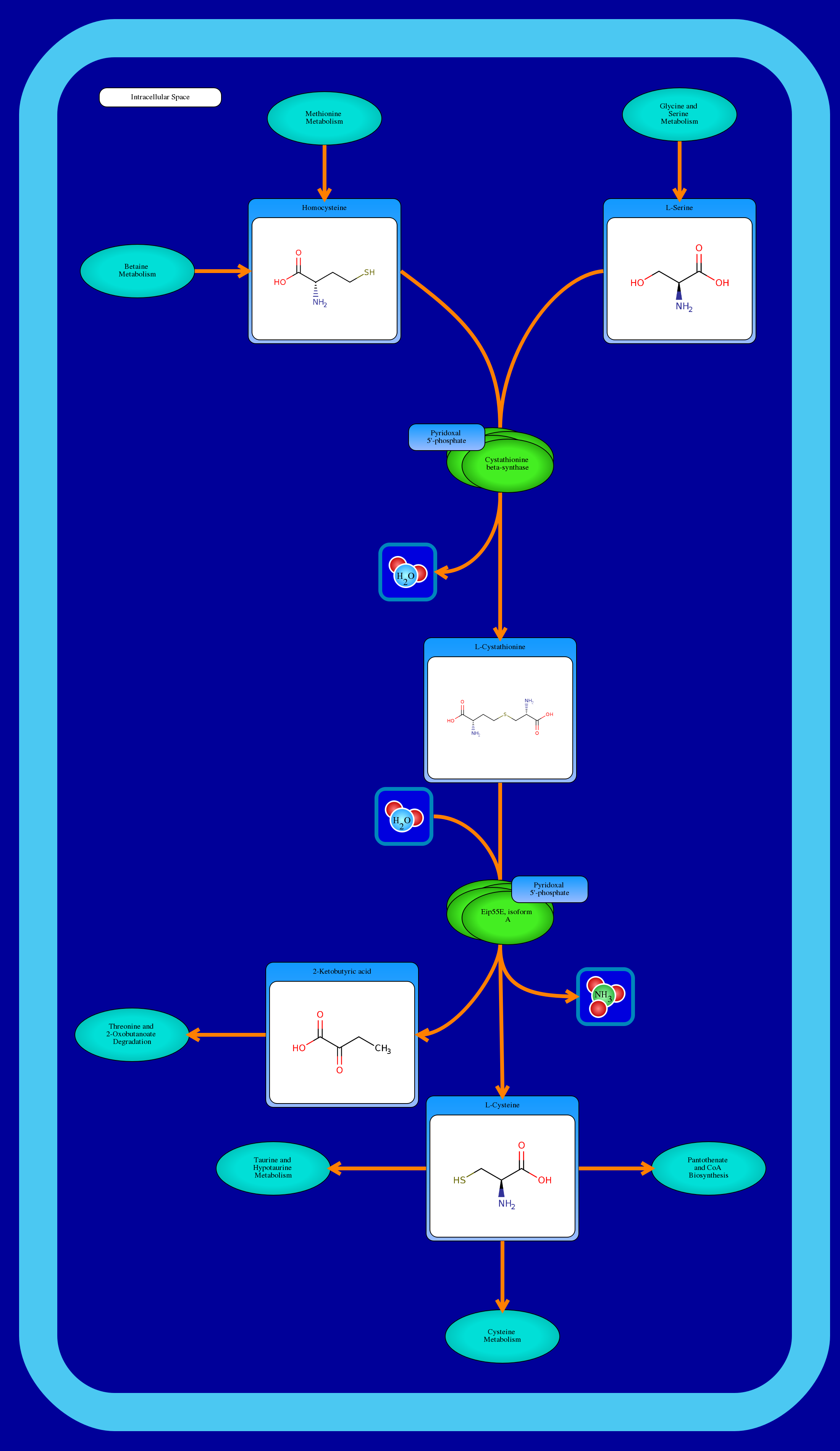 Homocysteine is an amino acid and homologue of cysteine that appears in the body as a result of the degradation of methionine. In mammals, homocysteine is used to biosynthesize cysteine via the following pathway. First the enzyme cystathionine beta-synthetase irreversibly condenses homocysteine with L-serine, forming L-cystathionine. The L-cystathionine is then cleaved by cystathionine gamma-lyase, producing 2-oxobutanoate, L-cysteine, and ammonia. The 2-oxobutanoate is further broken down via the 2-oxobutanoate degradation pathway, producing citric acid cycle intermediates, while the L-cysteine goes to the cysteine metabolism pathway. The homocysteine degradation pathway composes a part of the larger methionine metabolism pathway.