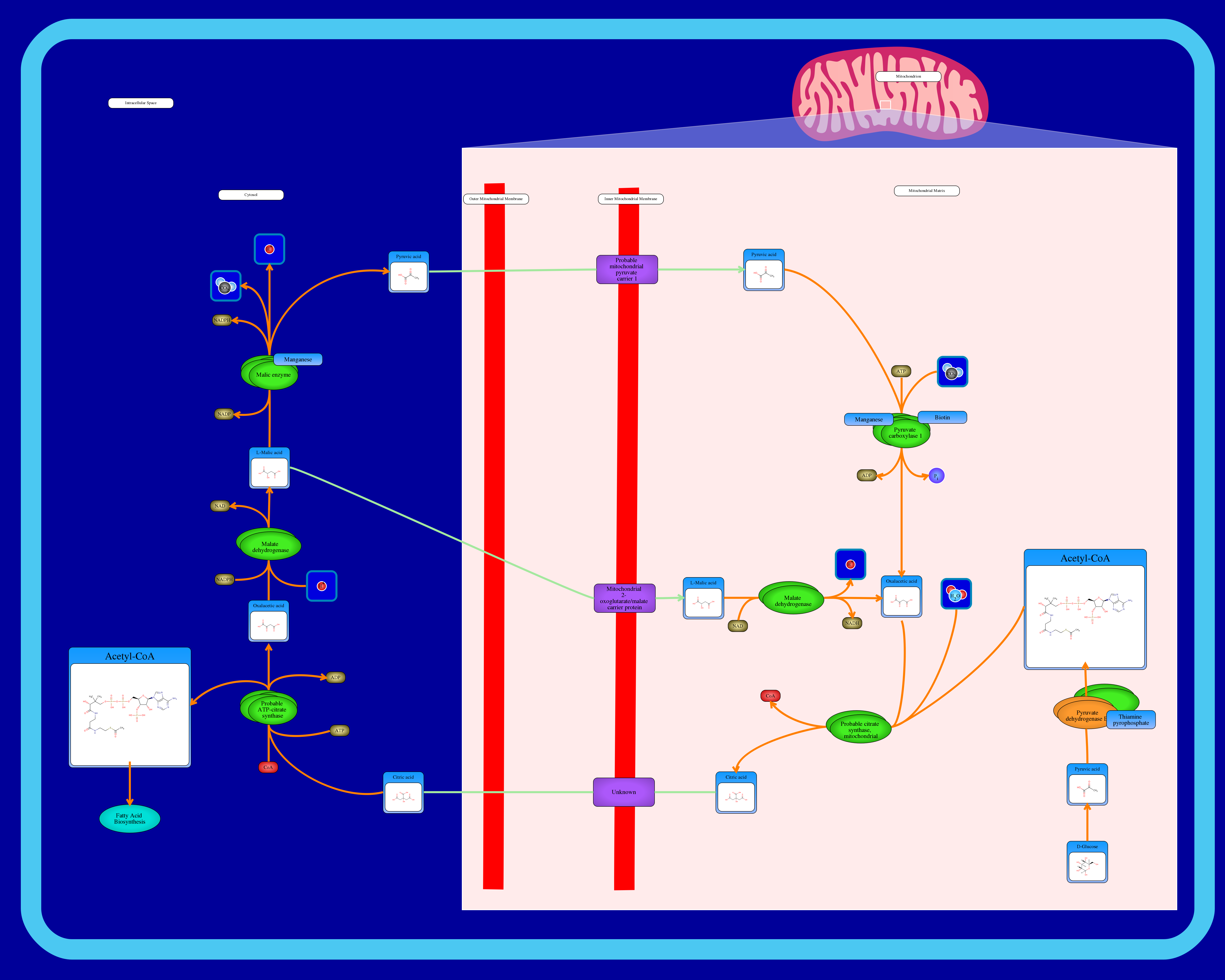 Acetyl-CoA is an important molecule, which is precursor to HMG CoA, which is a vital component in cholesterol and ketone synthesis. Acetyl CoA participates in the biosynthesis of fatty acids and sterols, in the oxidation of fatty acids and in the metabolism of many amino acids. It also acts as a biological acetylating agent. Acetyl-CoA is made in the mitochondria by metabolizing fatty acids, and the oxidation of pyruvate of acetyl-CoA. When the body has an excess of ATP, the energy in acetyl-Coa can be stored in the form of fatty acids. Acetyl-CoA must cross the mitochondrial membrane to the cytosol, where fatty acid synthesis takes place. Acetyl-CoA is combined with oxalacetic acid by the enzyme citrate synthase, creating citric acid. Citric acid is then transported out of the mitochondria, to the cytosol, where the enzyme citrate lyase converts citric acid back into acetyl-CoA and oxalacetic acid. Malate dehydrogenase reduces oxalacetic acid to malate, which then is either transported back into the mitochondria by the malate-alpha ketoglutarate transporter or oxidized to pyruvate by malic enzyme. Pyruvate can then be transported back into the mitochondria and undergo decarboxylation into oxalacetic acid. Malate can also be used to create NADH by the conversion of malate to oxalacetic acid by malate dehydrogenase.