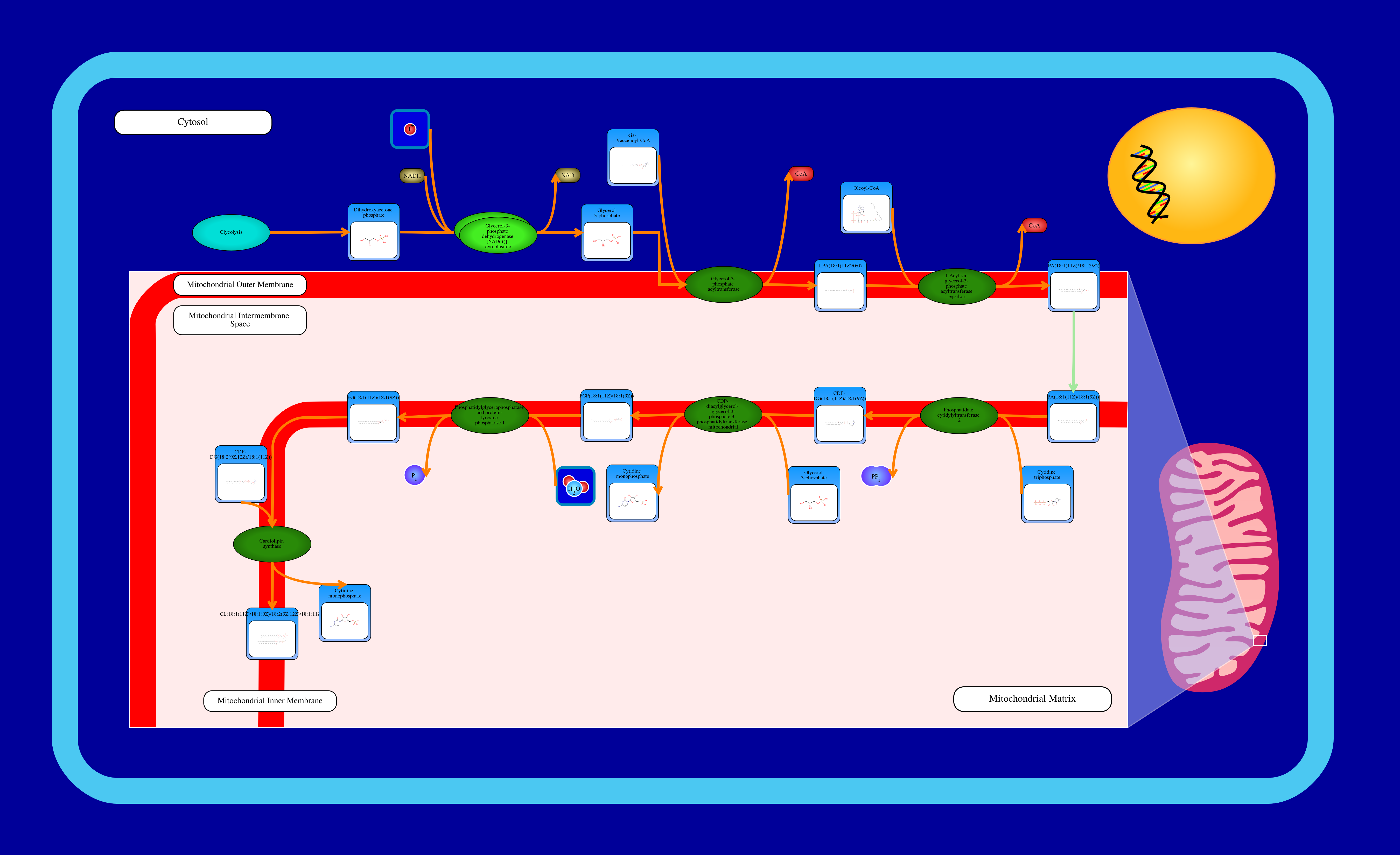 Cardiolipin (CL) is an important component of the inner mitochondrial membrane where it constitutes about 20% of the total lipid composition. It is essential for the optimal function of numerous enzymes that are involved in mitochondrial energy metabolism (Wikipedia). Cardiolipin biosynthesis occurs mainly in the mitochondria, but there also exists an alternative synthesis route for CDP-diacylglycerol that takes place in the endoplasmic reticulum. This second route may supplement this pathway. All membrane-localized enzymes are coloured dark green in the image. First, dihydroxyacetone phosphate (or glycerone phosphate) from glycolysis is used by the cytosolic enzyme glycerol-3-phosphate dehydrogenase [NAD(+)] to synthesize sn-glycerol 3-phosphate. Second, the mitochondrial outer membrane enzyme glycerol-3-phosphate acyltransferase esterifies an acyl-group to the sn-1 position of sn-glycerol 3-phosphate to form 1-acyl-sn-glycerol 3-phosphate (lysophosphatidic acid or LPA). Third, the enzyme 1-acyl-sn-glycerol-3-phosphate acyltransferase converts LPA into phosphatidic acid (PA or 1,2-diacyl-sn-glycerol 3-phosphate) by esterifying an acyl-group to the sn-2 position of the glycerol backbone. PA is then transferred to the inner mitochondrial membrane to continue cardiolipin synthesis. Fourth, magnesium-dependent phosphatidate cytidylyltransferase catalyzes the conversion of PA into CDP-diacylglycerol. Fifth, CDP-diacylglycerol--glycerol-3-phosphate 3-phosphatidyltransferase synthesizes phosphatidylglycerophosphate (PGP). Sixth, phosphatidylglycerophosphatase and protein-tyrosine phosphatase dephosphorylates PGP to form phosphatidylglycerol (PG). Last, cardiolipin synthase catalyzes the synthesis of cardiolipin by transferring a phosphatidyl group from a second CDP-diacylglycerol to PG. It requires a divalent metal cation cofactor.