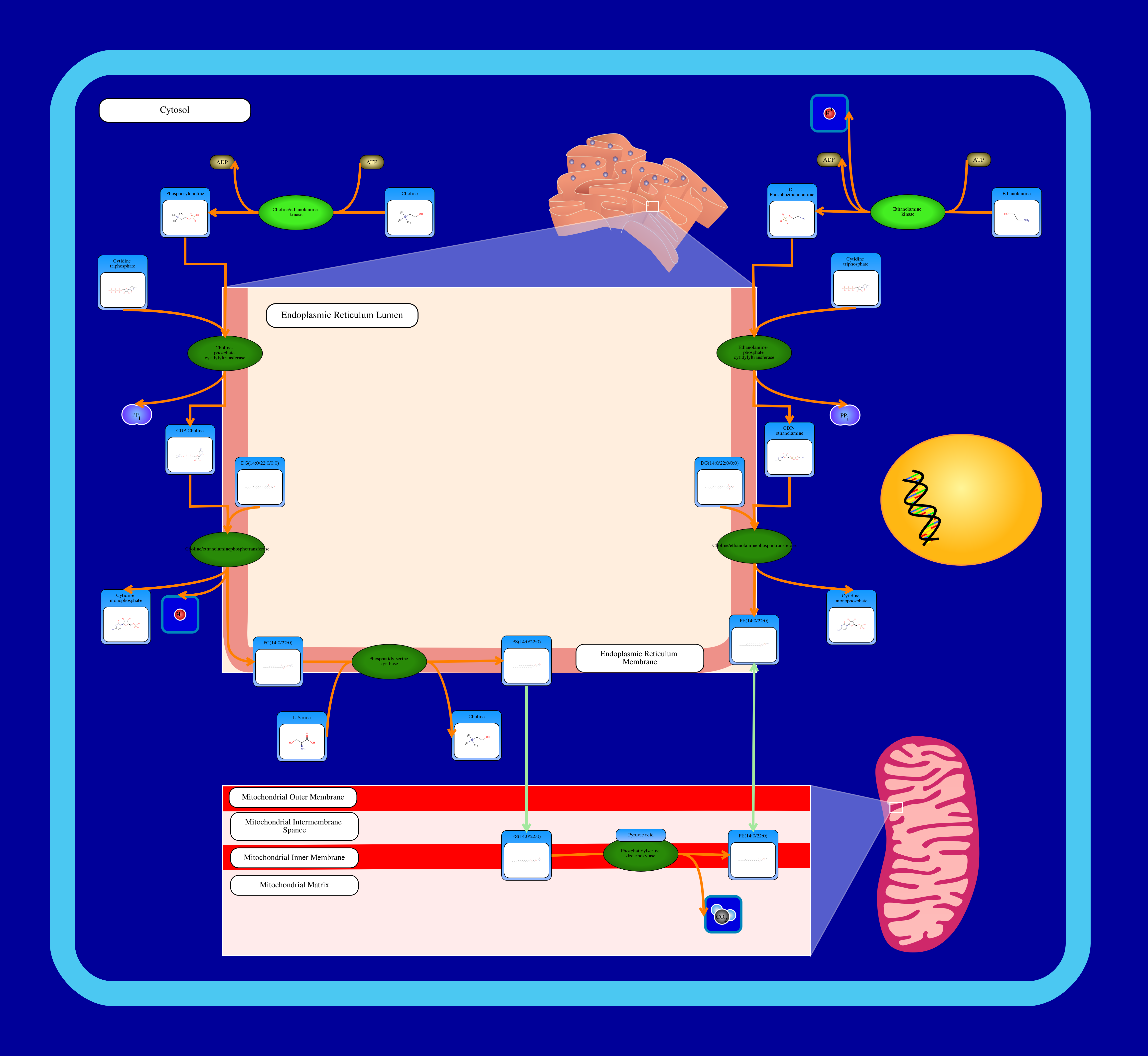 Phosphatidylcholines (PC) are a class of phospholipids that incorporate a phosphocholine headgroup into a diacylglycerol backbone. They are the most abundant phospholipid in eukaryotic cell membranes and has both structural and signalling roles. In eukaryotes, there exist two phosphatidylcholine biosynthesis pathways: the Kennedy pathway and the methylation pathway. The Kennedy pathway begins with the direct phosphorylation of free choline into phosphocholine followed by conversion into CDP-choline and subsequently phosphatidylcholine. It is the major synthesis route in animals. In the visualization, all enzymes that are dark green in colour are membrane-localized. The first reaction of the Kennedy pathway involves the cytosol-localized enzyme choline/ethanolamine kinase catalyzing the conversion of choline into phosphocholine. Second, choline-phosphate cytidylyltransferase, localized to the endoplasmic reticulum membrane, catalyzes the conversion of phosphocholine to CDP-choline. Last, choline/ethanolaminephosphotransferase catalyzes phosphatidylcholine biosynthesis from CDP-choline. A parallel Kennedy pathway forms phosphatidylethanolamine from ethanolamine. Phosphatidylethanolamines (PE) are a class of phospholipids that incorporate a phosphoric acid headgroup into a diacylglycerol backbone. They are the second most abundant phospholipid in eukaryotic cell membranes, and contrary to phosphatidylcholine, they are concentrated with phosphatidylserine in the cell membrane's inner leaflet. Phosphatidylethanolamine is also synthesized from phosphatidylserine at the mitochondrial inner membrane by phosphatidylserine decarboxylase. Phosphatidylserine, itself, is synthesized using a base-exchange reaction with phosphatidylcholine. This reaction is catalyzed by phosphatidylserine synthase which is located in the endoplasmic reticulum membrane.