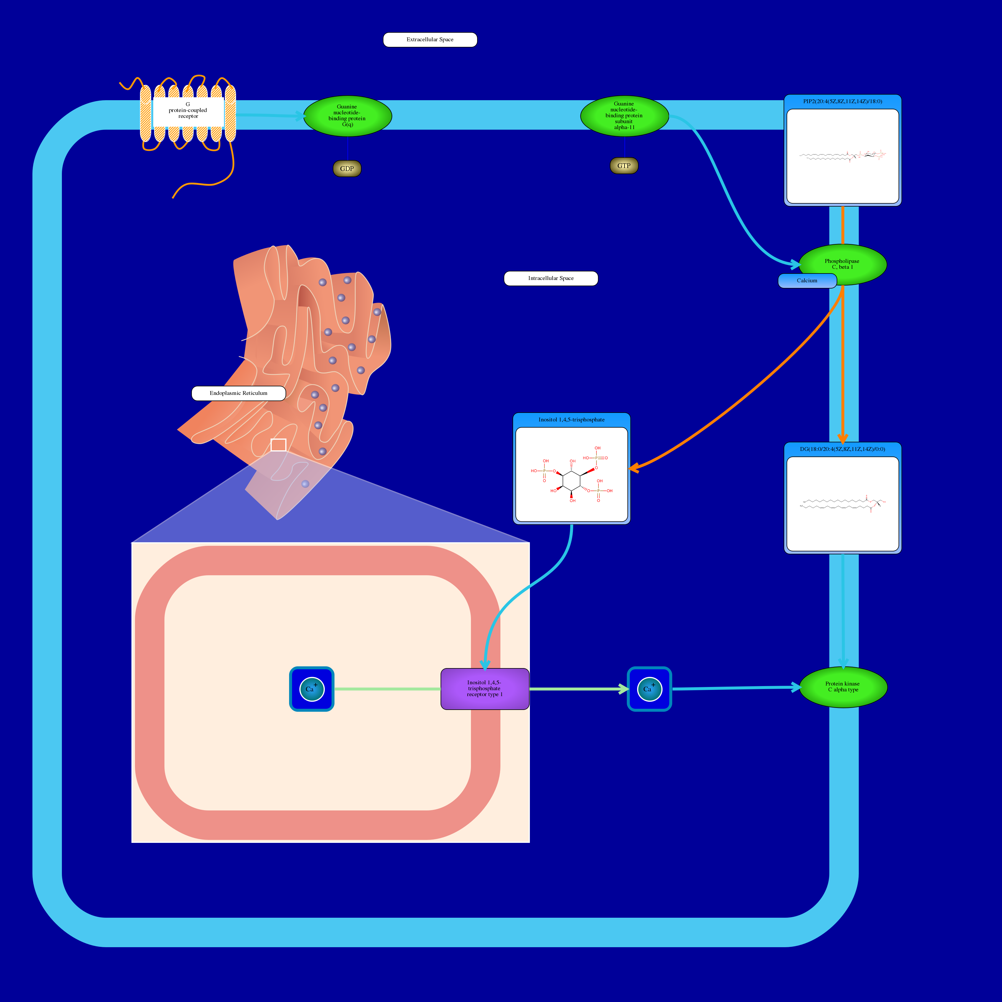 G protein-coupled receptors sense stimuli outside the cell and transmit signals across the plasma membrane. Activation of protein kinase C (PKC) is one of the common signaling pathways. When a class of GPCRs are activated by a ligand, they activate Gq protein to bind GTP instead of GDP. After the Gq becomes active, it activates phospholipase C (PLC) to cleave the membrane lipid phosphatidylinositol 4,5-bisphosphate (PIP2) into inositol 1,4,5-trisphosphate (IP3) and diacyl glycerol (DAG). IP3 can bind Ins3P receptor to open calcium channel by diffusion from cytoplasm to ER. Activated calcium channel will release the calcium from ER into cytoplasm. Calcium can activate the kinase activity of PKC.