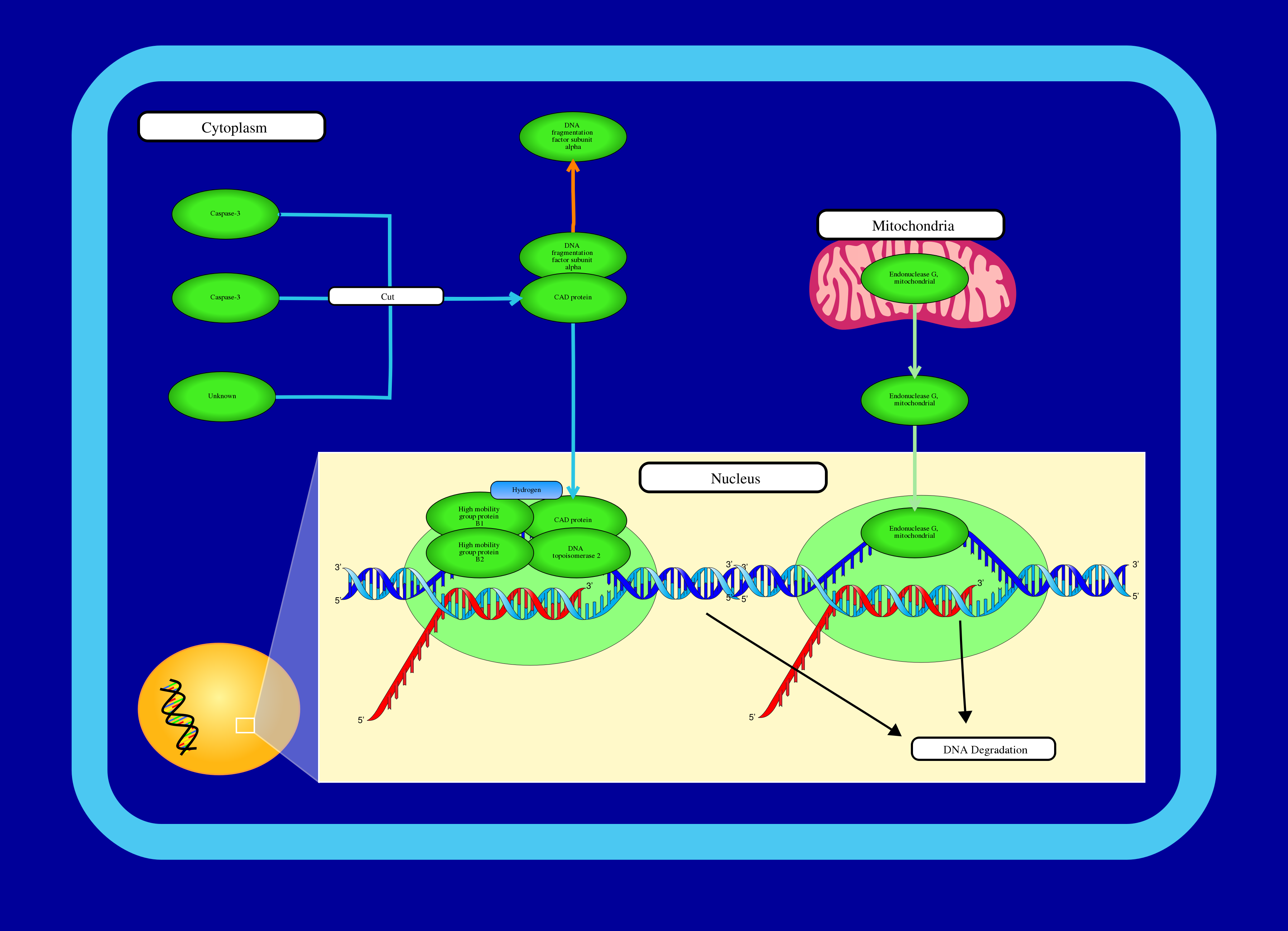 Apoptotic endonucleases degrade chromosomal DNA during programmed cell death. ICAD and CAD exist in the nucleus in normal cells and is a major endonuclease in apoptosis. Its activation is normally caspase dependent. EndoG resides in mitochondria in normal cells and travels to the nucleus, where it fragments chromosomal DNA upon activation of apoptosis. Once released from the mitochondrial intermembrane space, EndoG activity is caspase independent.