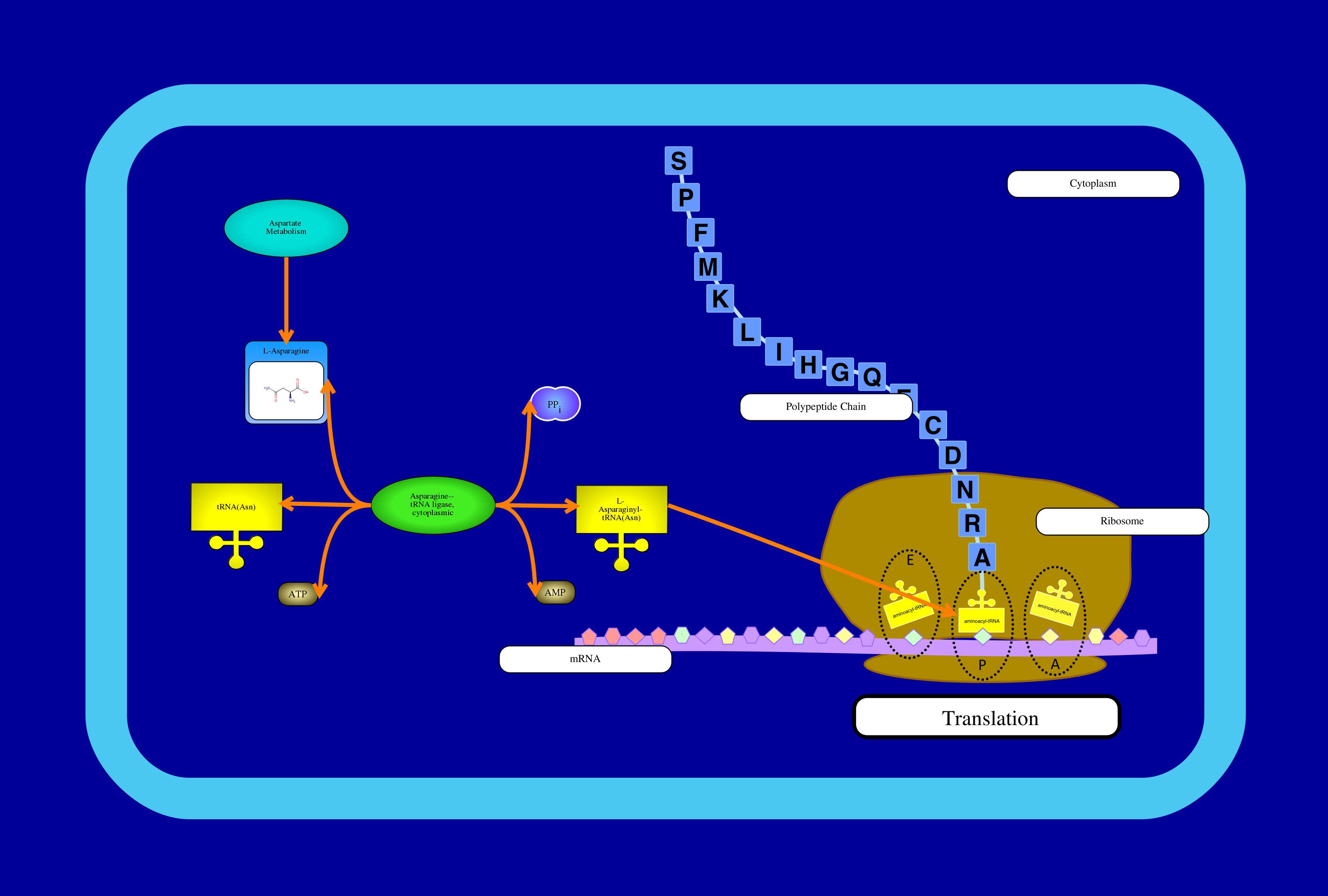 Protein synthesis is an essential life process that builds the important large amino acid macromolecules that function as enzymes, antibodies, and cellular structural components. Although synthesis begins with the transcription of DNA into RNA, this pathway depicts the reactions that occur during translation. Transcribed messenger RNA (mRNA), which contains the genetic code to direct protein synthesis, is transported out of the nucleus and becomes bound to ribosomes in the cytoplasm or endoplasmic reticulum. The amino acids required to assemble polypeptide chains are delivered to the ribosomes using transfer RNA (tRNA). Each tRNA molecule has both a binding site for a specific amino acid and a three-nucleotide sequence called the anticodon that forms three complementary base pairs with an mRNA codon. Charging or loading the appropriate amino acid onto its tRNA is carried out by an aminoacyl-tRNA synthetase (aaRS or ARS), also called tRNA-ligase. This enzyme catalyzes the esterification of an amino acid to one of all its compatible tRNAs to form an aminoacyl-tRNA. Each of the twenty amino acids has a corresponding aa-tRNA made by a specific aminoacyl-tRNA synthetase. Ribosomes match the anticodons of the charged tRNA molecules with successive codons of the mRNA. After a match is found, the ribosome transfers the amino acid from the matching tRNA onto the growing peptide chain via a reaction termed peptide condensation, and the tRNAs, no longer carrying amino acids, are released.