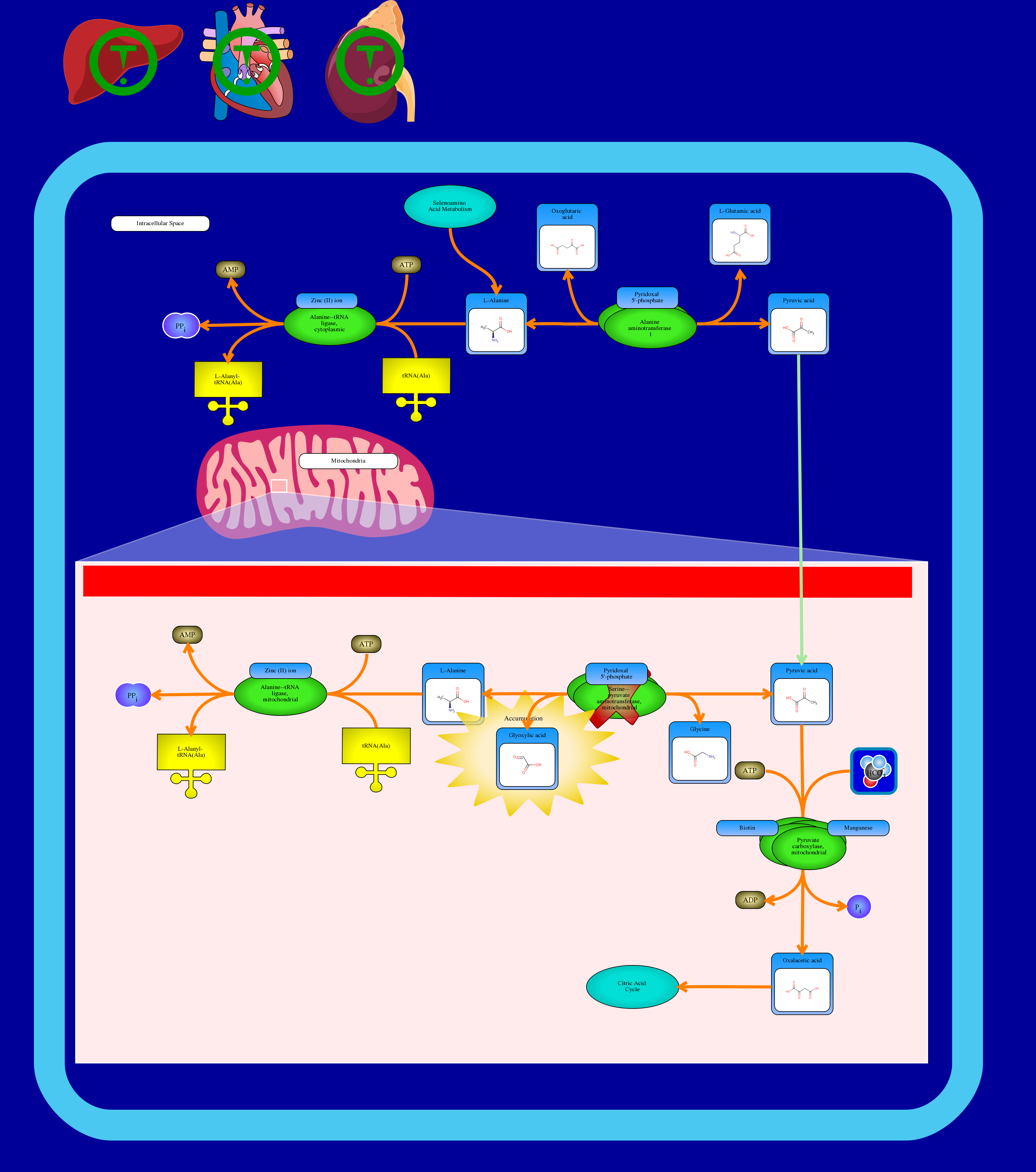Enter relative concentration values (without units). Elements will be highlighted in a color gradient where red = lowest concentration and green = highest concentration. For the best results, view the pathway in Black and White.