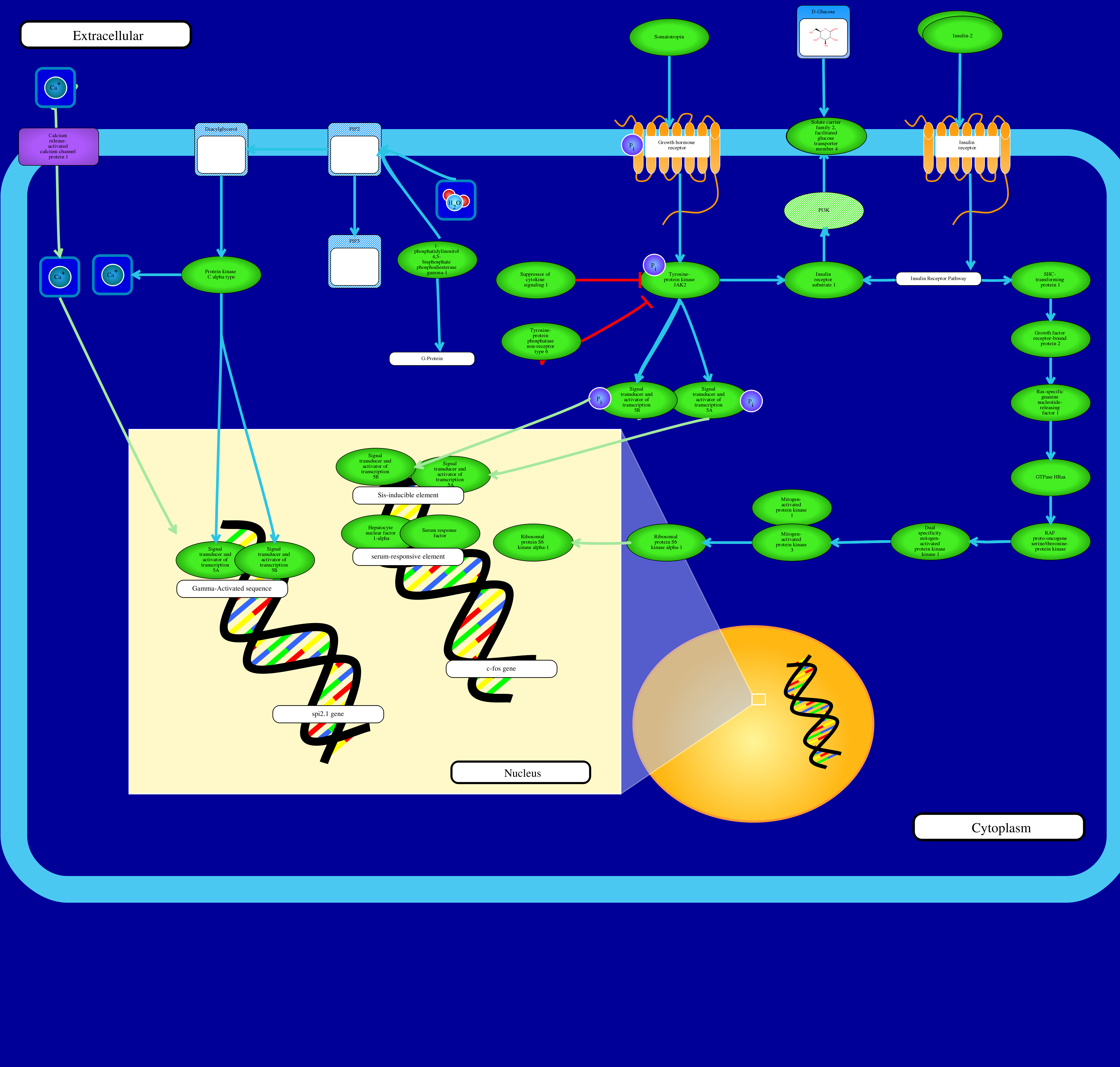 Growth hormone is the hormone primarily responsible for body growth. Growth hormone (GH) binds membrane-bound growth hormone receptor (GHR) to activate and enhance the binding of JAK2. This stimulates phosphorylation of JAK2 and GHR. JAK2 initiates GH signal transduction. This activation initiates multiple signalling pathways: STAT transcription factors, activation of kinases, and insulin receptor pathways. GH stimulates Signal Transducer and Activator of Transcription (STAT) and its binding to Sis-inducible elements of the c-fos promoter. C-fos expression has input from multiple pathways. The serum response element binds serum response factors and other complex transcription factors regulated by GH via the MEK/ERK pathway. STAT 5 is also involved in the synthesis of many GH-sensitive genes. STAT proteins are phosphorylated and then released from the GH/JAK2 complex. Once released, they become dimers and move to the nucleus to bind binding sites in GH-regulated genes. STAT proteins may also dimerize with other transcription factors to regulate transcription. GH can stimulate glucose transport in the cell through JAK2 stimulation of IRS proteins that recruit PI3K to regulate glucose transport.