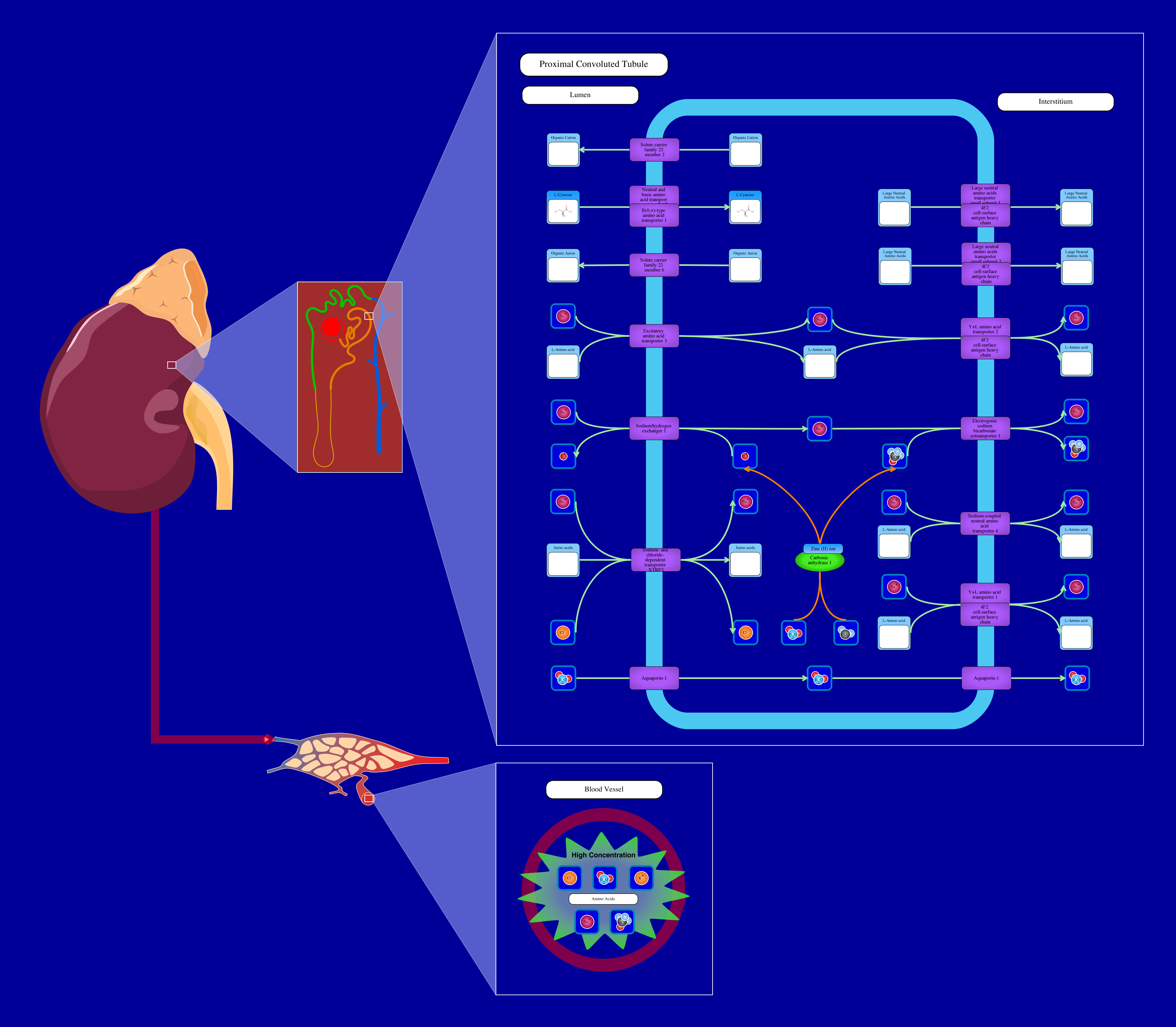 The proximal convoluted tubule is part of the nephron between the Bowman's capsule and the loop of Henle. The proximal convoluted tubule functions to reabsorb sodium, water, and other ions. Sodium and bicarbonate (hydrogen carbonate) are transported by a co-transporter that is responsible for the majority of sodium reabsorption. The bicarbonate, along with hydrogen, are exchanged across the basal and apical membranes, respectively, to effectively regulate the pH of the filtrate.  In addition, chloride ions are not normally reabsorbed in large amounts at the proximal tubule compared to other parts of the nephron.  However, the reabsorption of chloride, as well as potassium, increases as the amount of water reabsorption increases due to solvent drag (also known as bulk transport).  This occurrence explains solute movement secondary to water flow.  All the cation and anion transport creates a gradient favourable for ion and water reabsorption, leading to an increase in blood pressure.