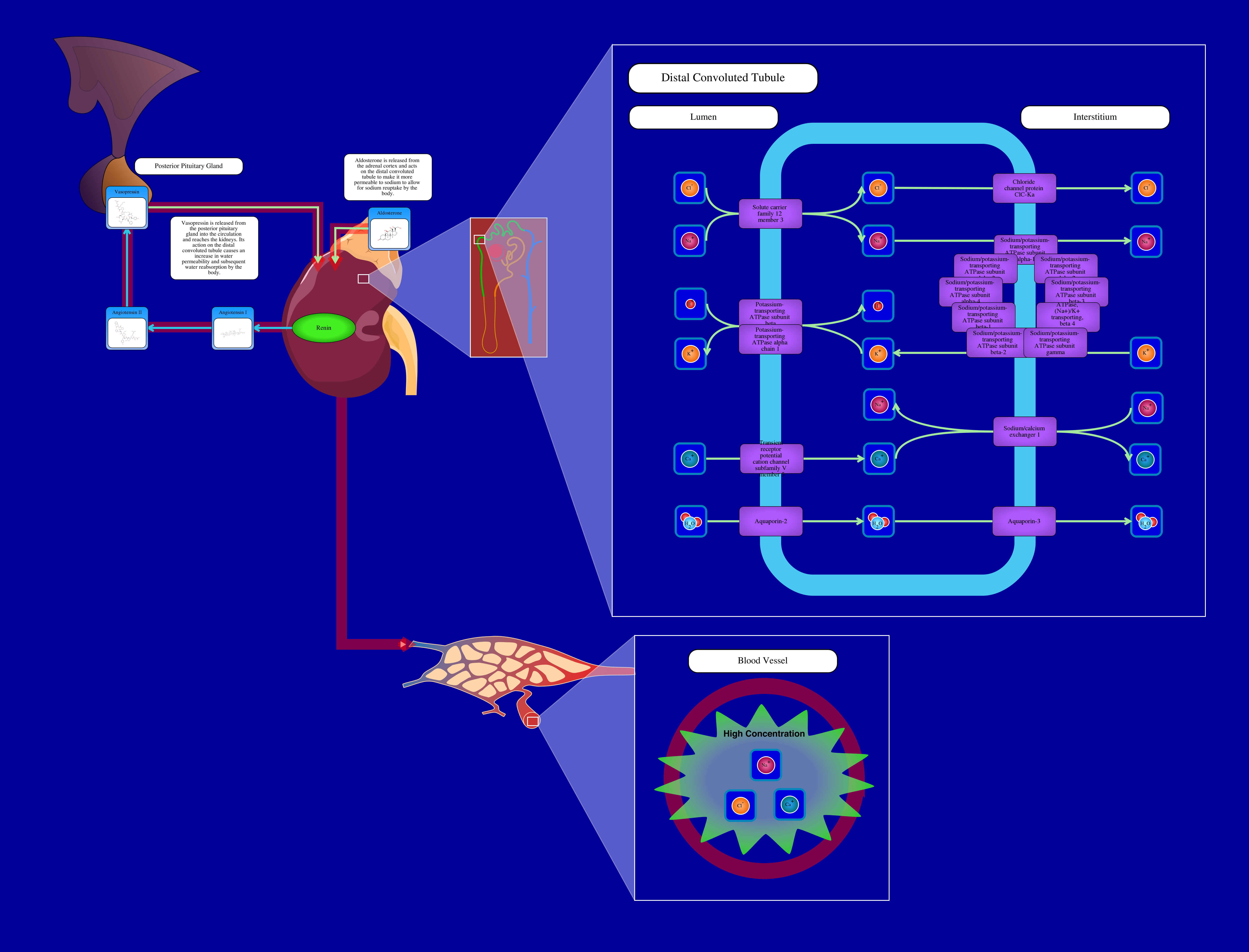 The distal convoluted tubule of the nephron is the part of the kidney between the loop of henle and the collecting duct. When renin is released from the kidneys, it causes the activation of angiotensin I in the blood circulation which is cleaved to become angiotensin II. Angiotensin II stimulates the release of aldosterone from the adrenal cortex and release of vasopressin from the posterior pituitary gland. When in the circulation, vasopressin eventually binds to receptors on epithelial cells in the distal convoluted tubule. This causes vesicles that contain aquaporins to fuse with the plasma membrane. Aquaporins are proteins that act as water channels once they have bound to the plasma membrane. As a result, the permeability of the distal convoluted tubule changes to allow for water reabsorption back into the blood circulation. In addition, sodium, chlorine, and calcium are also reabsorbed back into the systemic circulation via their respective channels and exchangers. However, aldosterone is a major regulator of the reabsorption of these ions as well, as it changes the permeability of the distal convoluted tubule to these ions. As a result, a high concentration of sodium, chlorine, and calcium in the blood vessels occurs. The reabsorption of ions and water increases blood fluid volume and blood pressure.