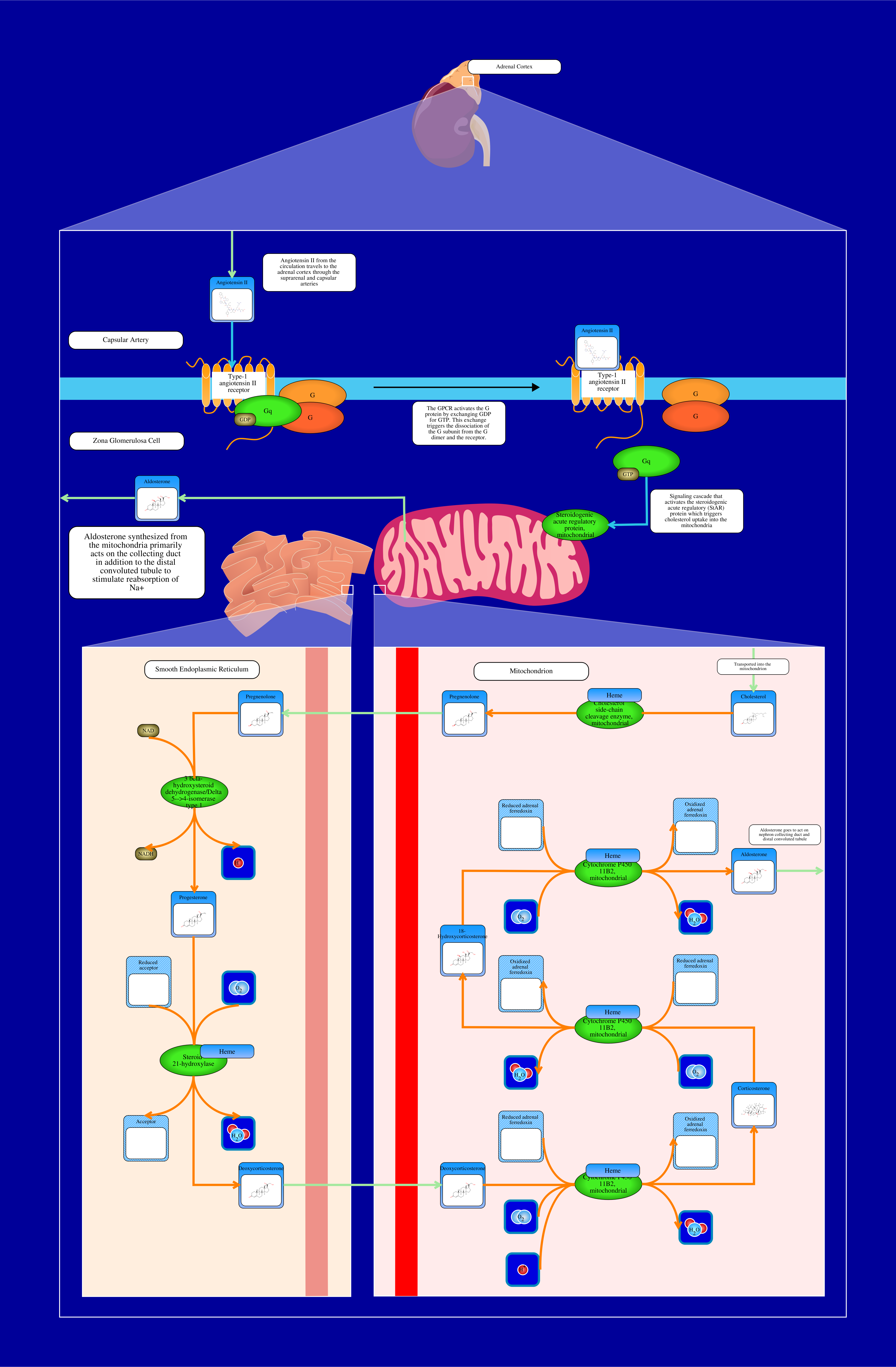 Aldosterone is a hormone produced in the zona glomerulosa of the adrenal cortex. It's function is to act on the distal convoluted tubule and the collecting duct of the nephron to make them more permeable to sodium to allow for its reuptake (in addition to allowing potassium wasting). As a result, water follows the sodium back into the body. The water retention contributes to an increased blood volume. Angiotensin II from the circulation binds to receptors on the zona glomerulosa cell membrane, activating the G protein and triggering a signaling cascade. The end result is the activation of the steroidogenic acute regulatory (StAR) protein that permits cholesterol uptake into the mitochondria. From there, cholesterol undergoes a series of reactions in both the mitochondrion and the smooth endoplasmic reticulum (steroidogenesis) where it finally becomes aldosterone.