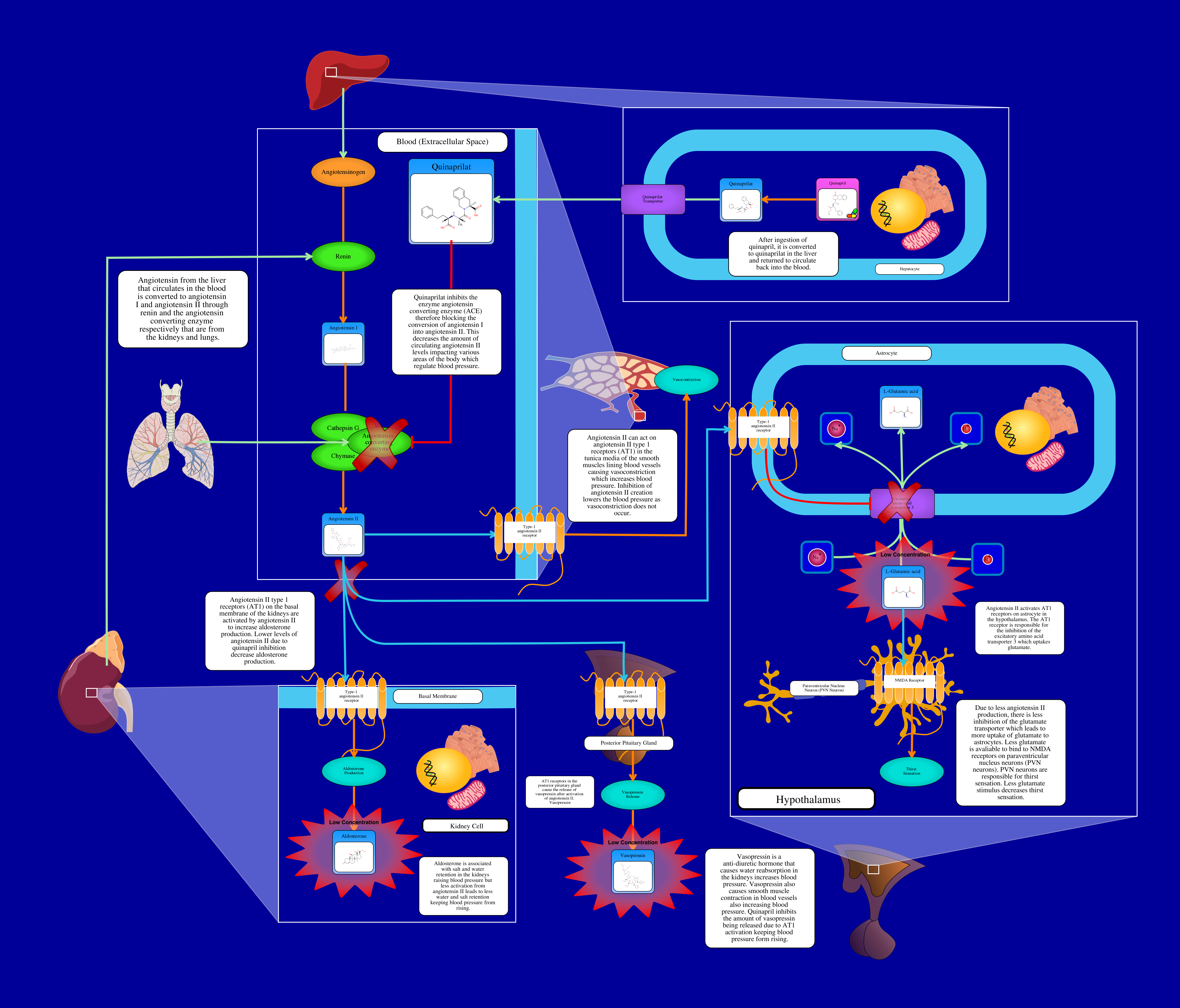 Quinapril is angiotensin-converting enzyme (ACE) inhibitor for the conversion of angiotensin I into angiotensin II. Angiotensin II is a critical circulating peptide hormone that has powerful vasoconstrictive effects and increases blood pressure. Quinapril is used to treat hypertension, high blood pressure, congestive heart failure, and chronic renal failure as it decreases blood pressure. Quinapril is converted into Quinaprilat through the liver after being ingested which travels in the blood to inhibit ACE which is from the lungs. Angiotensin has many vasoconstrictive effects by binding to angiotensin II type 1 receptor (AT1) in blood vessels, kidneys, hypothalamus, and posterior pituitary. In blood vessels, AT1 receptors cause vasoconstriction in the tunica media layer of smooth muscle surrounding blood vessels increasing blood pressure. Less angiotensin II that is circulating lowers the constriction of these blood vessels. AT1 receptors in the kidney are responsible for the production of aldosterone which increases salt and water retention which increases blood volume. Less angiotensin II reduces aldosterone production allowing water retention to not increase. AT1 receptors in the hypothalamus are on astrocytes which inhibit the excitatory amino acid transporter 3 from up-taking glutamate back into astrocytes. Glutamate is responsible for the activation of NMDA receptors on paraventricular nucleus neurons (PVN neurons) that lead to thirst sensation. Since angiotensin II levels are lowered, the inhibition of the uptake transporter is not limited decreasing the amount of glutamate activating NMDA on PVN neurons that make the individual crave drinking less. This lowers the blood volume as well. Lastly, the AT1 receptors on posterior pituitary gland are responsible for the release of vasopressin. Vasopressin is an anti-diuretic hormone that cases water reabsorption in the kidney as well as causing smooth muscle contraction in blood vessels increasing blood pressure. Less angiotensin II activating vasopressin release inhibits blood pressure from increasing. Overall, Quinapril inhibits the conversion of angiotensin I into angiotensin II, a powerful vasoconstrictor and mediator of high blood pressure so decreasing levels of angiotensin will help reduce blood pressure from climbing in individuals.
