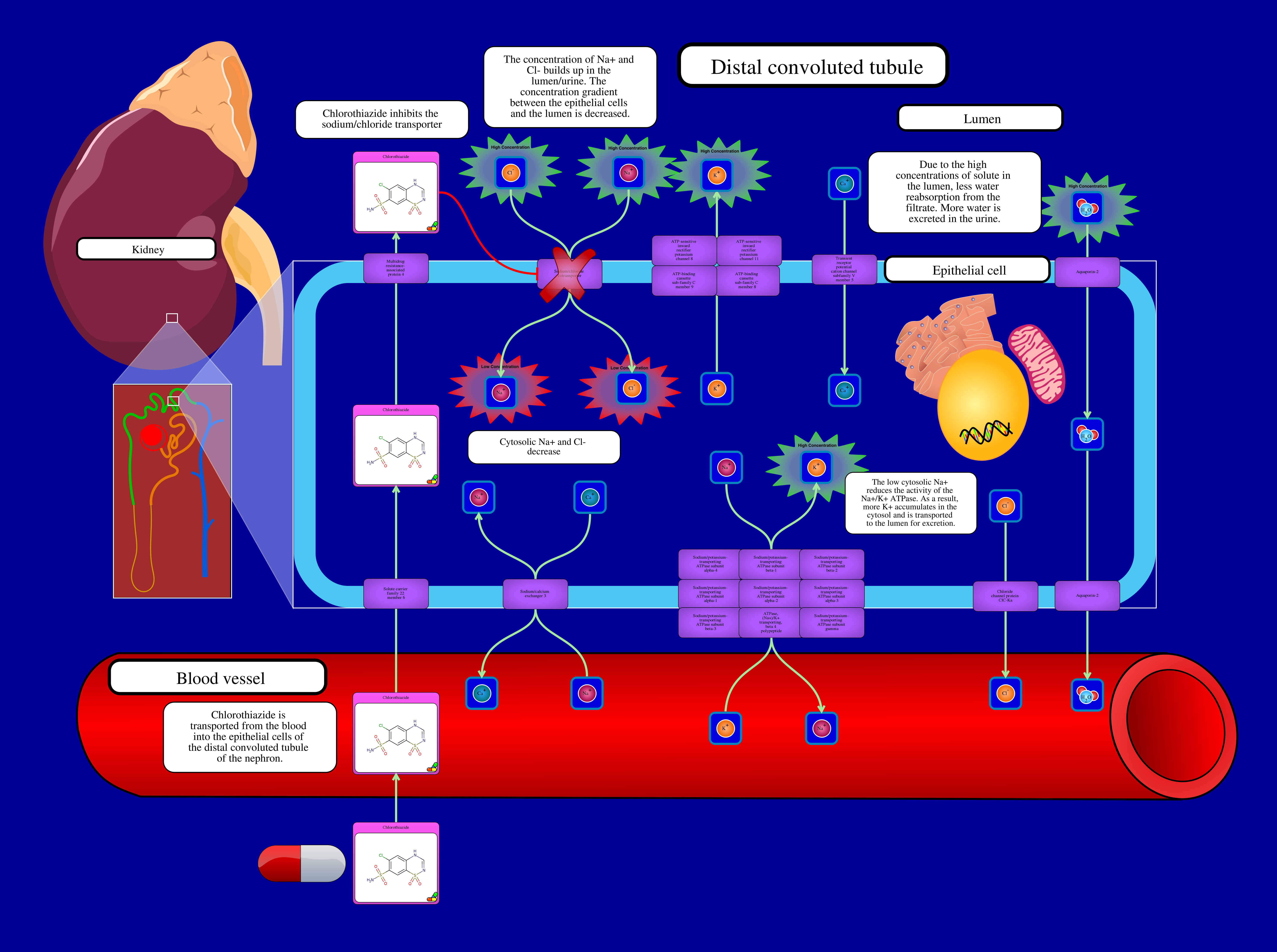 Chlorothiazide is an oral diuretic drug which acts in the kidney, specifically in the distal convoluted tubule of the nephron. It is used as adjunctive therapy in edema associated with congestive heart failure, hepatic cirrhosis, and corticosteroid and estrogen therapy. It is also indicated in the management of hypertension either as the sole therapeutic agent or to enhance the effectiveness of other antihypertensive drugs in the more severe forms of hypertension. In the distal convoluted tubule (DCT), the regulation of ions such as sodium, potassium, calcium, chloride and magnesium occurs. In epithelial cells of the DCT, the basolateral membrane consists of the Na+/K+ ATPase, which pumps Na+ into the interstitium-blood area and K+ into the epithelial cell; the Na+/Ca2+ exchanger, which pumps Na+ into the cell and Ca2+ into the interstitium-blood; and the chloride transporter which transports chloride into the interstitium-blood. The apical membrane contains a calcium channel that transports calcium from the lumen into the epithelial cell, a potassium channel that transports K+ out of the epithelial cell, and a Na+/Cl- cotransporter which transports Na+ and Cl- into the epithelial cell. Chlorothiazide targets this Na+/Cl- cotransporter. Chlorothiazide is transported from the blood into the epithelial cells, then is transported into the urine through the multidrug-resistant associated protein-4. In the lumen it has access to the Na+/Cl- transporter and inhibits it preventing Na+ reabsorption. The inhibition of Na+ reabsorption results in a low cytosolic concentration of Na+ and increases the solute concentration of the lumen. This decreases the lumen-epithelial cell concentration gradient and as a result, less water would be reabsorbed from the urine. This effect is valued in conditions such as hypertension because it allows more water to be excreted in urine rather than be absorbed in the blood which increases blood volume. Side effects such as frequent urination, muscle spasms, blurred vision, constipation, diarrhea, vomiting, loss of appetite, and headache can occur from taking chlorothiazide. This drug is administered as an oral tablet or as an intravenous injection.