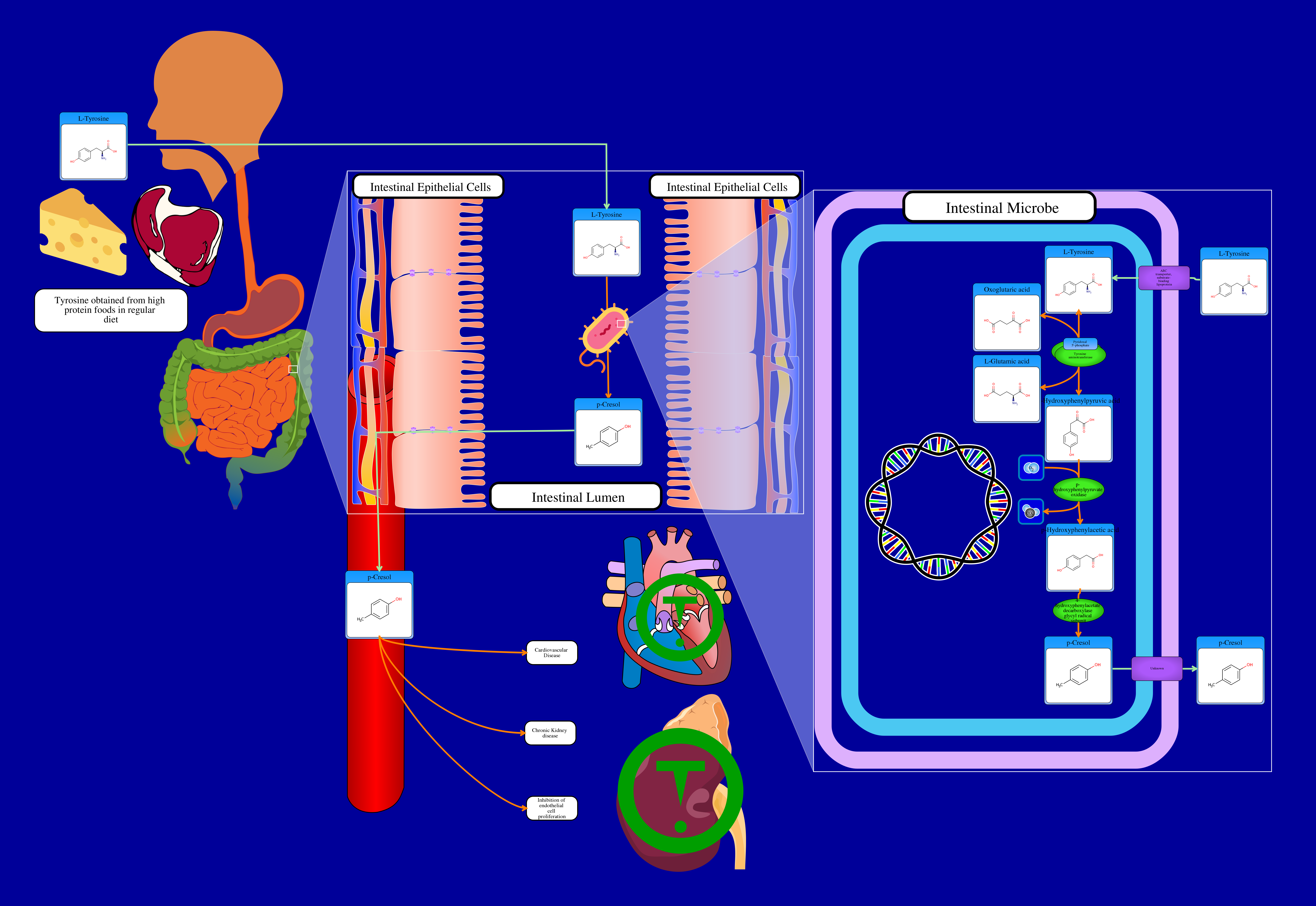 Para-cresol(P-cresol) is a phenolic compound that is formed through gut microbial metabolism from the amino acid tyrosine which is acquired from foods that are high in protein. After being transported into gut microbes, tyrosine undergoes reactions with the enzymes tyrosine transaminase, 4-hydroxyphenylpyruvate oxidase and 4-hydroxylphenylacetate decarboxylase to form para-cresol. Most of the p-cresol that is produced from the gut microbes then enters systemic circulation. P-cresol can then undergo sulfation or glucuronidation reactions in the liver to produce the uremic toxins p-cresyl sulfate and p-cresyl glucuronide respectively. However, P-cresol itself can also be a uremic toxin with widespread toxic effects on the body. P-cresol is shown to be associated with cardiovascular disease and it can also inhibit endothelial cell proliferation.