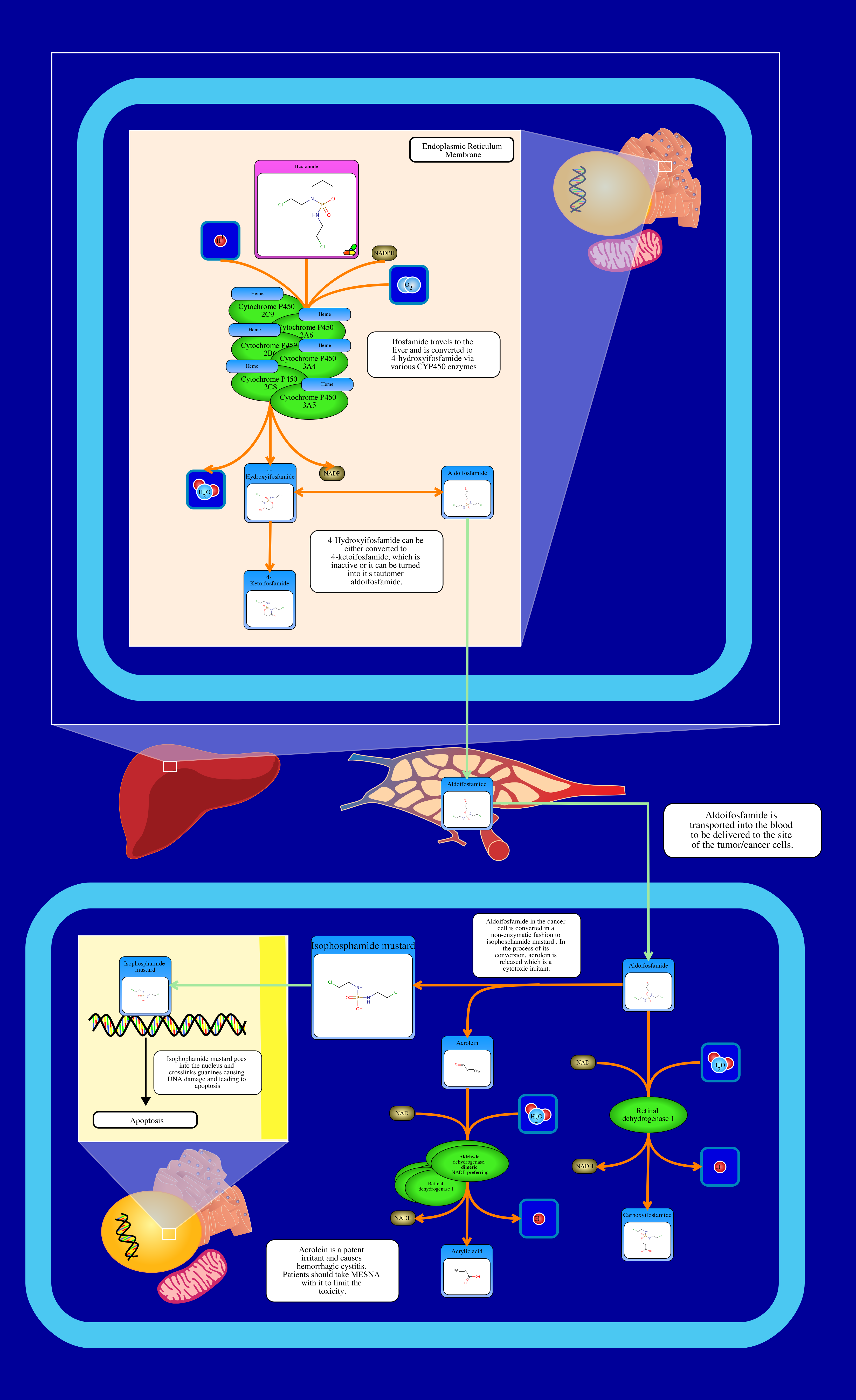 Ifosfamide is an alkylating agent administered intravenously that is used in chemotherapy against various cancers. It works by crosslink DNA guanine residues. Ifosfamide is converted into 4-hydroxyifosfamide through various hepatic CYP450. 4-Hydroxyifosfmamide can be converted to its tautomer aldophosphamide or to an inactive form 4-ketoifosfamide. Aldophosphamide is taken into cancer/tumor cells where it is converted to its cytotoxic form isophosphamide mustard which crosslinks the DNA after being converted to it's carbocation form. In the process of isophosphamide mustard production, acrolein is produced which is a potent lung irritant and causes hemorrhagic cystitis. Side effects of ifosfamide is myelosuppression, immunosuppression and hemorrhagic cystitis (caused by acrolein).