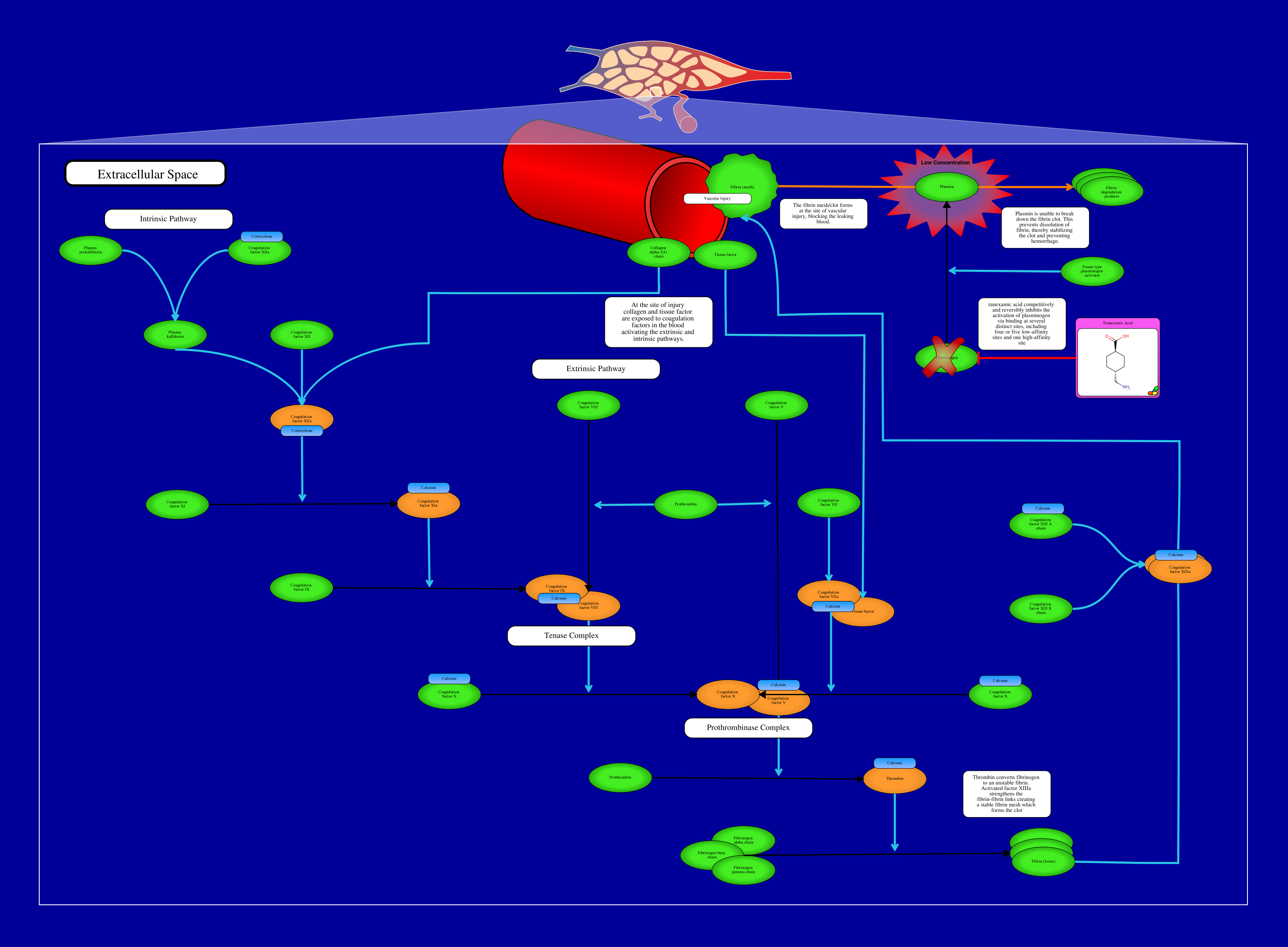 Tranexamic acid is a synthetic derivative of lysine used as an antifibrinolytic in the treatment and prevention of major bleeding. It targets plasminogen in blood vessels where these clots occur. The clotting process consists of two pathways, intrinsic and extrinsic, which converge to create stable fibrin which traps platelets and forms a hemostatic plug. The intrinsic pathway is activated by trauma inside the vasculature system, when there is exposed endothelial collagen. Endothelial collagen only becomes exposed when there is damage. The pathway starts with plasma kallikrein activating factor XII. The activated factor XIIa activates factor XI. Factor IX is then activated by factor XIa. Thrombin activates factor VIII and a Calicum-phospholipid-XIIa-VIIIa complex forms. This complex then activates factor X, the merging point of the two pathways. The extrinsic pathway is activated when external trauma causes blood to escape the vasculature system. Activation occurs through tissue factor released by endothelial cells after external damage. The tissue factor is a cellular receptor for factor VII. In the presence of calcium, the active site transitions and a TF-VIIa complex is formed. This complex aids in activation of factors IX and X. Factor V is activated by thrombin in the presence of calcium, then the activated factor Xa, in the presence of phospholipid, calcium and factor Va can convert prothrombin to thrombin. The extrinsic pathway occurs first, producing a small amount of thrombin, which then acts as a positive feedback on several components to increase the thrombin production. Thrombin converts fibrinogen to a loose, unstable fibrin and also activates factor XIII. Factors XIIIa strengthens the fibrin-fibrin and forms a stable, mesh fibrin which is essential for clot formation. The blood clot can be broken down by the enzyme plasmin. Plasmin is formed from plasminogen by tissue plasminogen activator. Tranexamic acid competitively and reversibly inhibits the activation of plasminogen via binding at several distinct sites, including four or five low-affinity sites and one high-affinity site. Plasmin is unable to be formed form plasminogen, and therefore, dissolution of the fibrin clot is prevented. Adverse effects such as seizures, headaches, backache, abdominal pain, nausea, vomiting, diarrhea, fatigue, pulmonary embolism, deep vein thrombosis, anaphylaxis, impaired color vision, and other visual disturbances can occur from the use of Tranexamic acid.