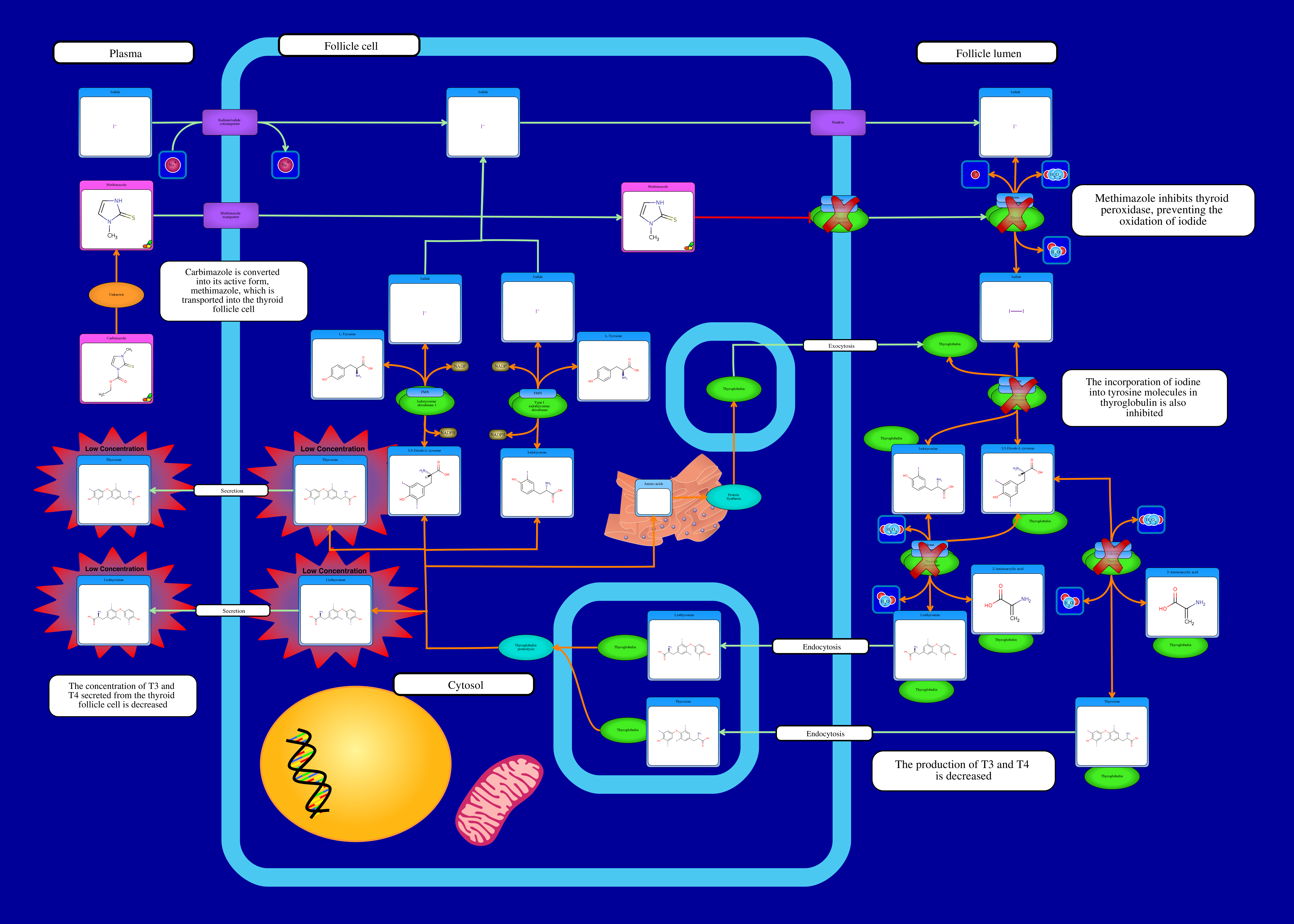 Carbimazole an imidazole antithyroid agent used for the treatment of hyperthyroidism and thyrotoxicosis. It is also used to prepare patients for thyroidectomy. Carbimazole is a prodrug, which is converted to methimazole in the gastrointestinal tract or after absorption into the blood. Methimazole enters the thyroid gland and is transported into thyroid follicle cells, where it inhibits the production of the thyroid hormones T3 (liothyronine) and T4 (thyroxine). Thyroid hormone synthesis begins with iodide being transported into the follicle cell, through the Na+/I- symporter, then into the follicle lumen through the pendrin transporter. Iodide is oxidized to iodine using thyroid peroxidase (TPO). TPO catalyzes the iodination of the tyrosine molecules in thyroglobulin to produce mono-iodinated tyrosine (MIT) and di-iodinated tyrosine (DIT). The thyroglobulin molecules enter the follicle lumen for this reaction via exocytosis. Coupling of MIT and DIT occurs, again using TPO. Coupling produces T3 and T4 molecules which are still attached to the thyroglobulin molecule. This complex goes through endocytosis to enter the follicle cell, where proteolysis of the thyroglobulin molecule occurs to release T3 and T4, amino acids, and MIT and DIT molecules which may not have been coupled. T3 and T4 are secreted from the thyroid gland into the blood where they can go exert their effects in other organs. The Amino acids can be used in protein synthesis to produce more thyroglobulin molecules, and MIT and DIT are metabolized by iodotyrosine deiodinase I, to produce iodide and tyrosine which can be recycled to be used in process of thyroid hormone synthesis again. Methimazole inhibits TPO, preventing iodide oxidation, the incorporation of iodine into tyrosine molecules and coupling of MIT and DIT, as a result, the production of T3 and T4 is decreased and less T3 and T4 are secreted from the follicle cell, reducing the concentration of thyroid hormones in the blood. Common side effects from taking carbimazole may include nausea, vomiting, diarrhea, dizziness, headaches, painful joints, itchy skin, rash and thinning hair. Serious side effects may include neutropenia, acute pancreatitis, liver damage, infections and hypoglycemia.